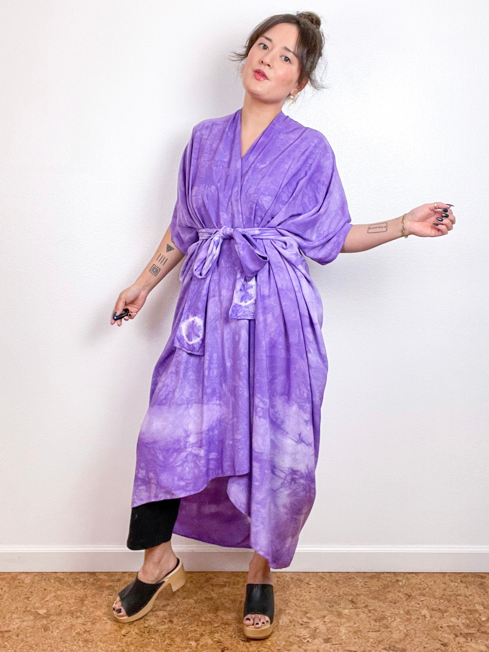 Soft and airy kimono with a flowing silhouette, tulip sleeve detail, curved high low hem and optional waist tie. Versatile shape can be styled as a wrap dress, lightweight jacket over jeans, or an elegant robe over lingerie. The minimalist design created from a full rectangle of fabric drapes beautifully over the shoulders and produces no material waste by utilizing one whole piece of fabric without scraps from corners and irregular cuts. Lightweight woven fabric is hand-dyed with a placed circle pattern in a low water variegated orchid purple color.
