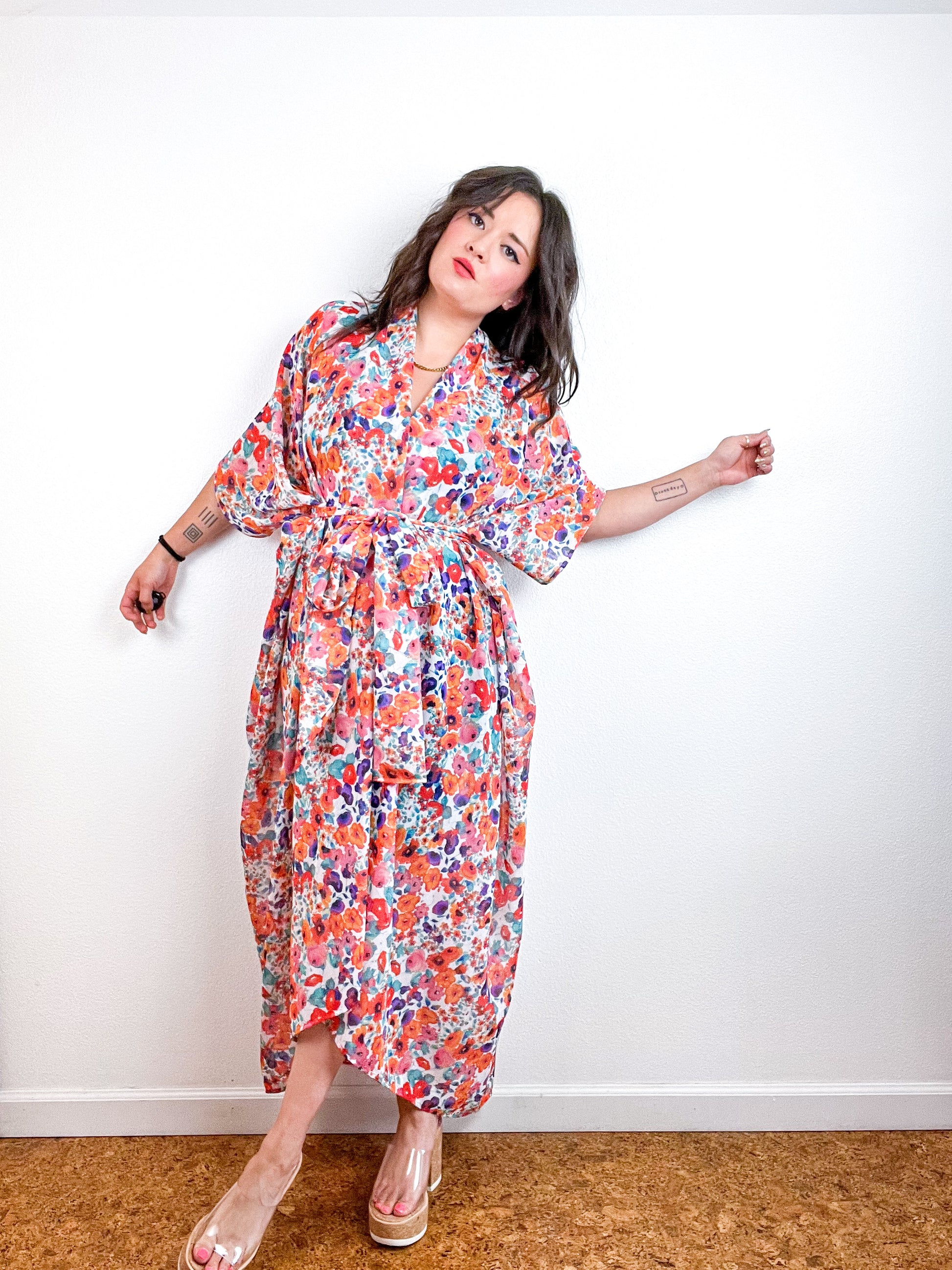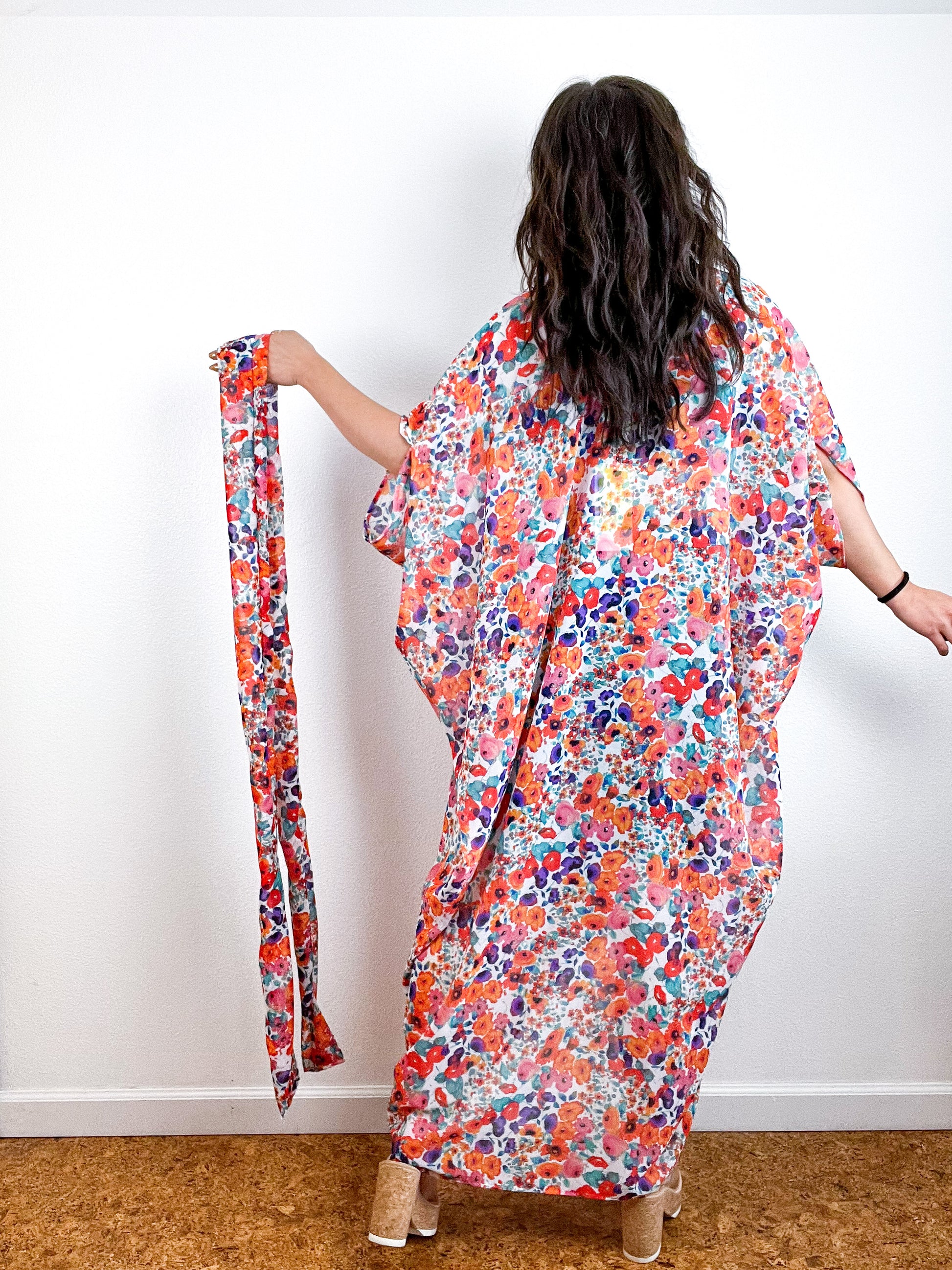 Light and airy kimono with a flowing silhouette, selvage sleeve detail, curved high low hem and optional waist tie. Versatile shape can be styled as a wrap dress, lightweight open layer, swimsuit coverup, or an elegant robe over lingerie. The minimalist design created from a full rectangle of fabric drapes beautifully over the shoulders and produces little to no material waste by utilizing one whole piece of fabric without scraps from corners and irregular cuts. Coral, purple, aqua mini floral print chiffon fabric with a gorgeous sheer drape and smooth surface.