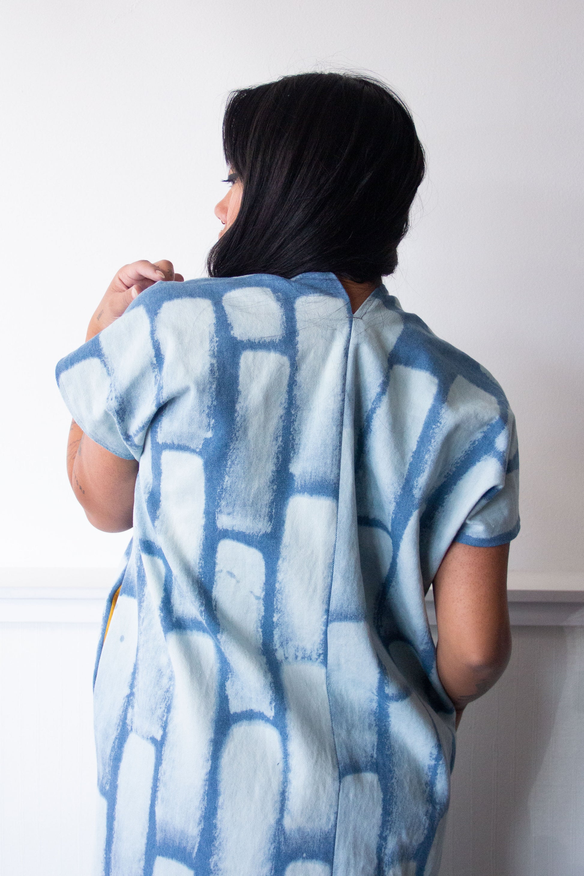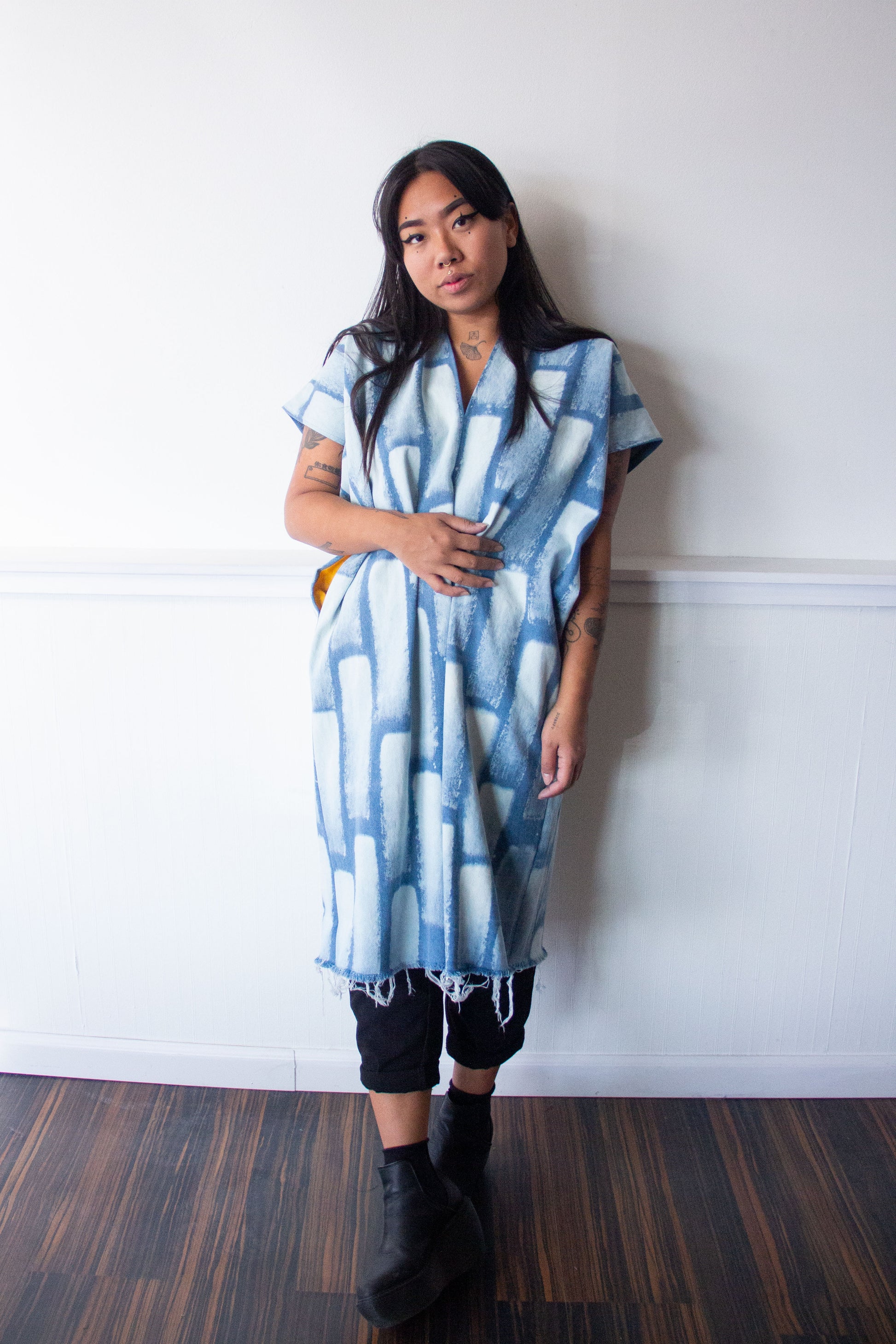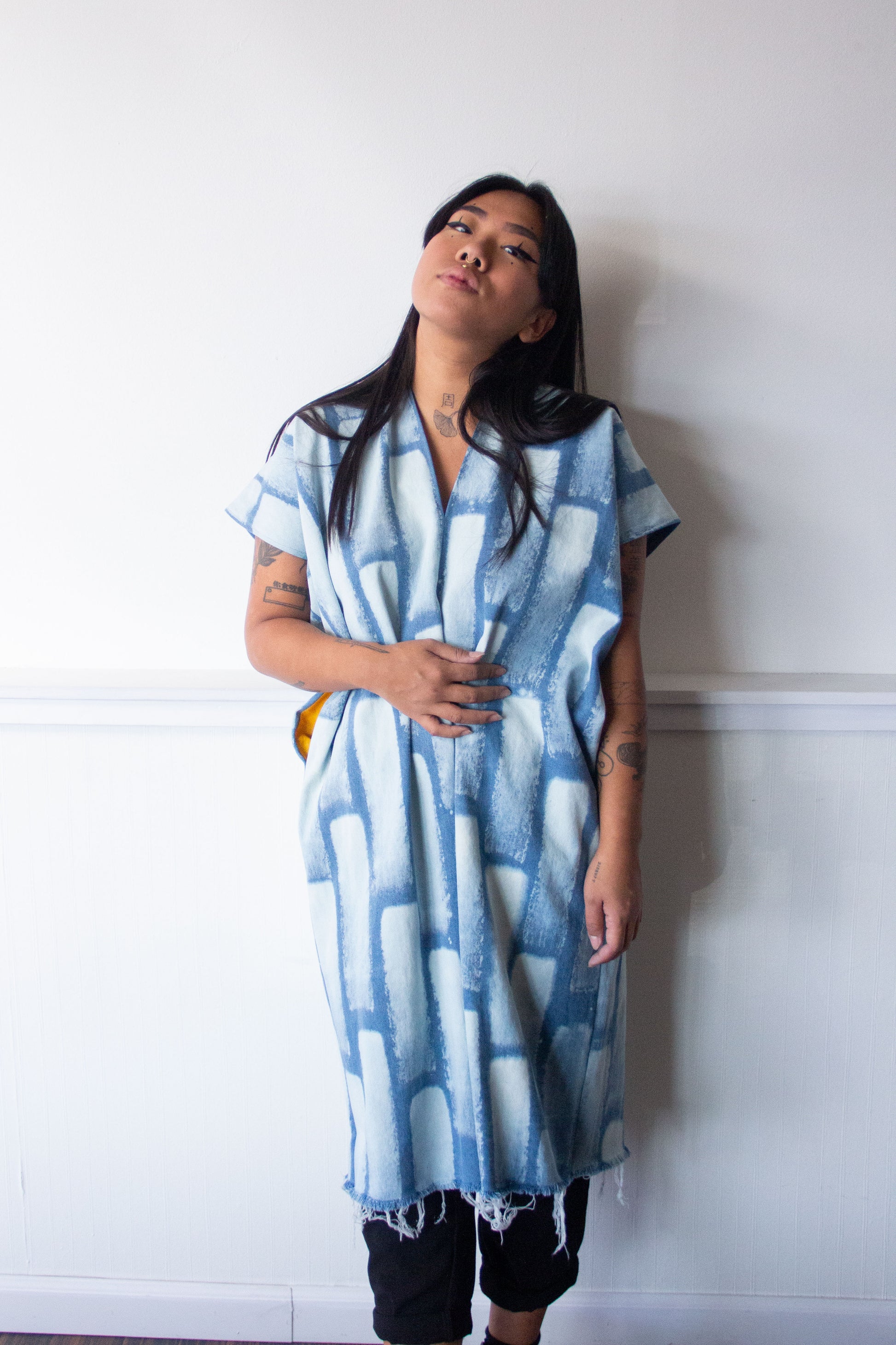 Medium weight denim smock midi dress with an oversized silhouette, slightly tapered hem and contrast marigold pockets. Versatile shape can be styled as a dress or tunic over jeans or leggings. The minimalist design created from two full rectangles of fabric produces little to no material waste. Light blue denim is hand-bleached in an organic brick pattern.