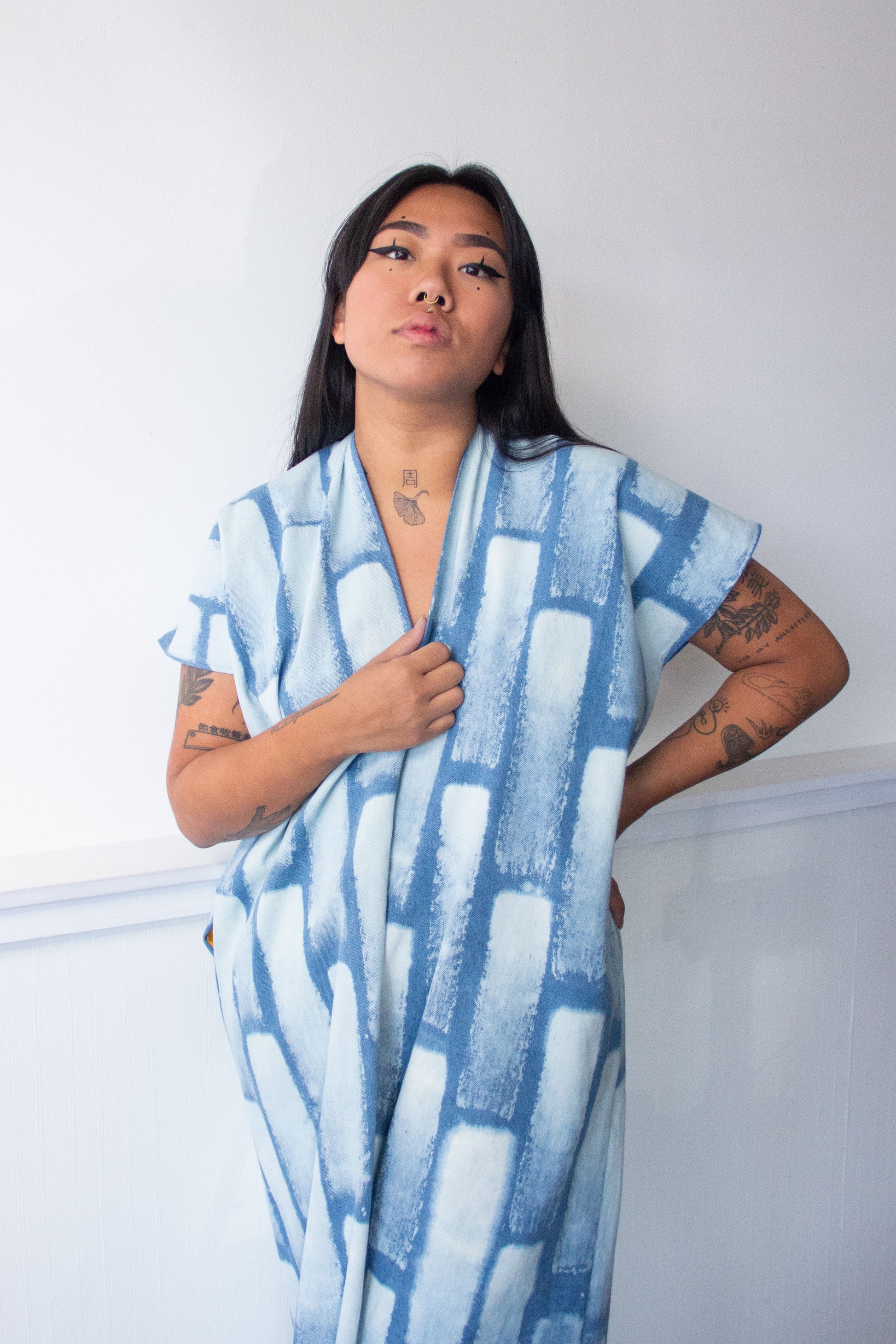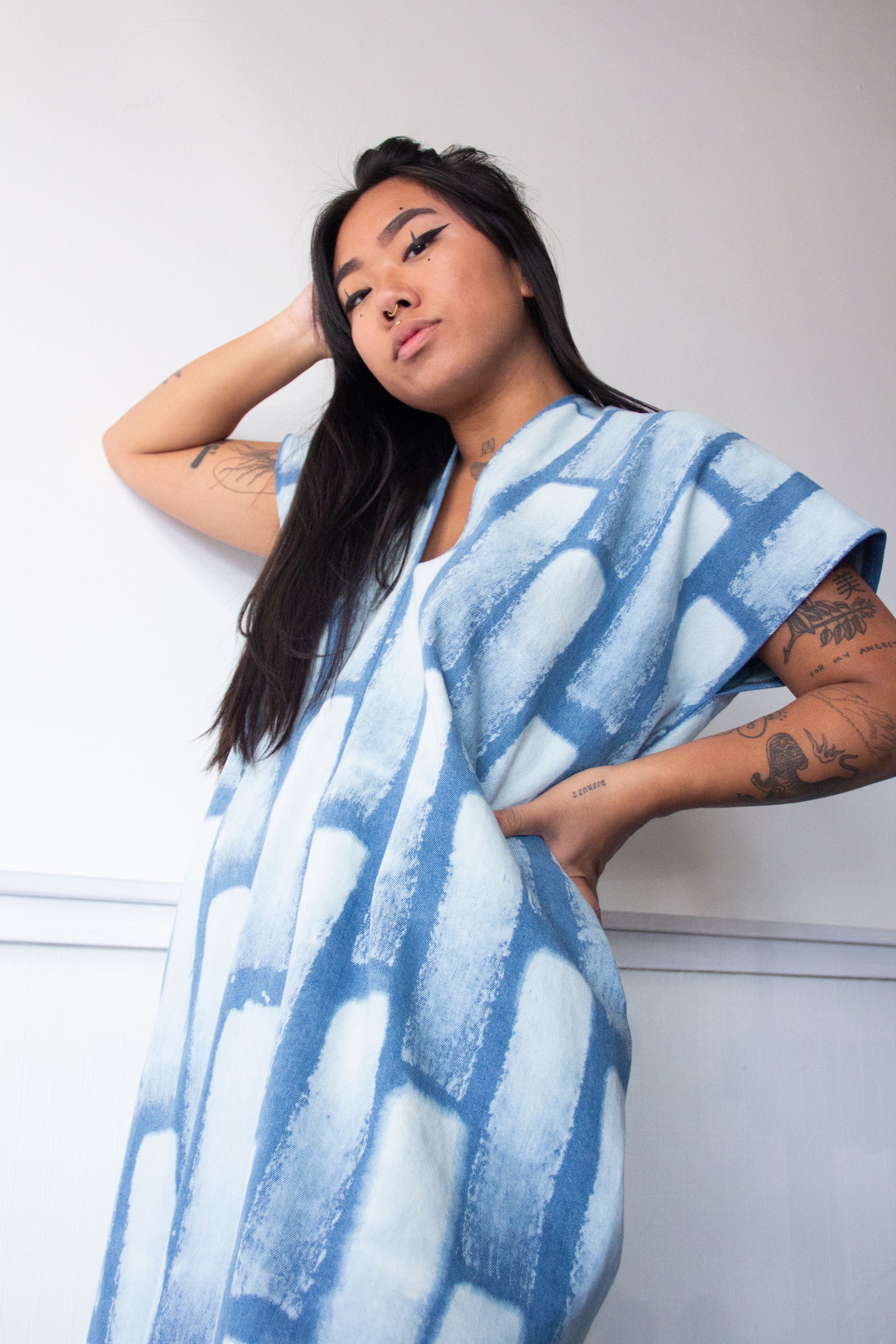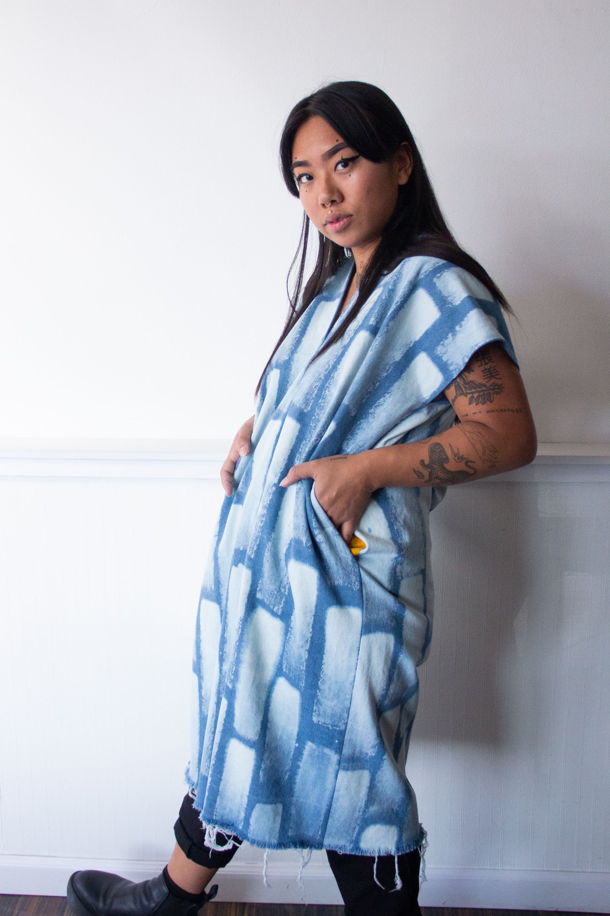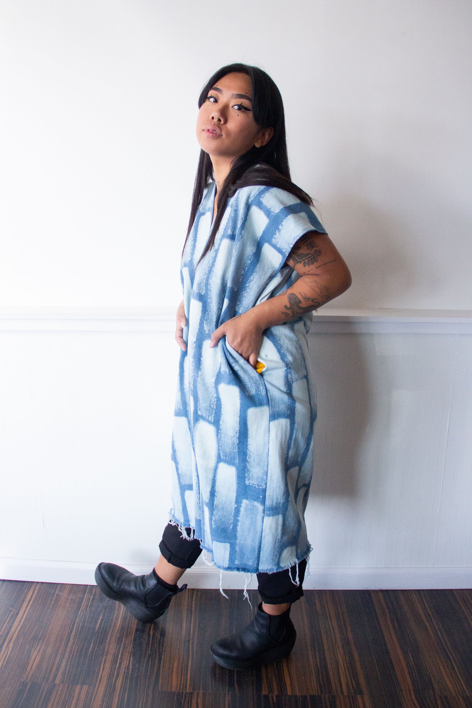 Medium weight denim smock midi dress with an oversized silhouette, slightly tapered hem and contrast marigold pockets. Versatile shape can be styled as a dress or tunic over jeans or leggings. The minimalist design created from two full rectangles of fabric produces little to no material waste. Light blue denim is hand-bleached in an organic brick pattern.