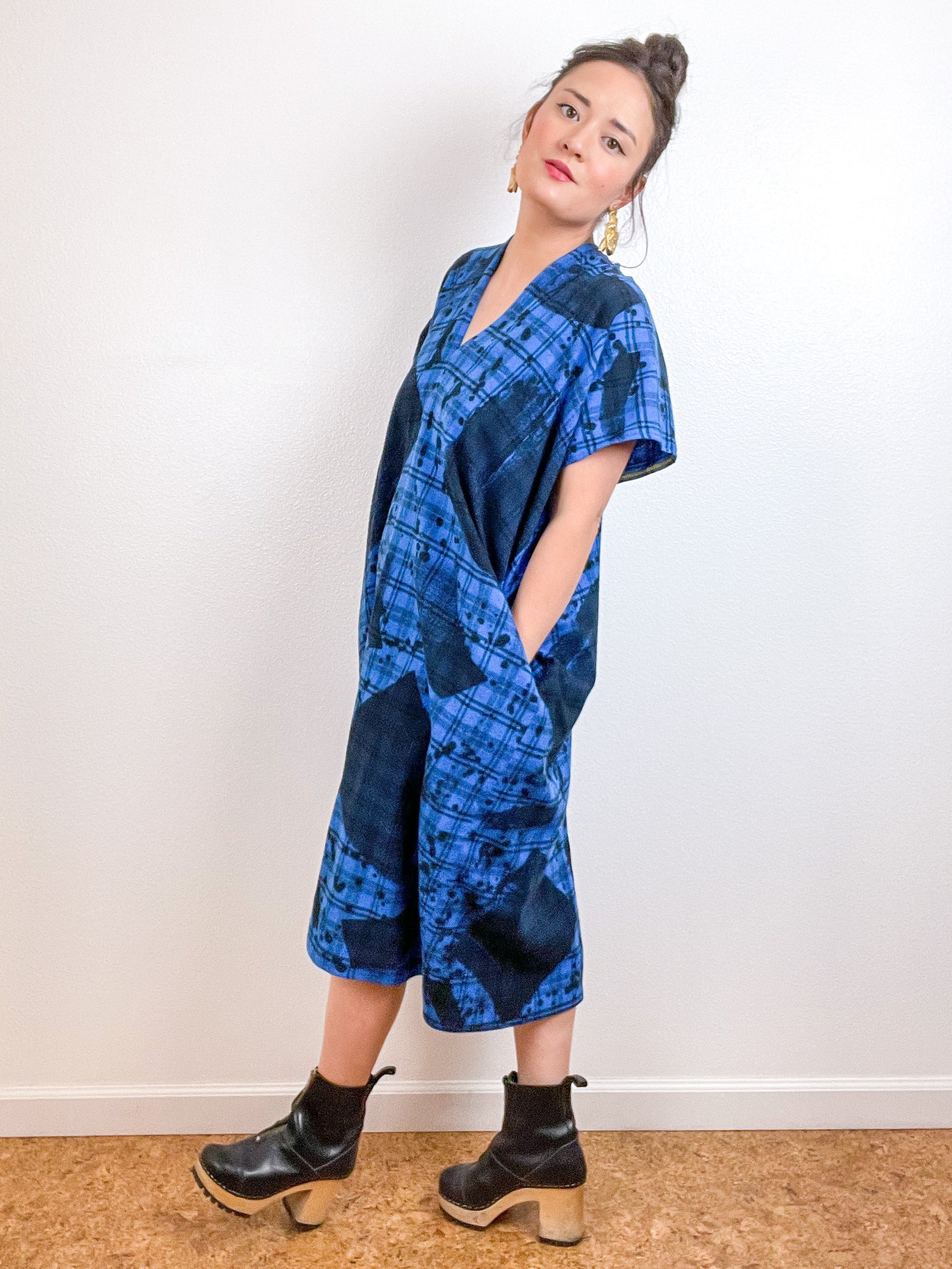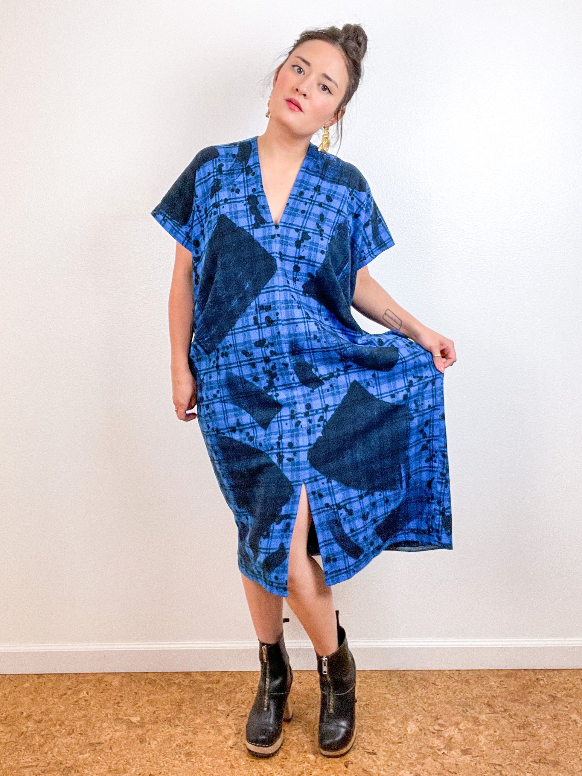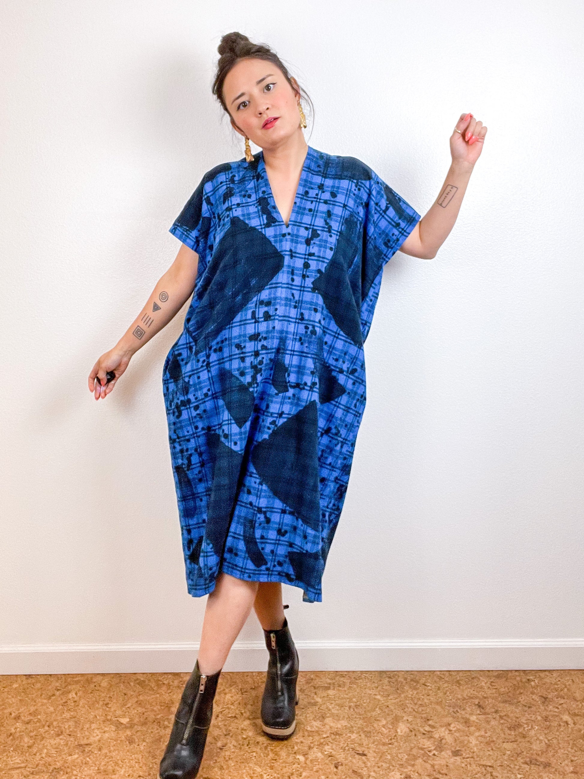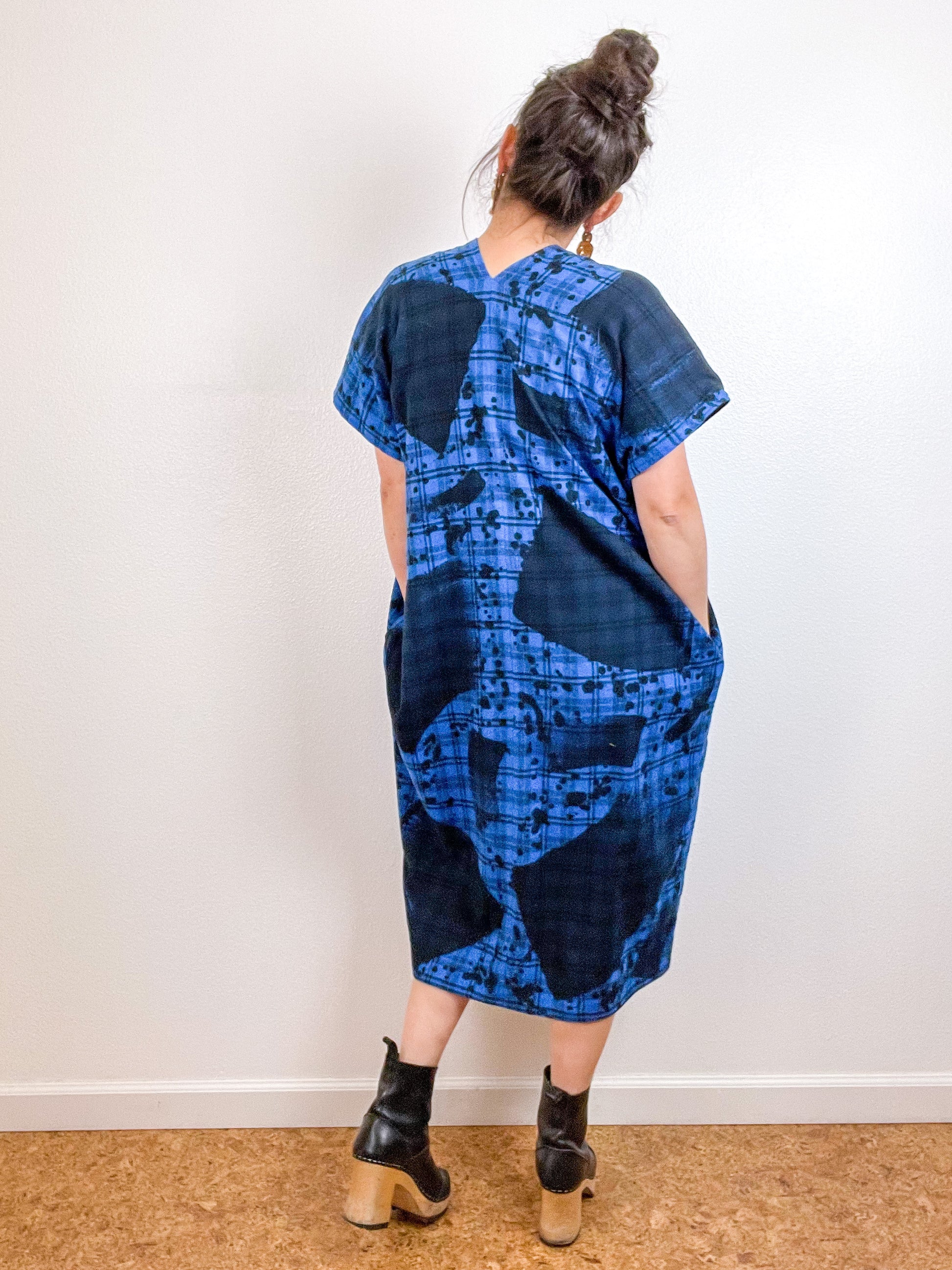 Over-dyed plaid flannel smock dress with an oversized silhouette, slightly tapered hem and contrast plaid pockets. Midi length on most with a 10” front center slit. The minimalist design created from two full rectangles of fabric produces little to no material waste. Royal blue and black 100% cotton plaid flannel is hand-dyed with black brushstrokes pattern with algae thickened dye.