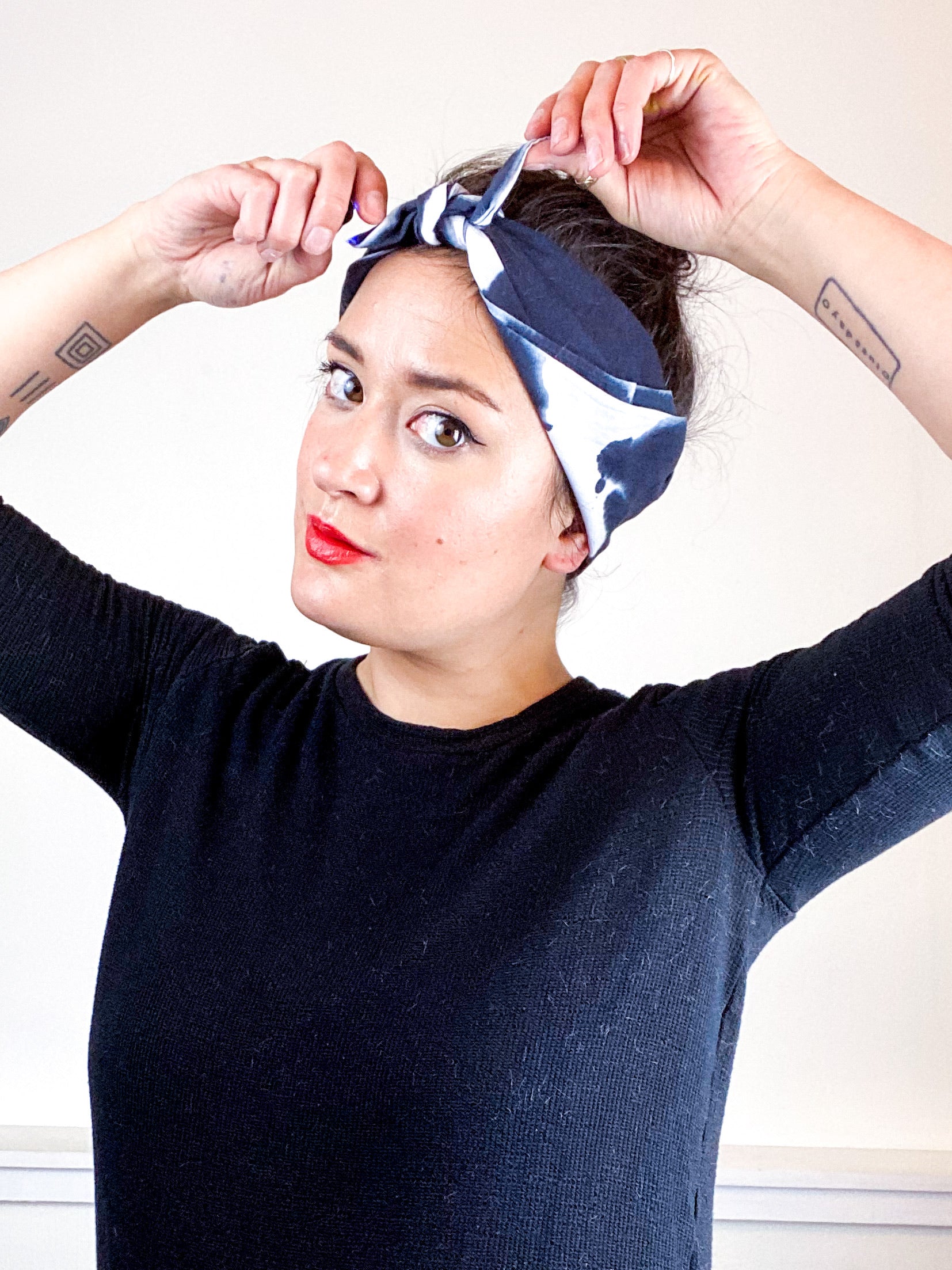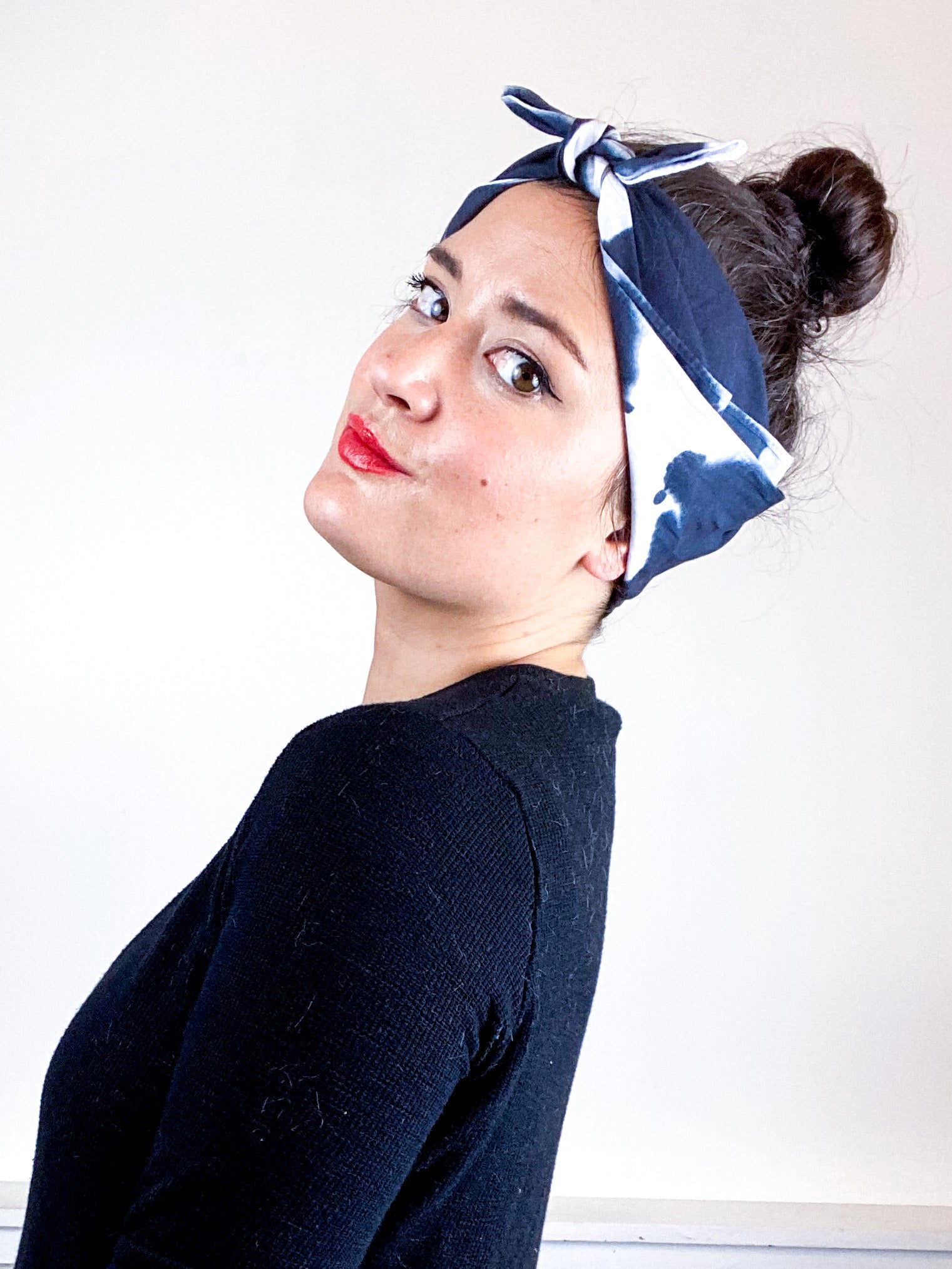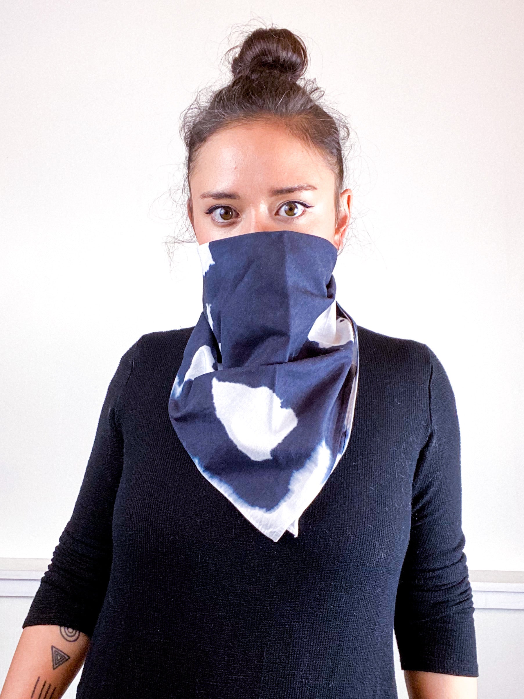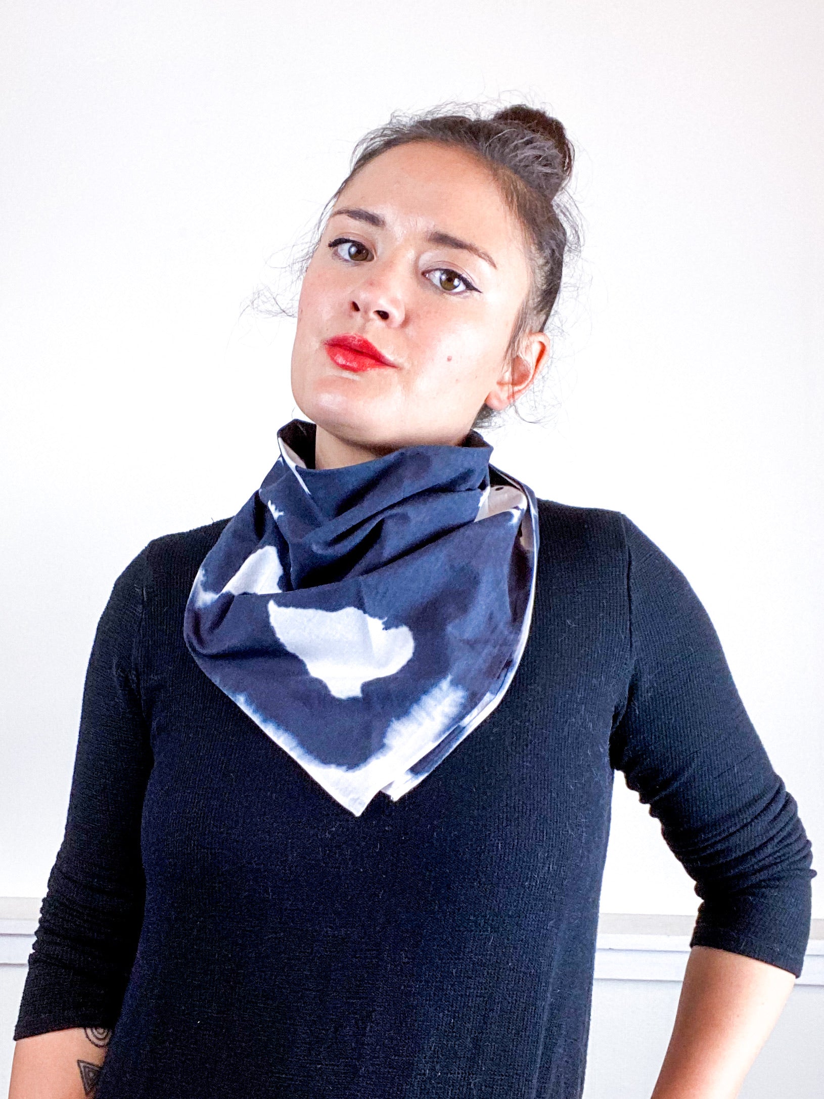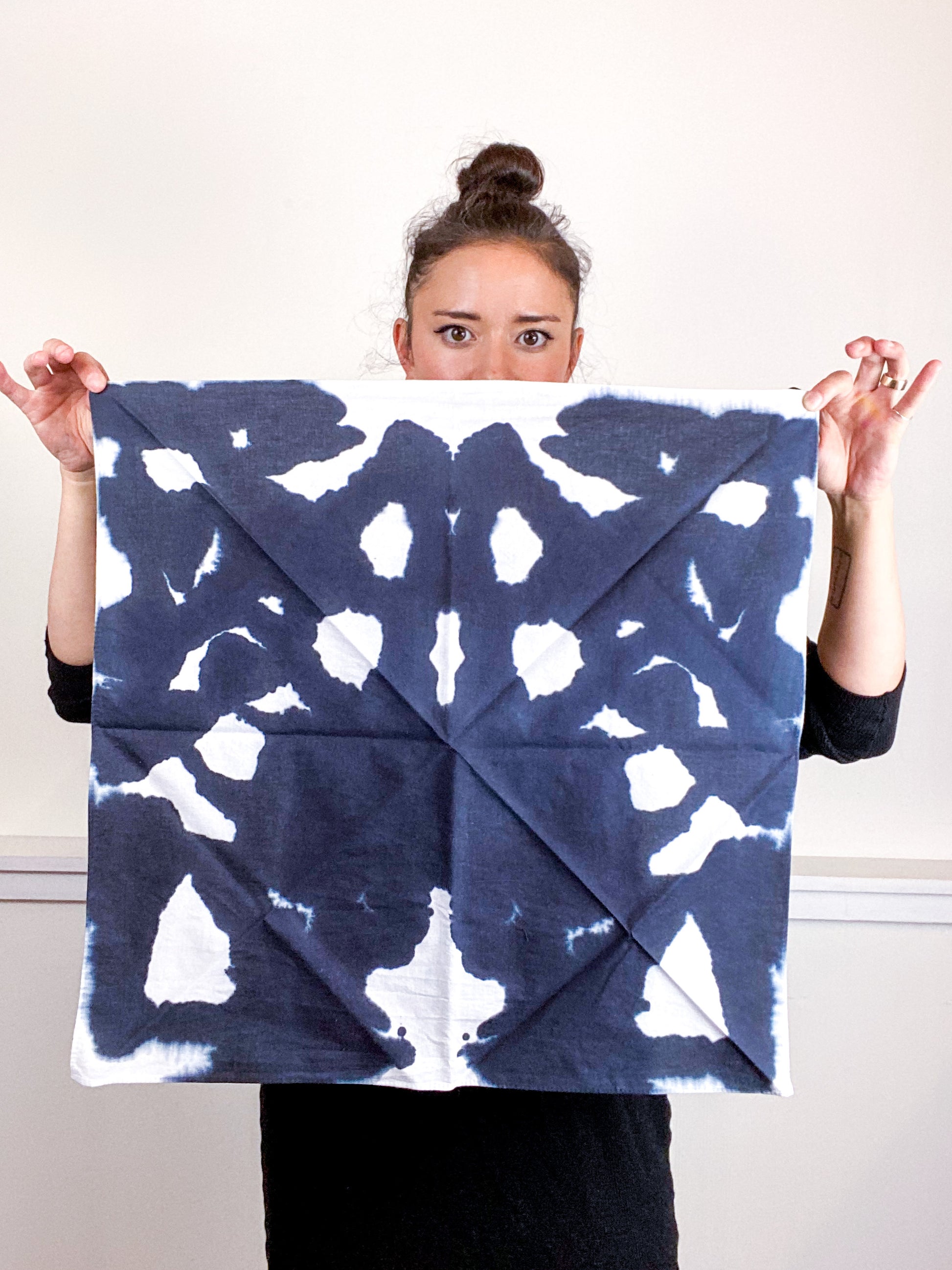 2020 essential square bandana. Great for impromptu face covering, bad hair day saver, or a little extra warmth/style around your neck. 100% cotton fabric is hand-dyed with algae thickened dye in a black mirrored inkblot pattern.