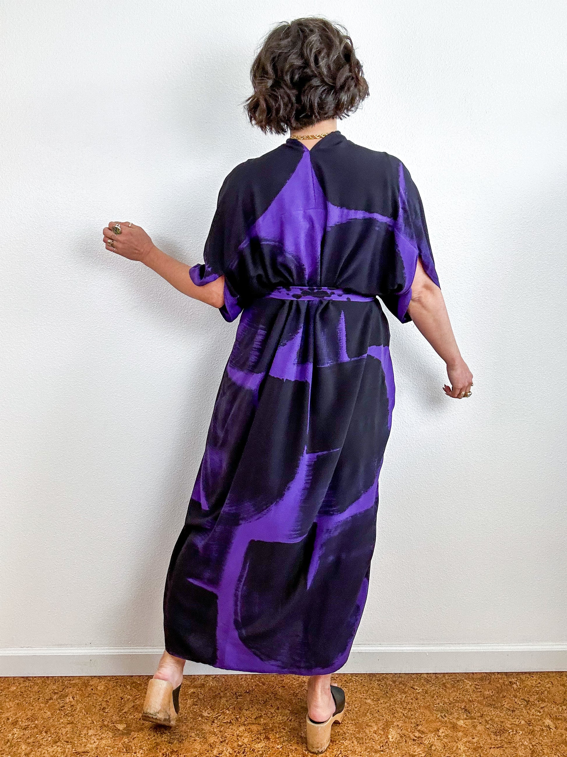 Soft and airy kimono with a flowing silhouette, tulip sleeve detail, curved high low hem and separate waist tie. Versatile shape can be styled as a wrap dress, an open kimono without the tie, or a robe for staying home. The minimalist design created from a full rectangle of fabric drapes beautifully over the shoulders and produces no material waste by utilizing one whole piece of fabric without scraps from corners and irregular cuts. Lightweight woven purple fabric is hand-dyed with black algae thickened dye using a gestural brushstroke technique.