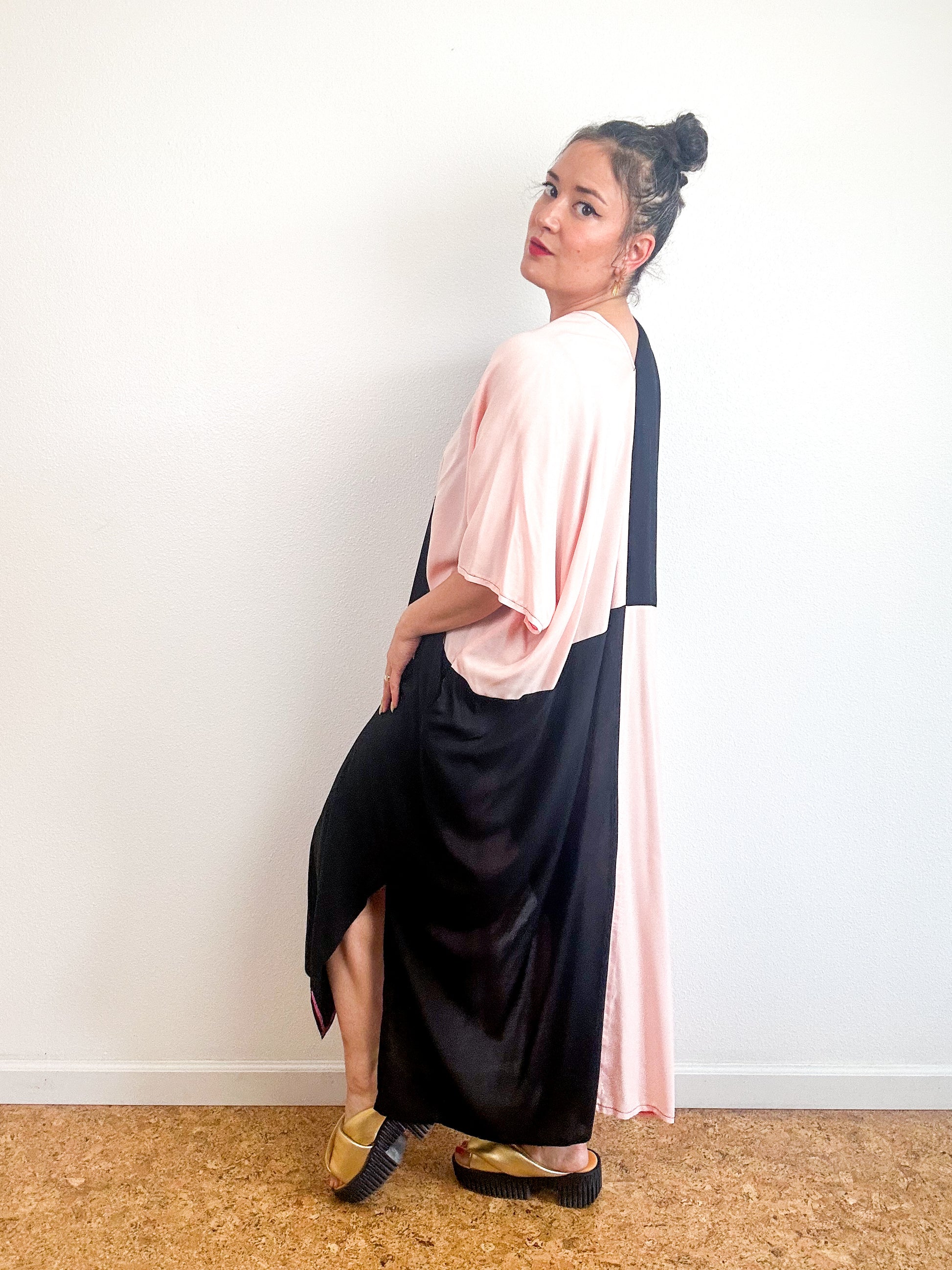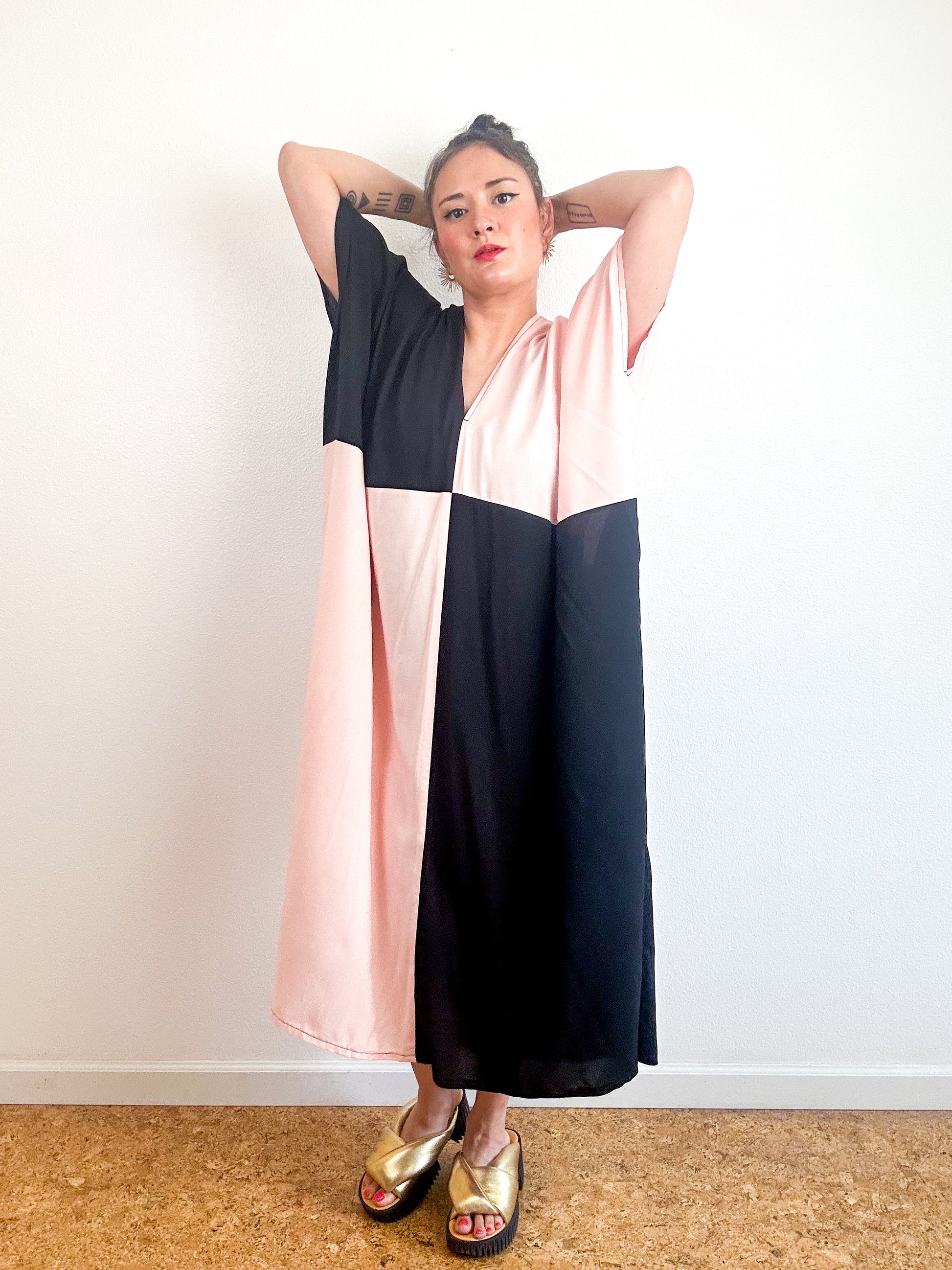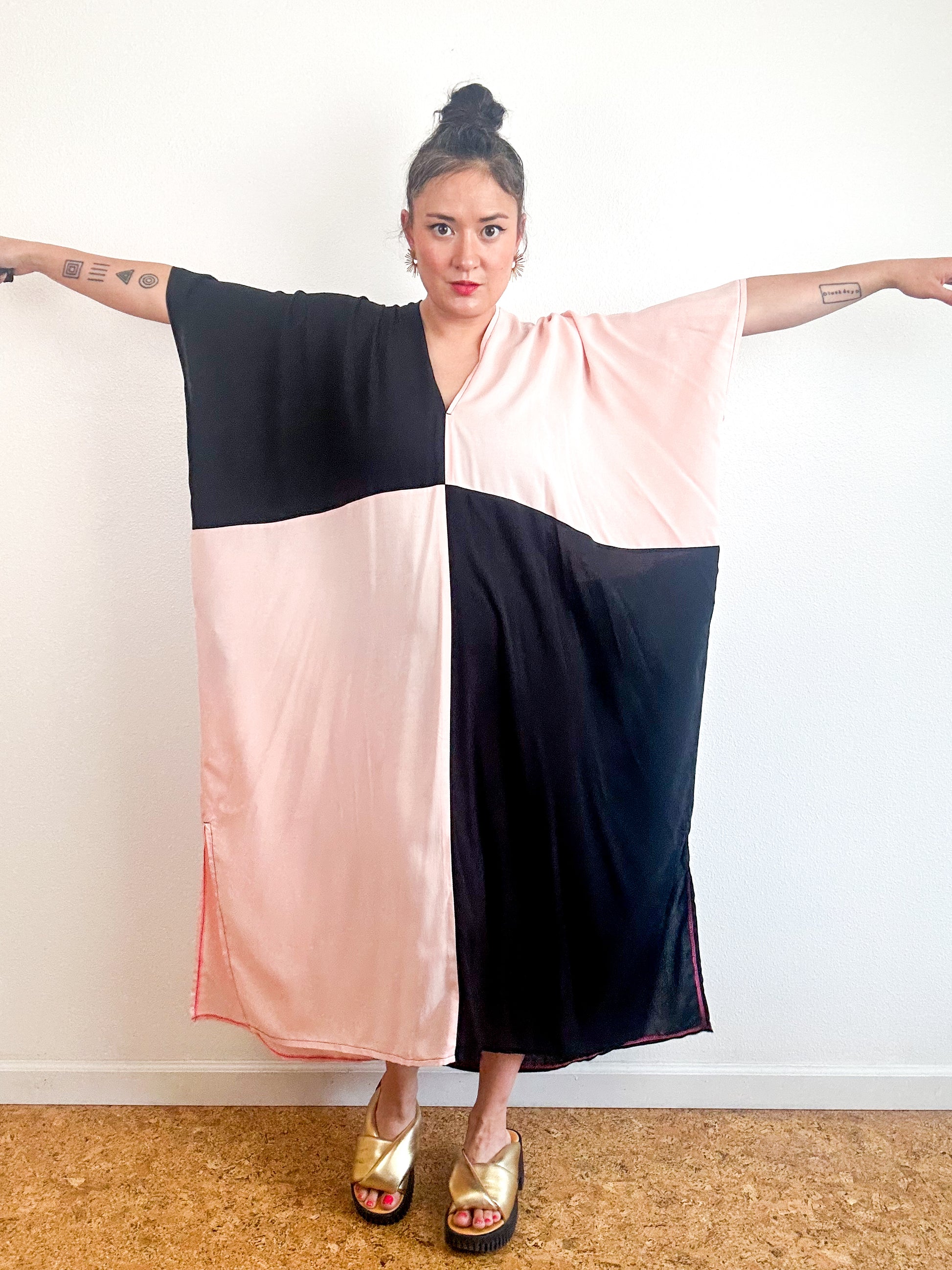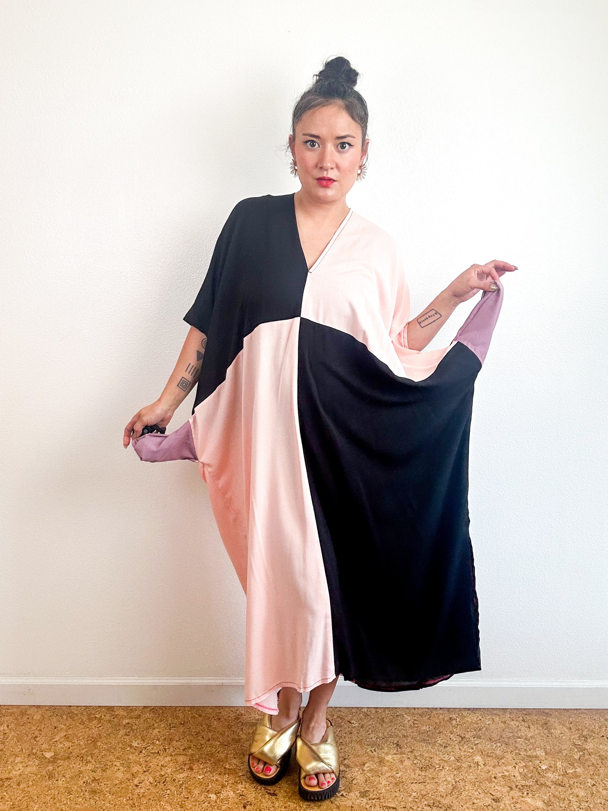 Color block caftan dress with an oversized silhouette, midi length, side slits and contrast side seam pockets. Minimalist design created from full rectangles of fabric produces zero material waste. Lightweight 100% bamboo rayon fabric in blush pink and black.