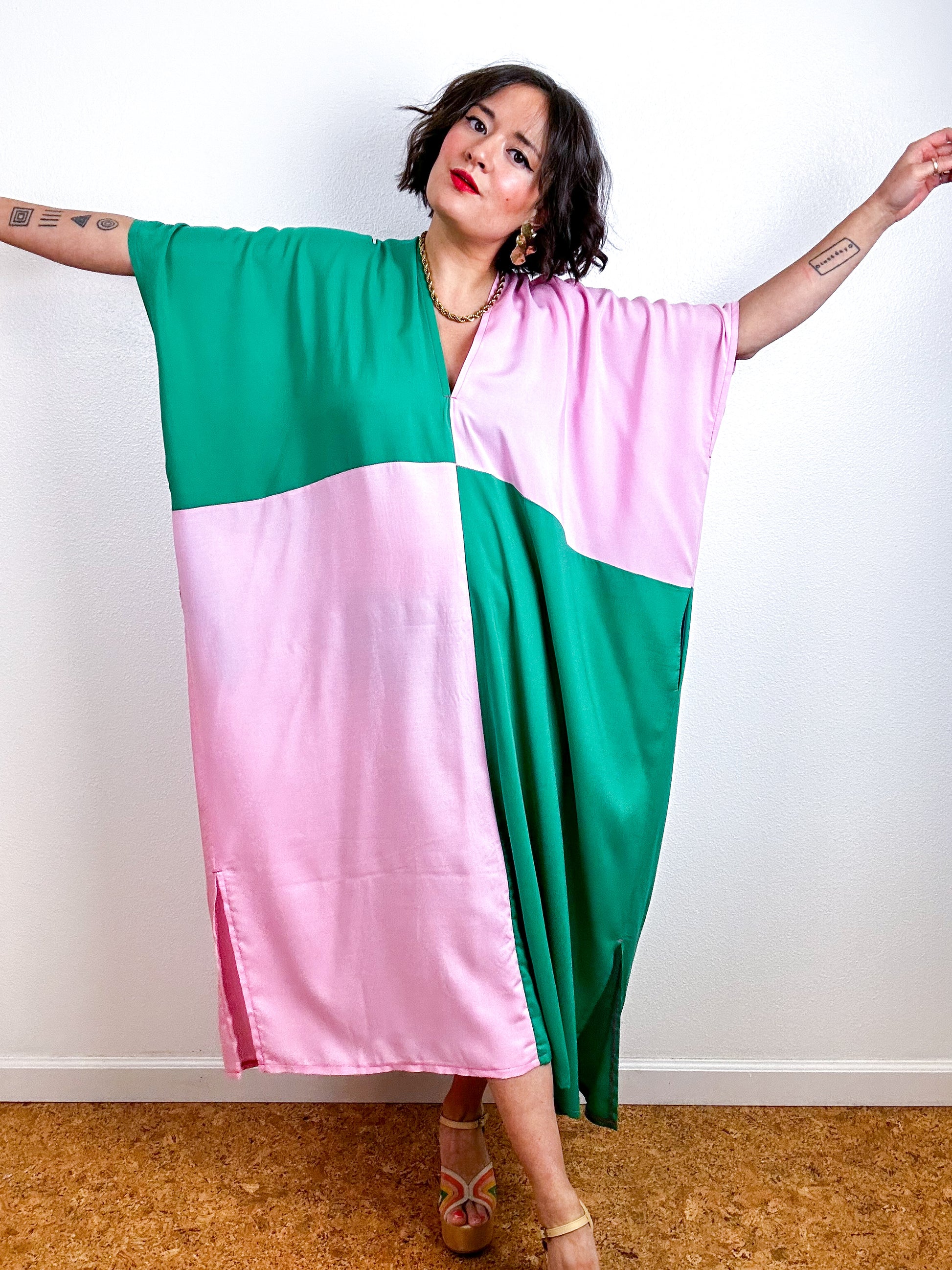 Color block caftan dress with an oversized silhouette, midi length, side slits and contrast side seam pockets. Minimalist design created from full rectangles of fabric produces zero material waste. Lightweight 100% bamboo rayon fabric in emerald green and pink.