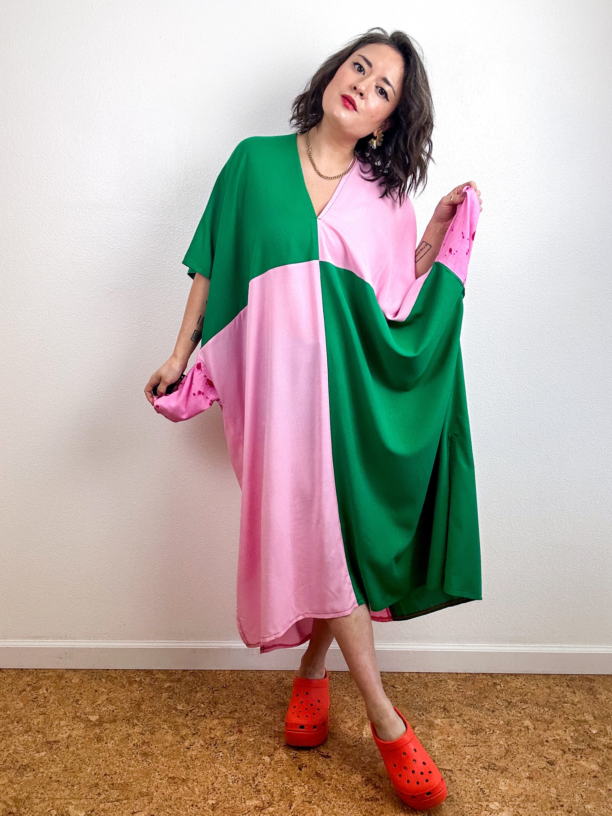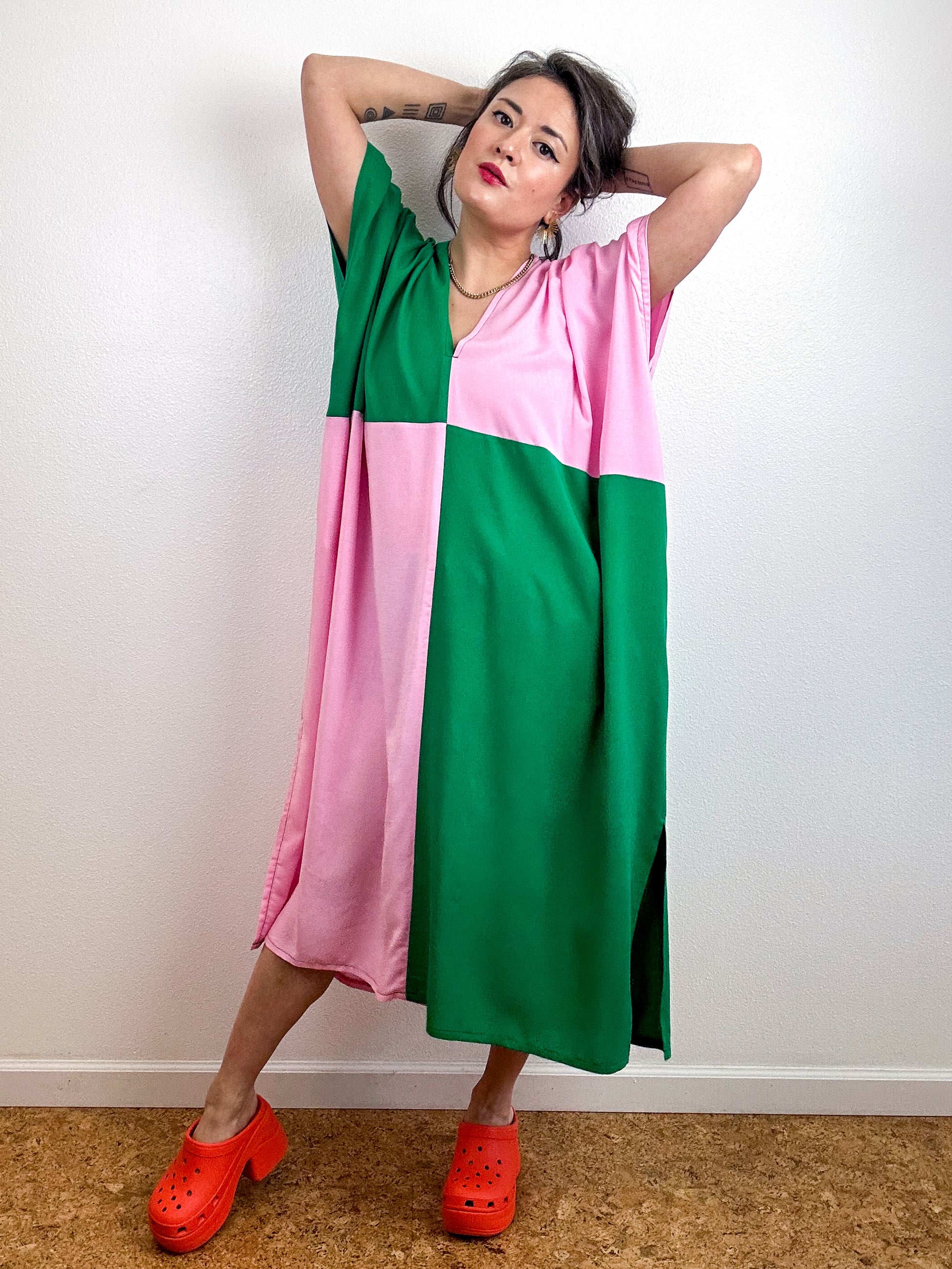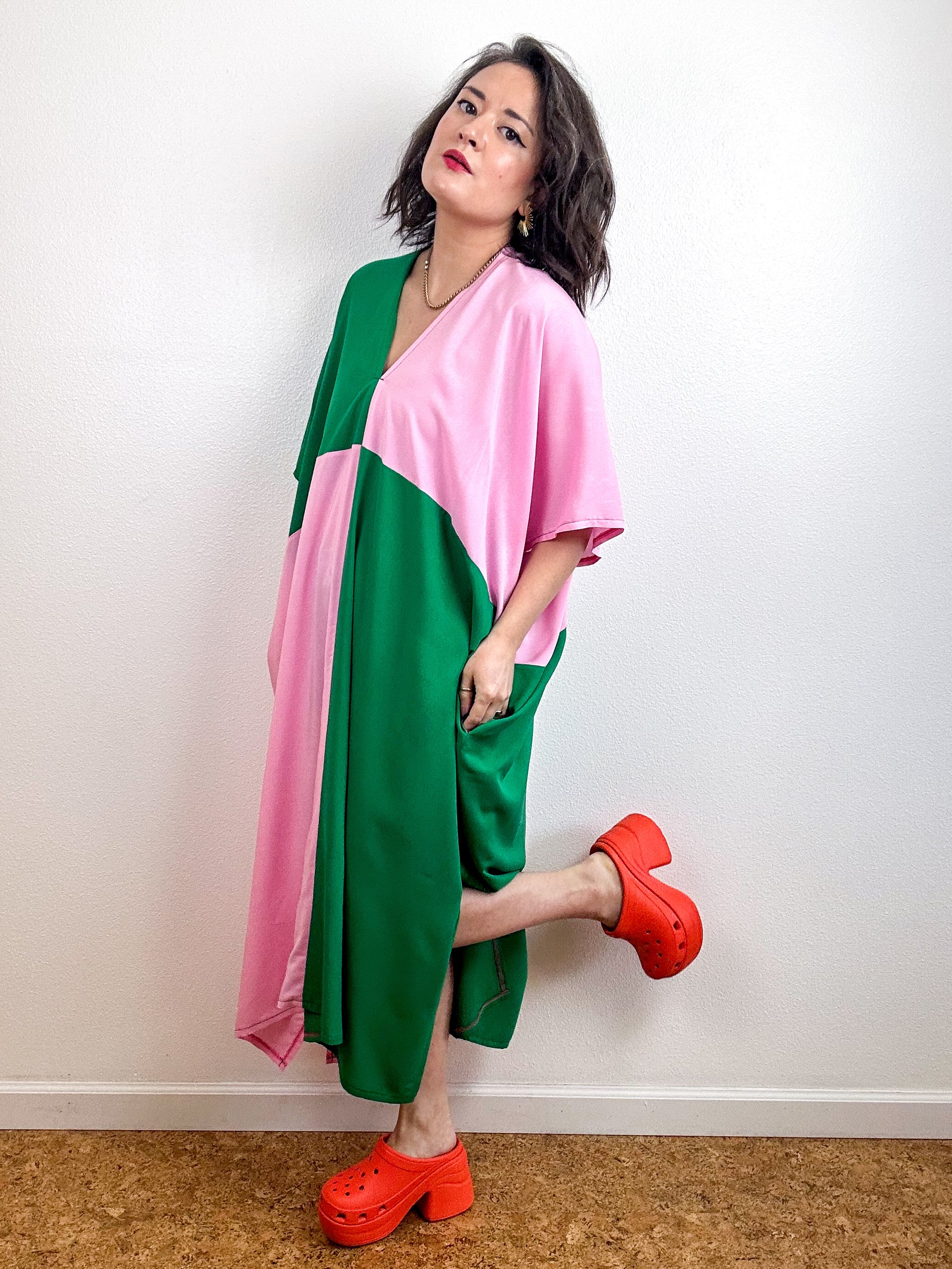 Color block caftan dress with an oversized silhouette, midi length, side slits and contrast side seam pockets. Minimalist design created from full rectangles of fabric produces zero material waste. Lightweight 100% bamboo rayon fabric in Kelly green and pink.