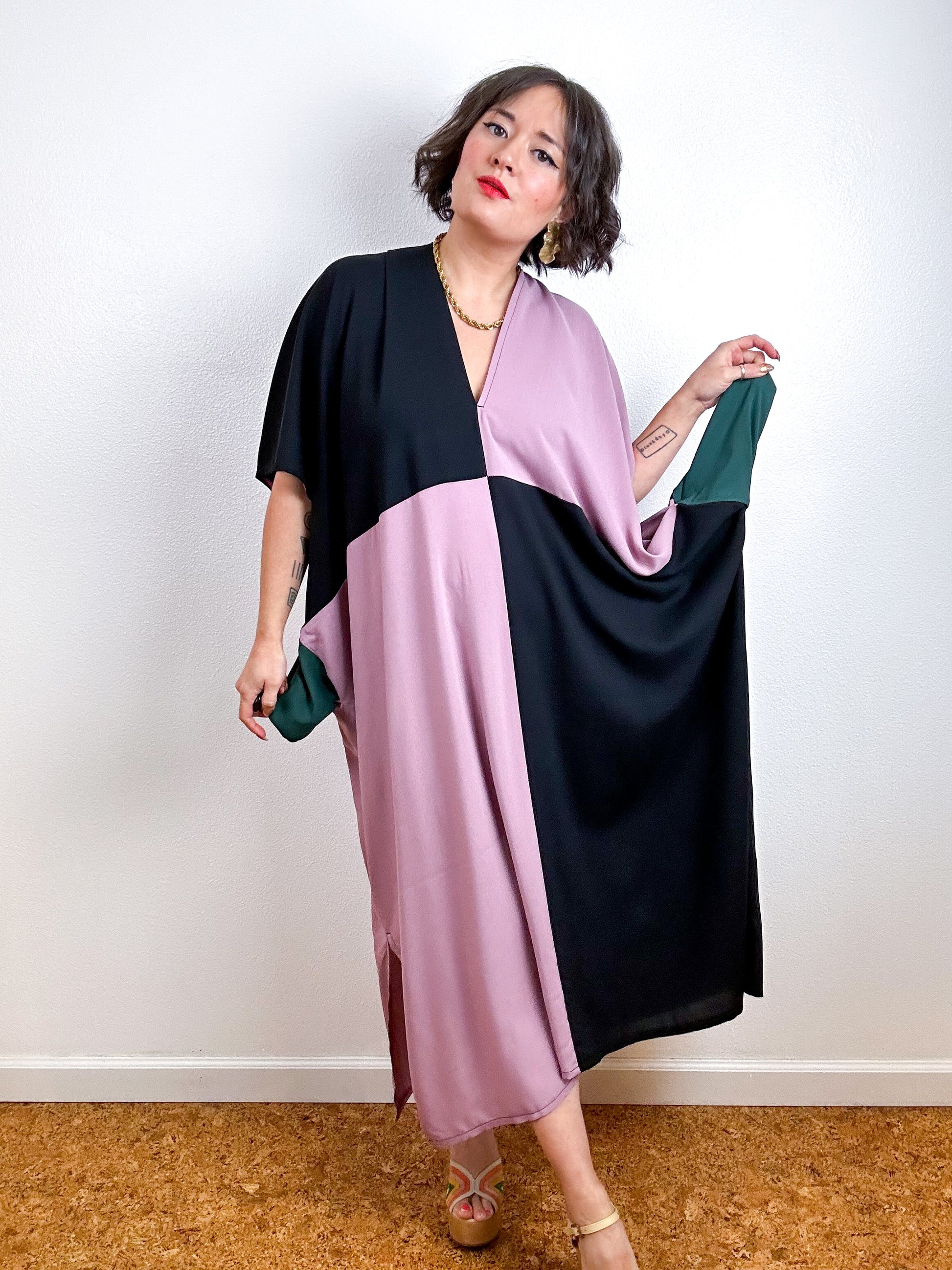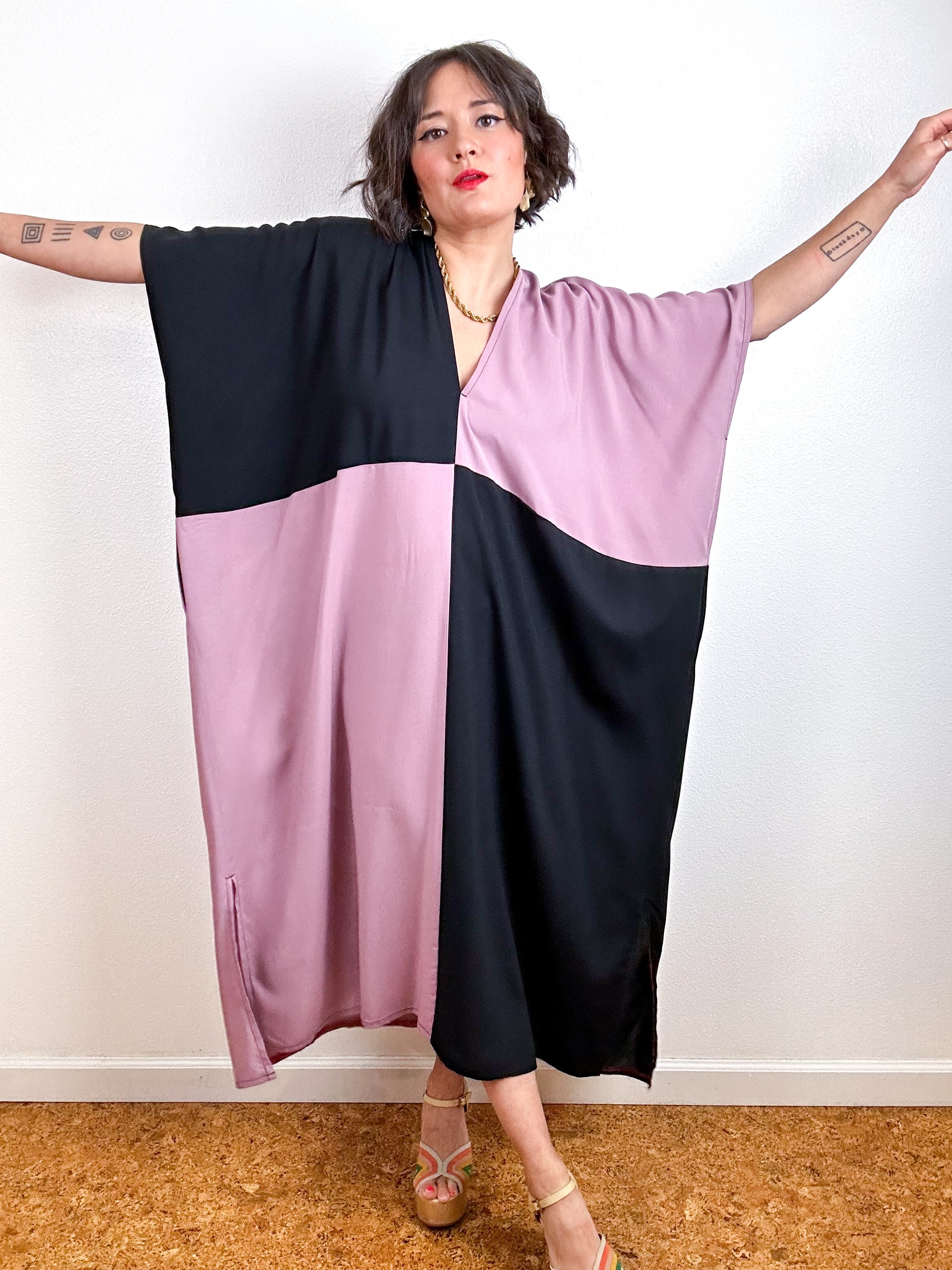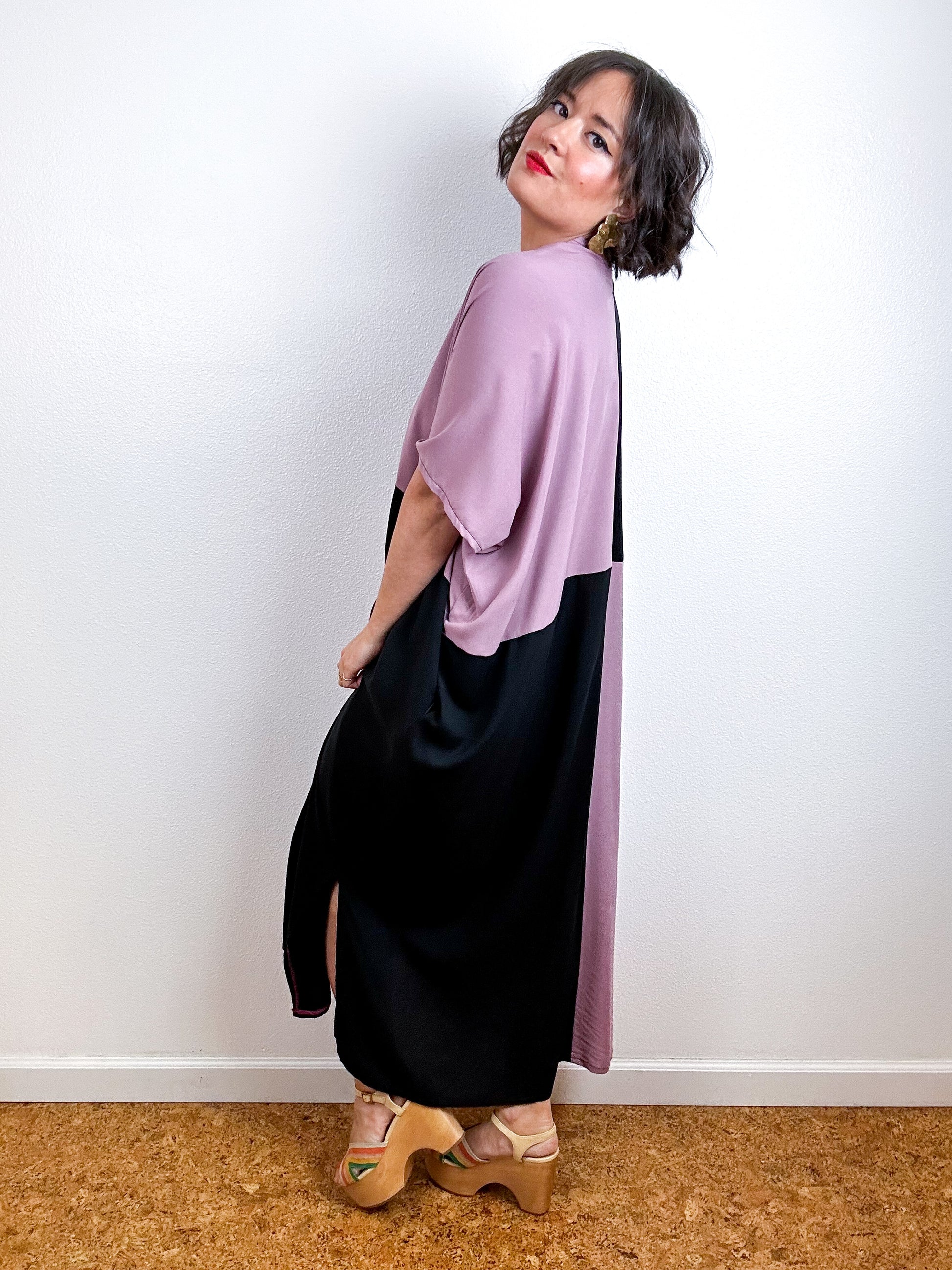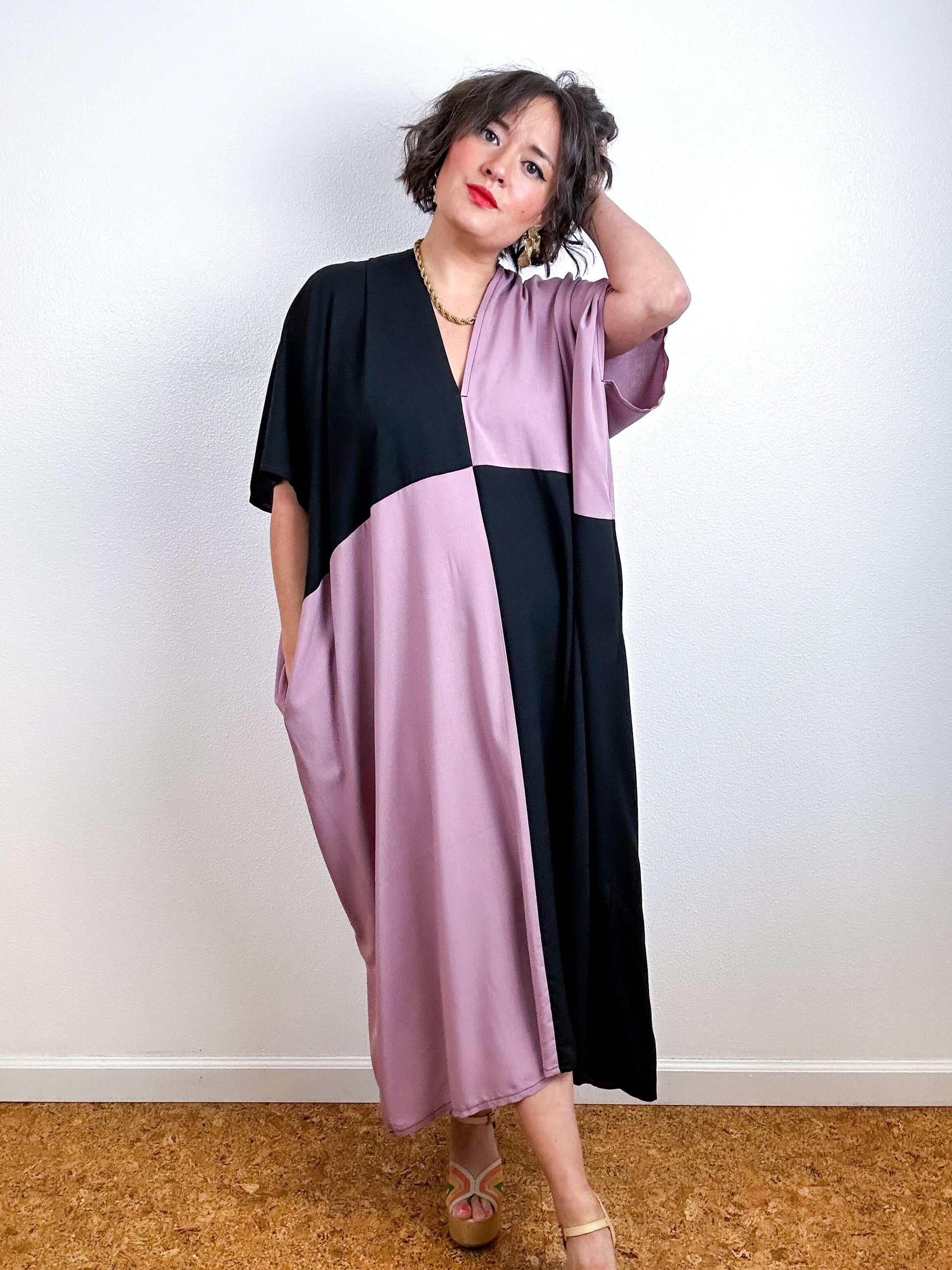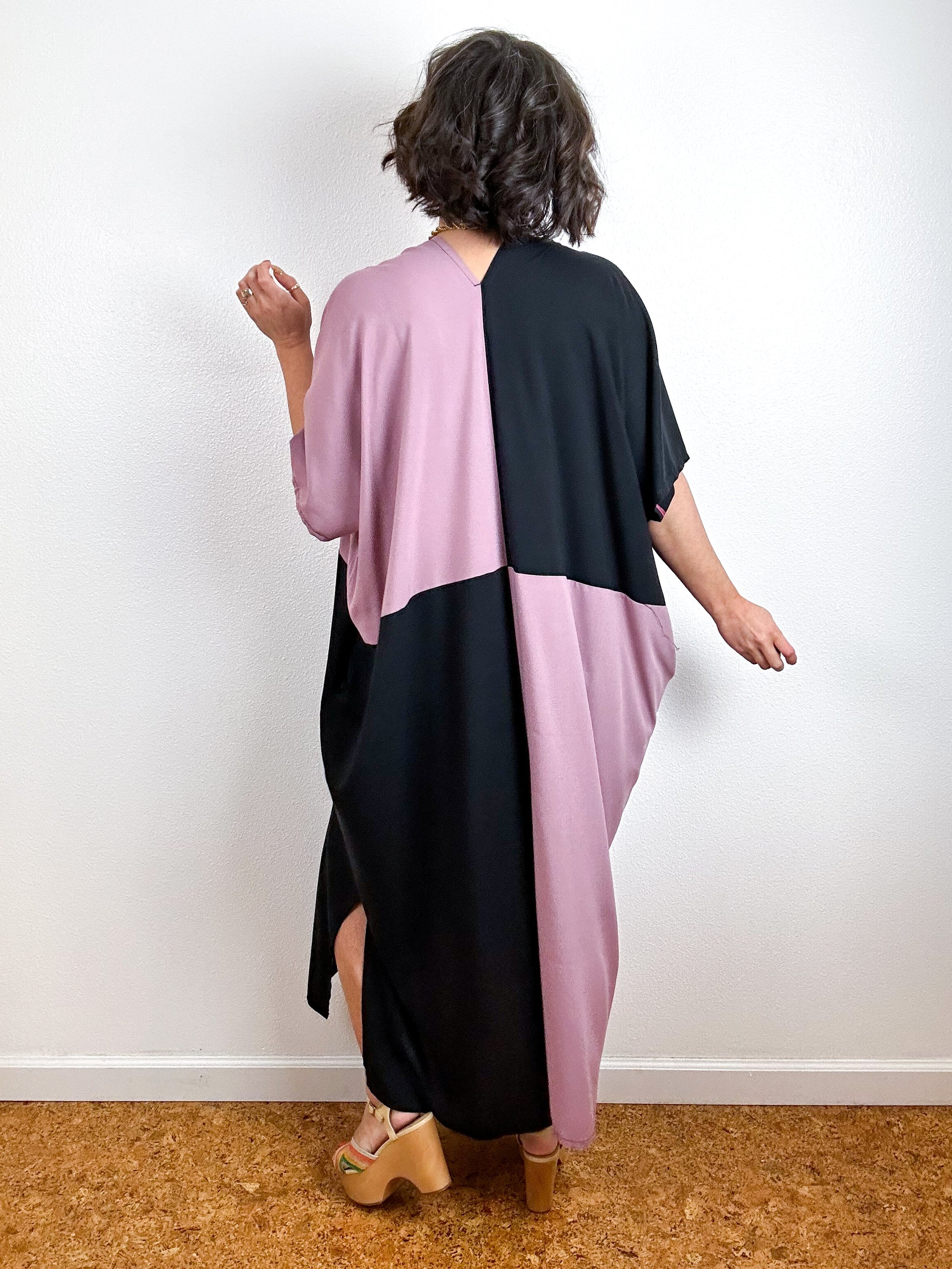 Color block caftan dress with an oversized silhouette, midi length, side slits and contrast side seam pockets. Minimalist design created from full rectangles of fabric produces zero material waste. Lightweight 100% bamboo rayon fabric in mauve pink and black.