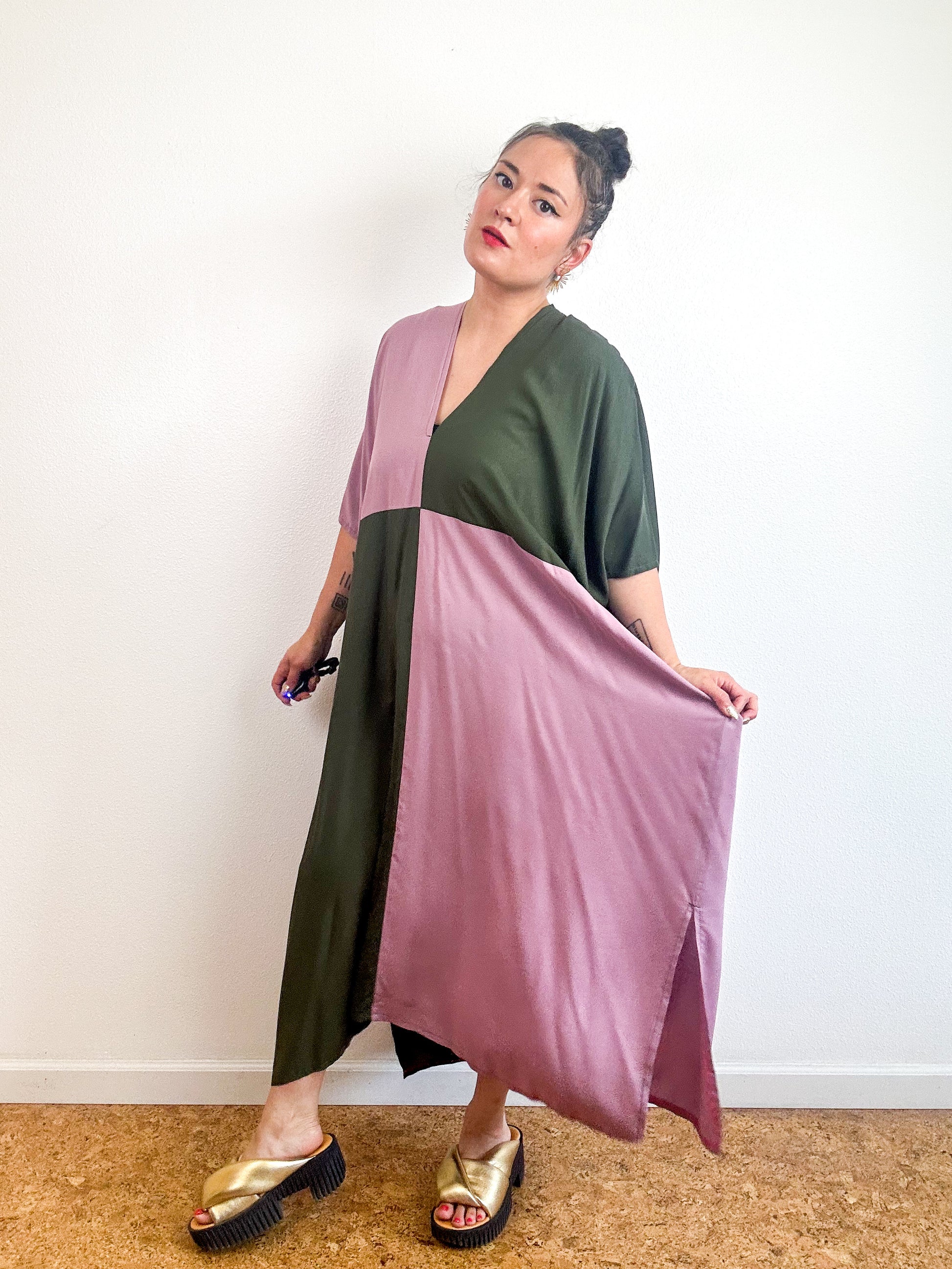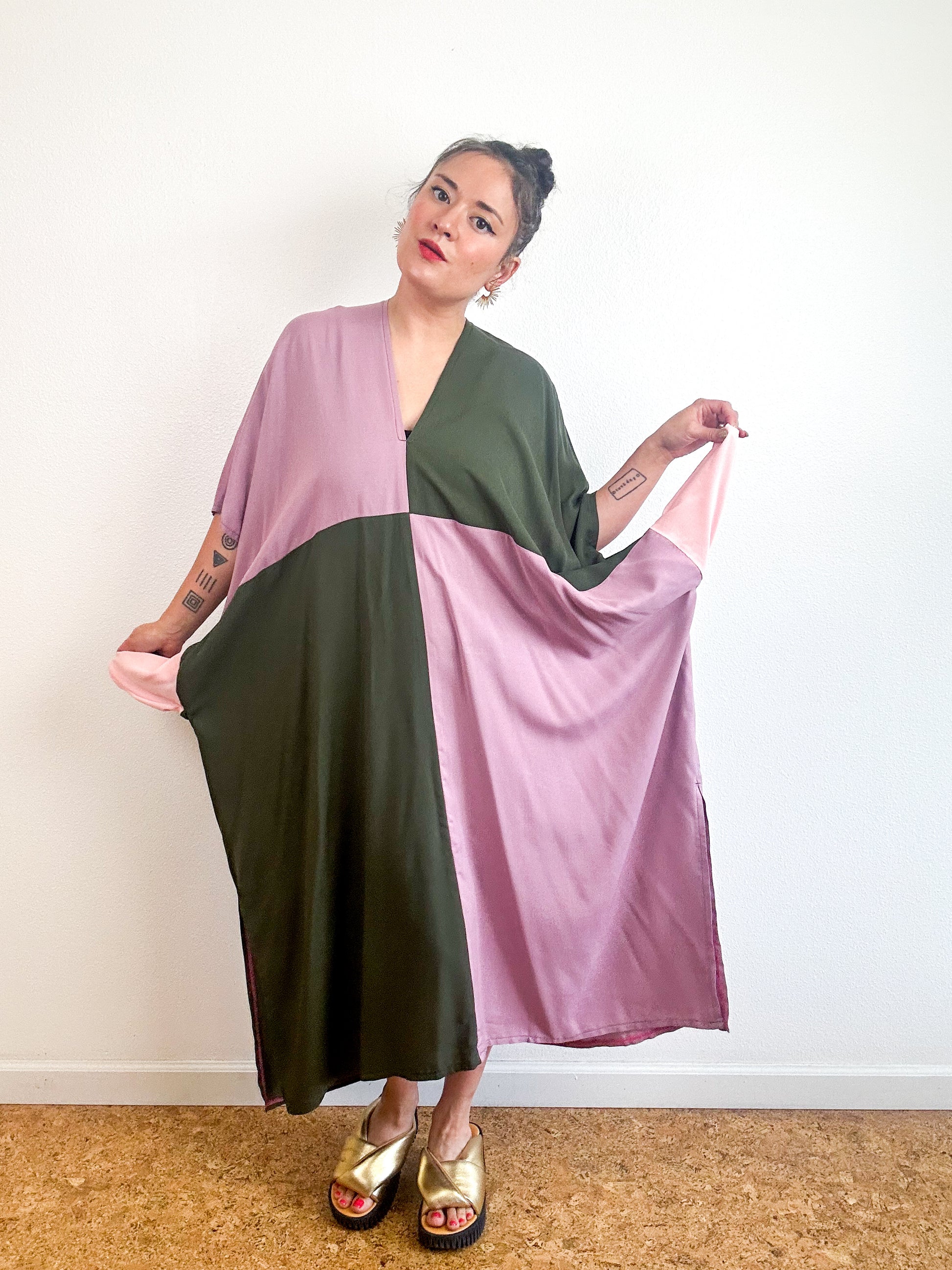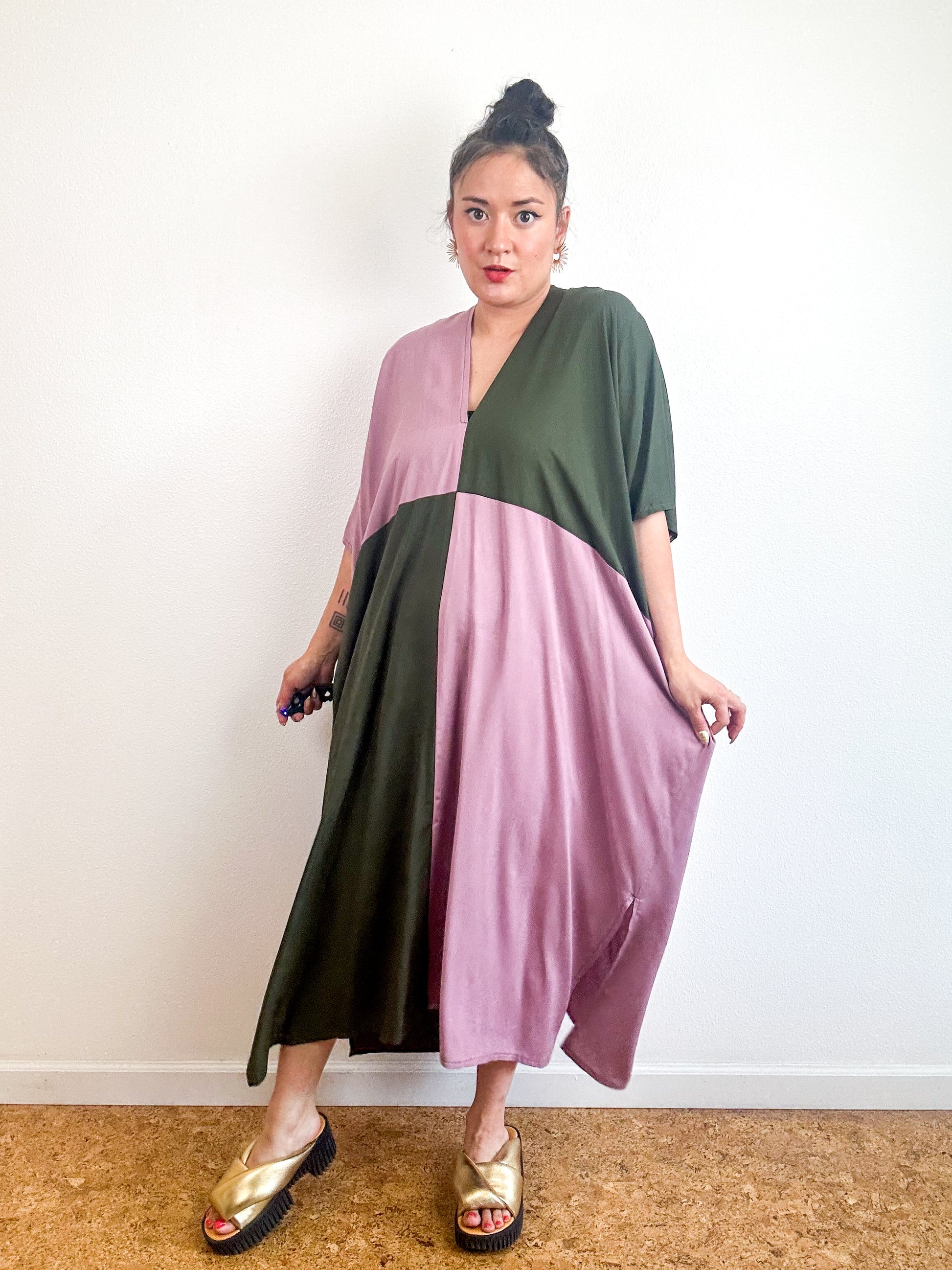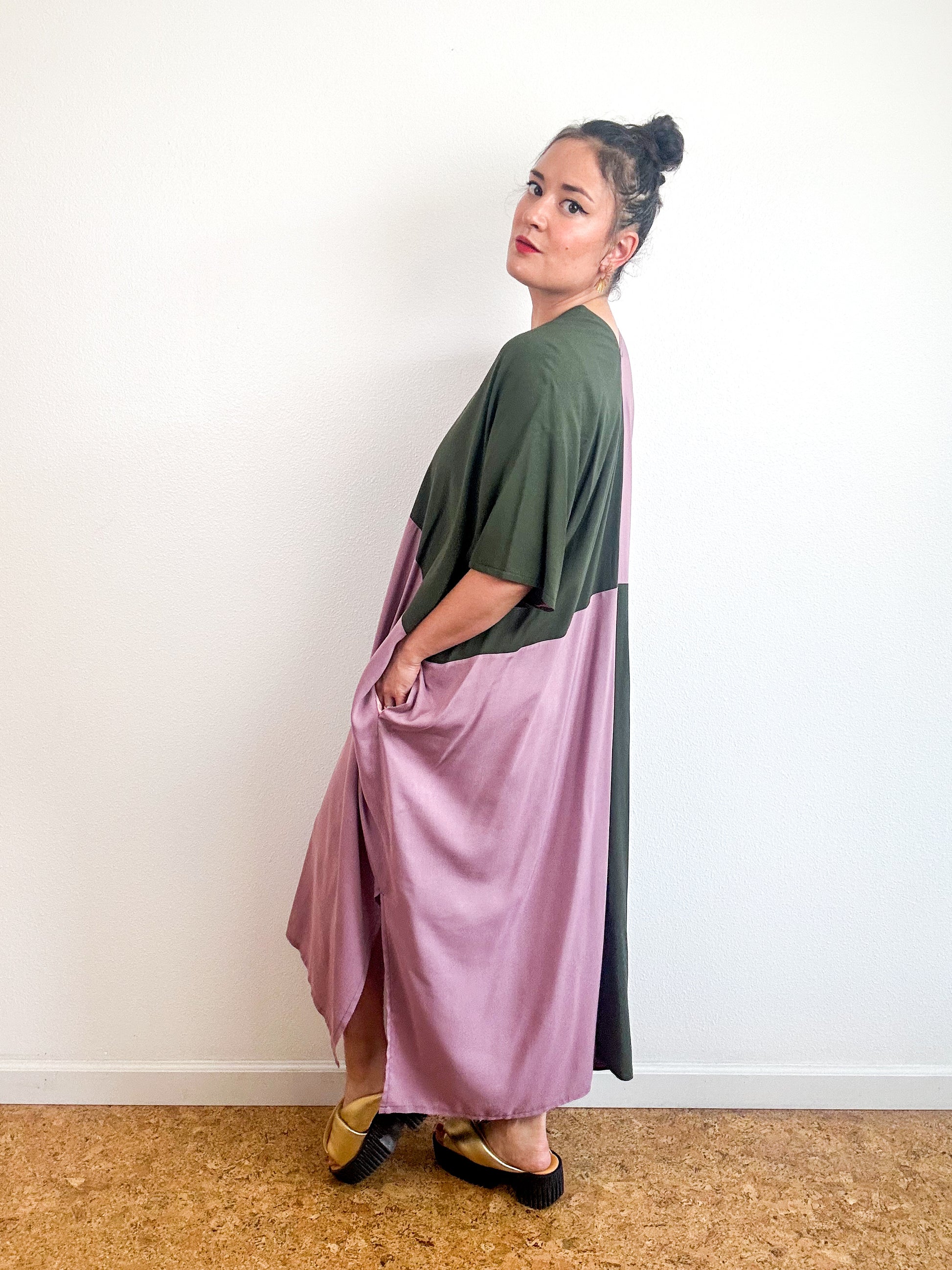 Color block caftan dress with an oversized silhouette, midi length, side slits and contrast side seam pockets. Minimalist design created from full rectangles of fabric produces zero material waste. Lightweight 100% bamboo rayon fabric in olive and mauve.