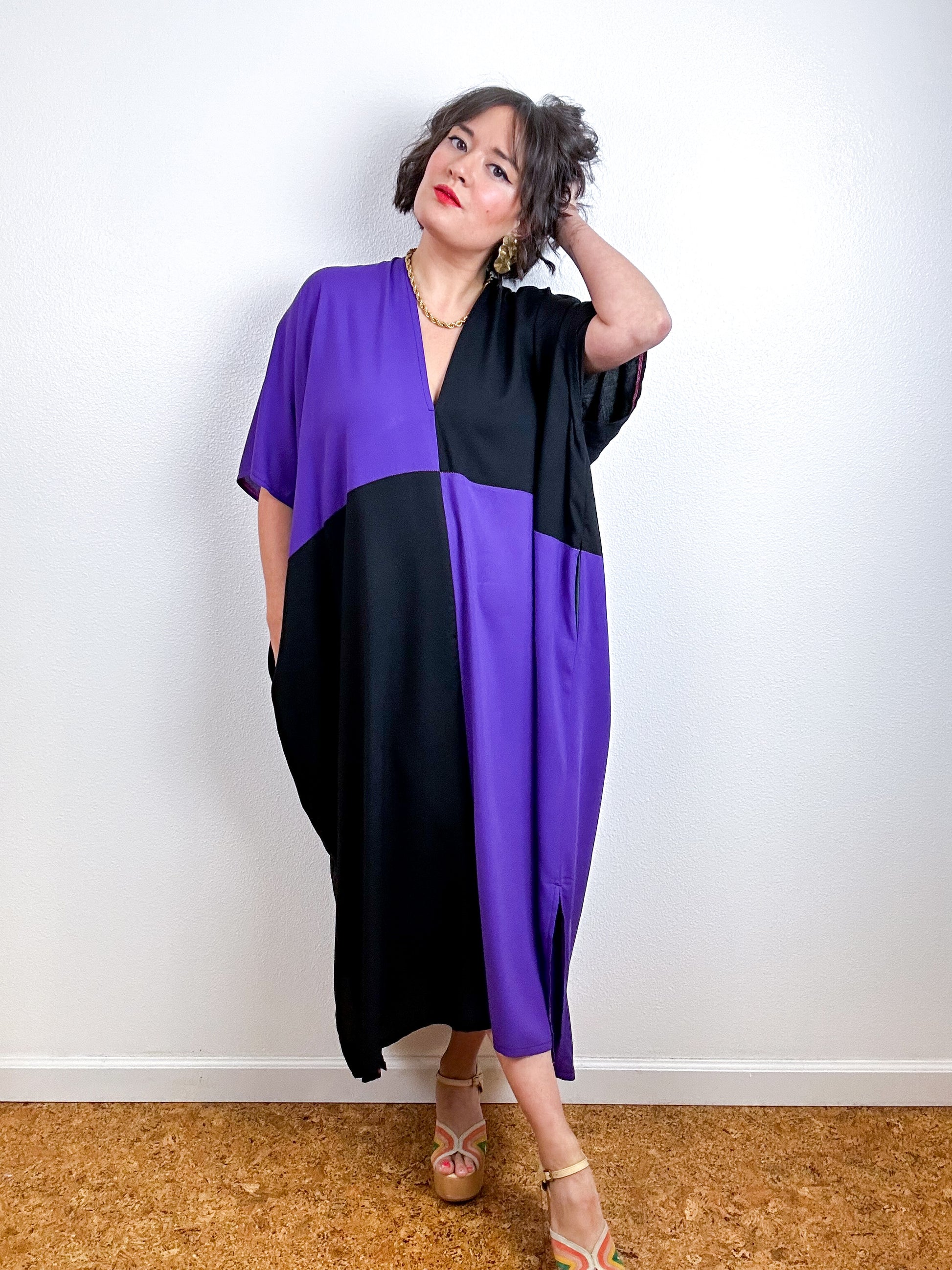 Color block caftan dress with an oversized silhouette, midi length, side slits and contrast side seam pockets. Minimalist design created from full rectangles of fabric produces zero material waste. Lightweight 100% bamboo rayon fabric in royal purple and black.