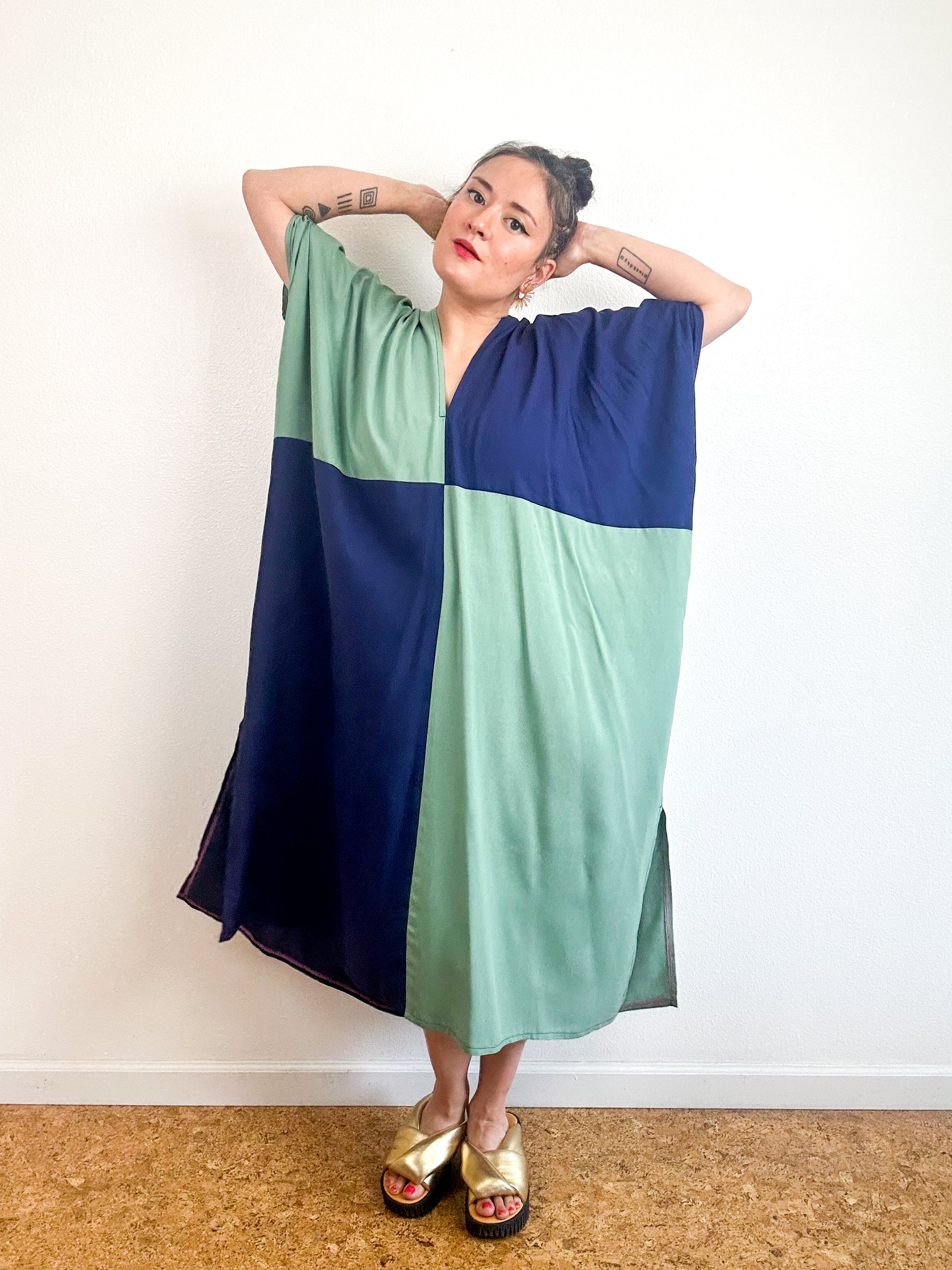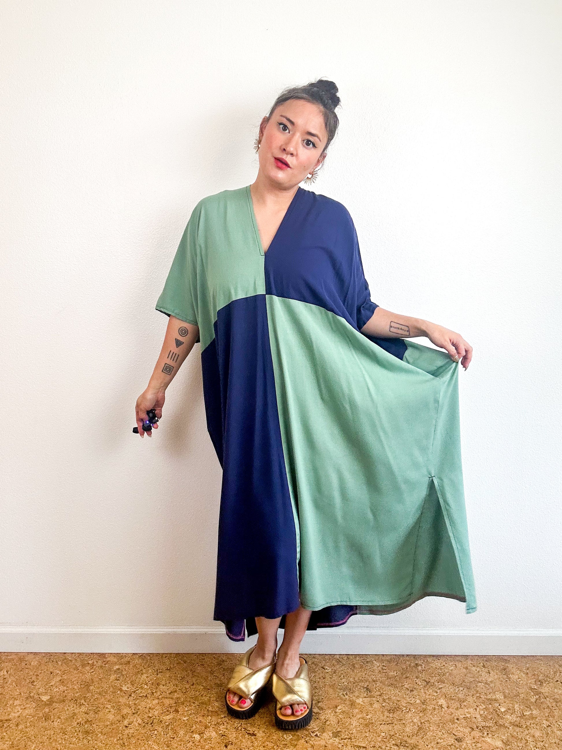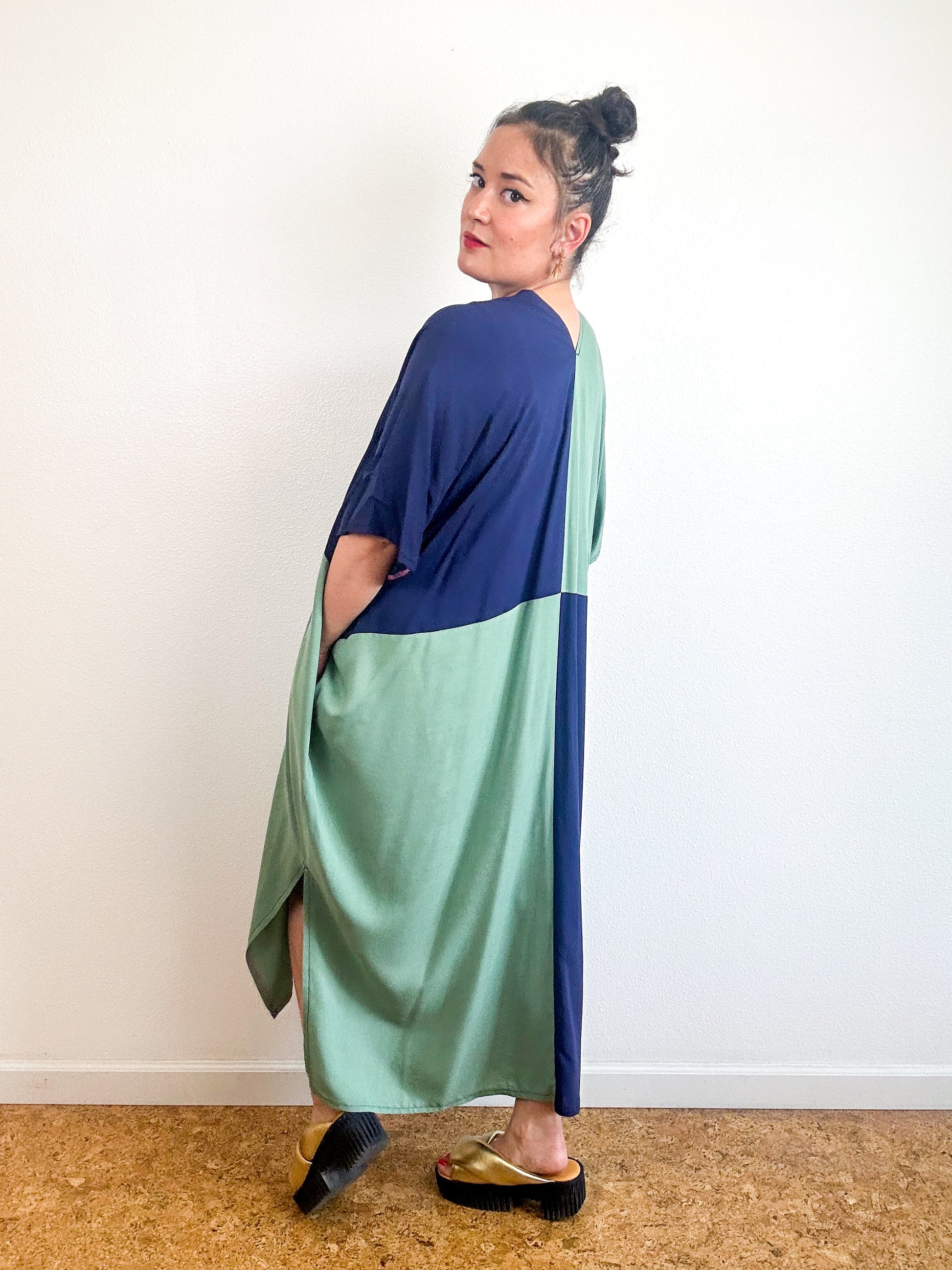 Color block caftan dress with an oversized silhouette, midi length, side slits and contrast side seam pockets. Minimalist design created from full rectangles of fabric produces zero material waste. Lightweight 100% bamboo rayon fabric in sage and navy.