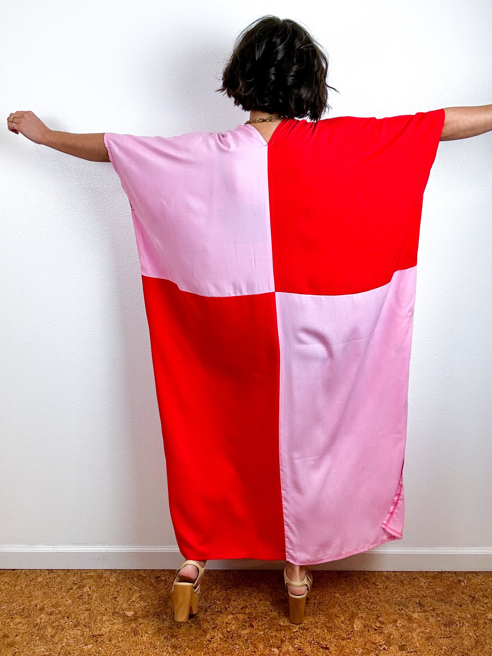 Color block caftan dress with an oversized silhouette, midi length, side slits and contrast side seam pockets. Minimalist design created from full rectangles of fabric produces zero material waste. Lightweight 100% bamboo rayon fabric in scarlet red and pink.