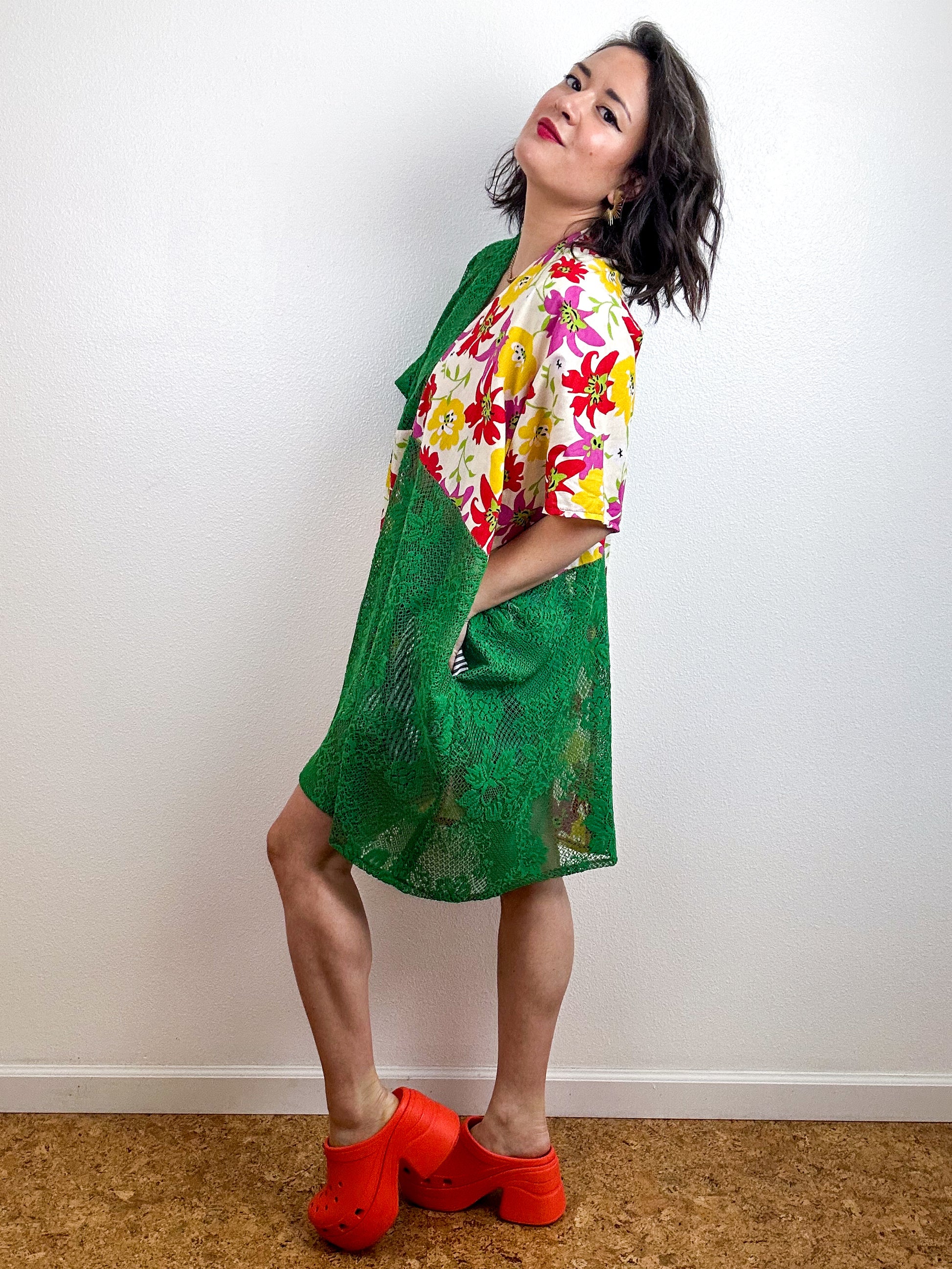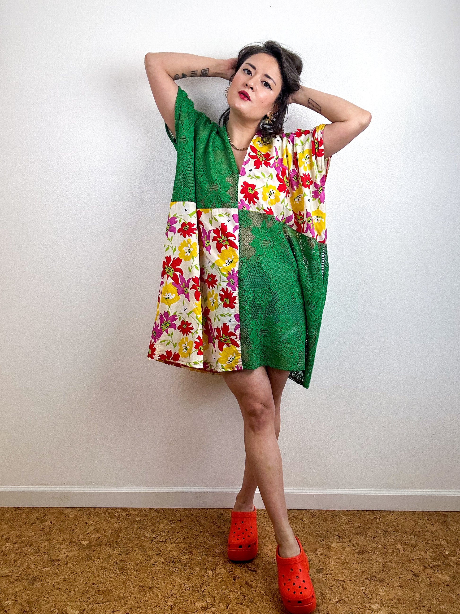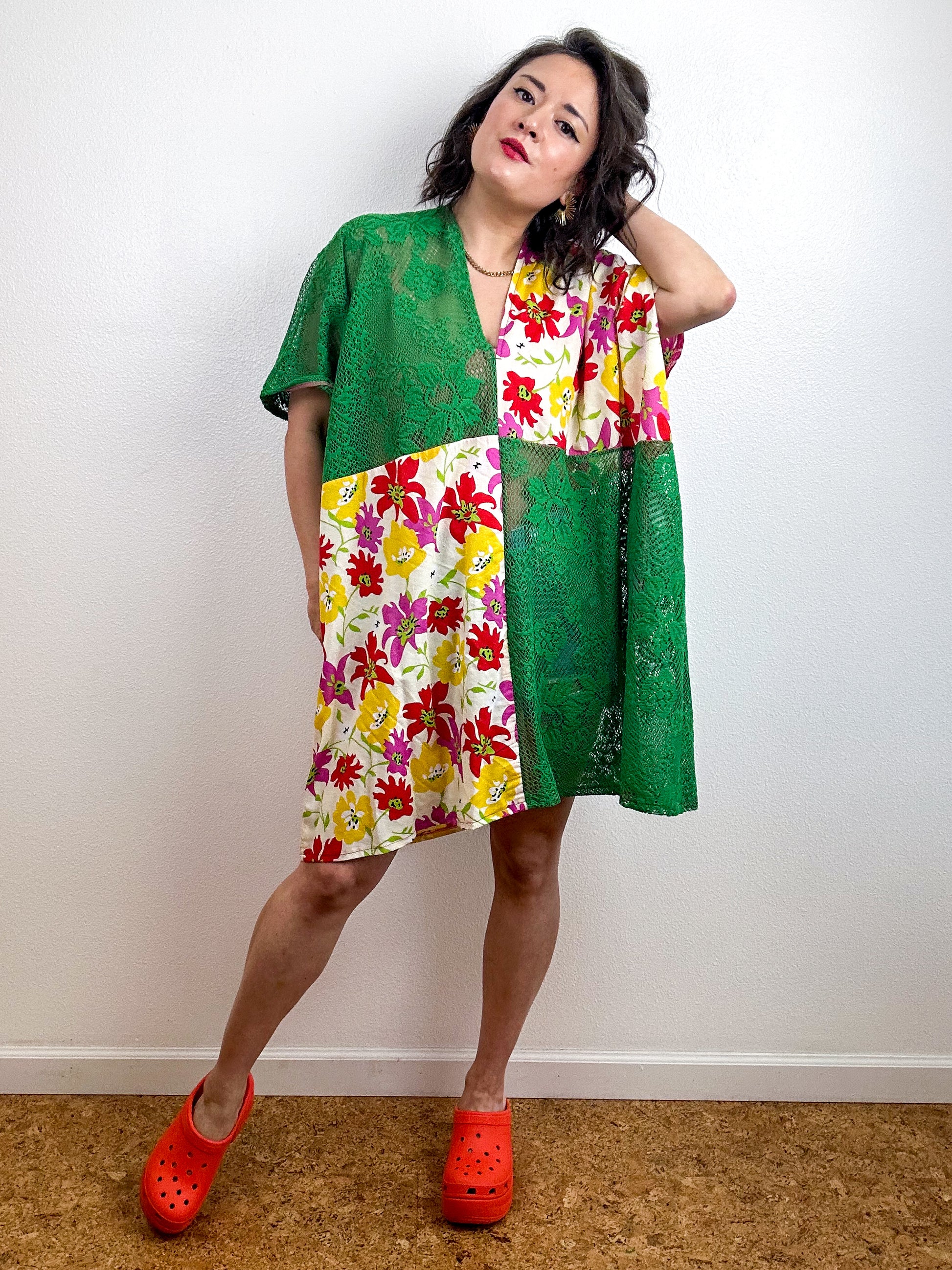 Color block caftan dress with an oversized silhouette, mini length, contrast stripe side seam pockets. Minimalist design created from full rectangles of fabric produces zero material waste. Vintage floral 100% cotton fabric mixed with vintage green soft lace.