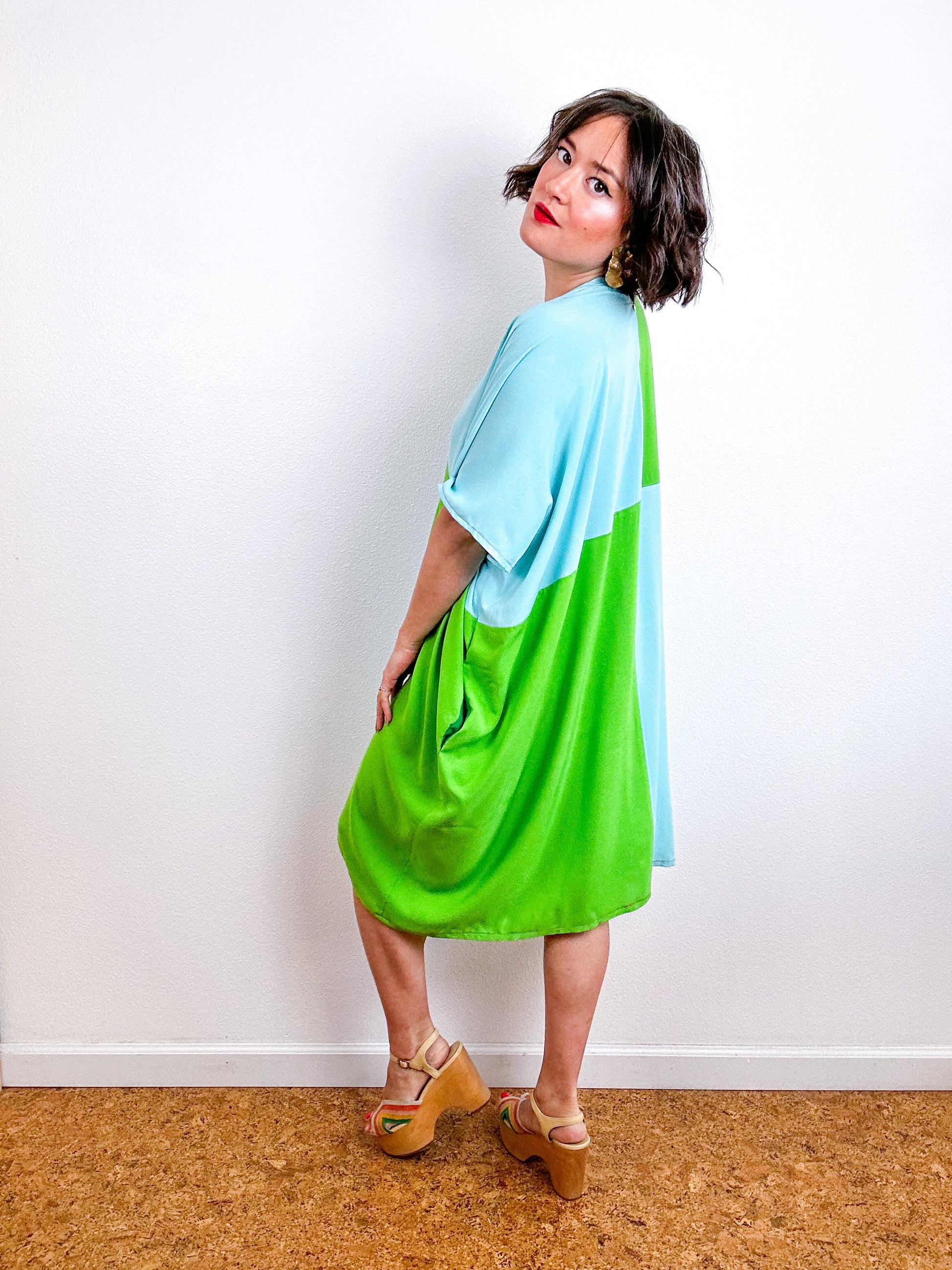 Color block caftan dress with an oversized silhouette, mini length and contrast side seam pockets. Minimalist design created from full rectangles of fabric produces zero material waste. Lightweight 100% bamboo rayon fabric in lime green and aqua.