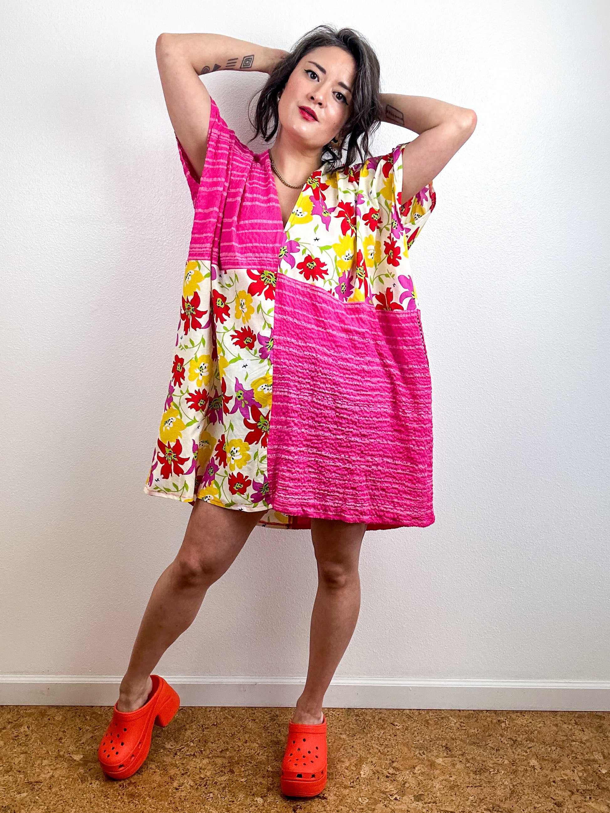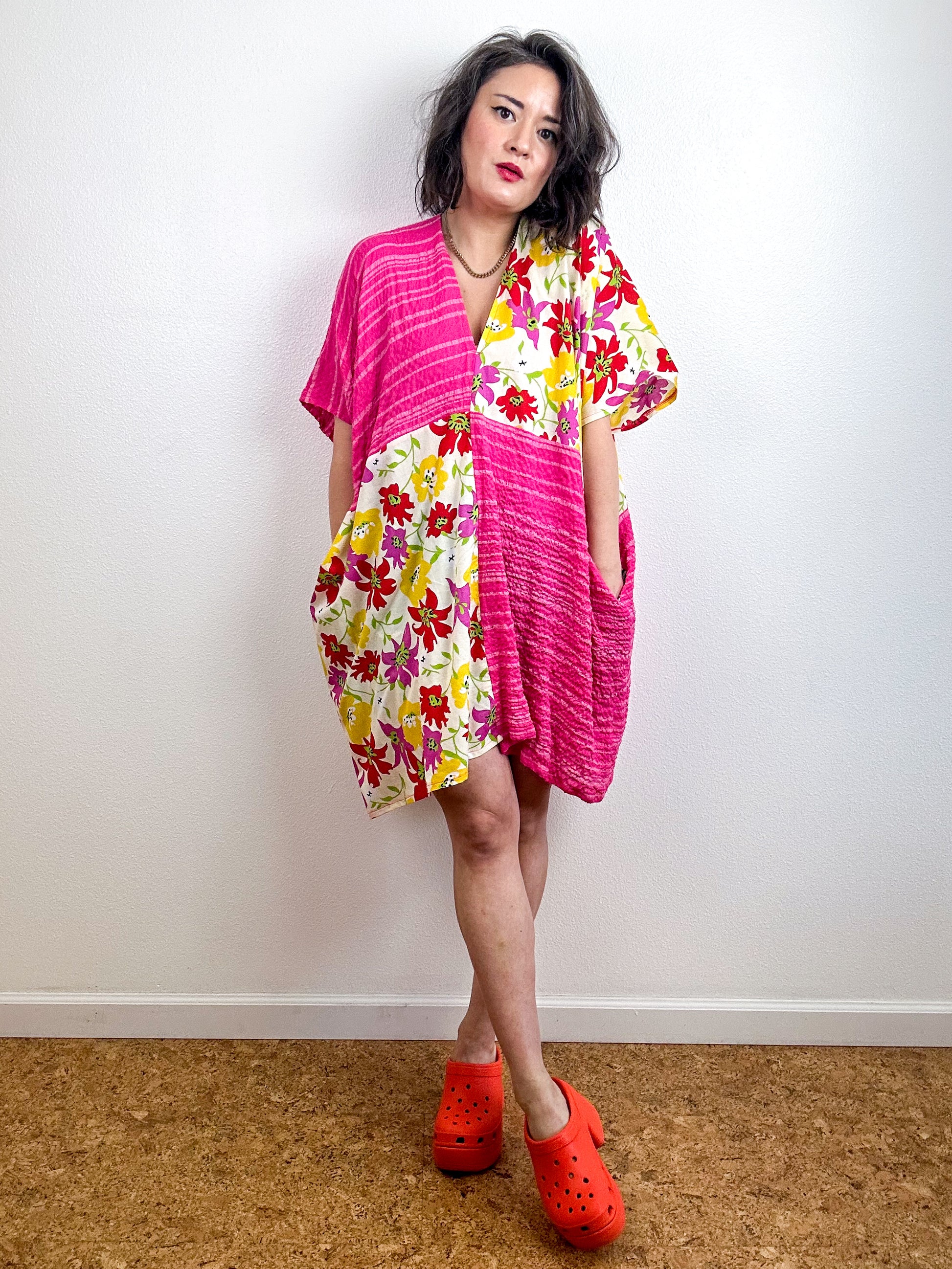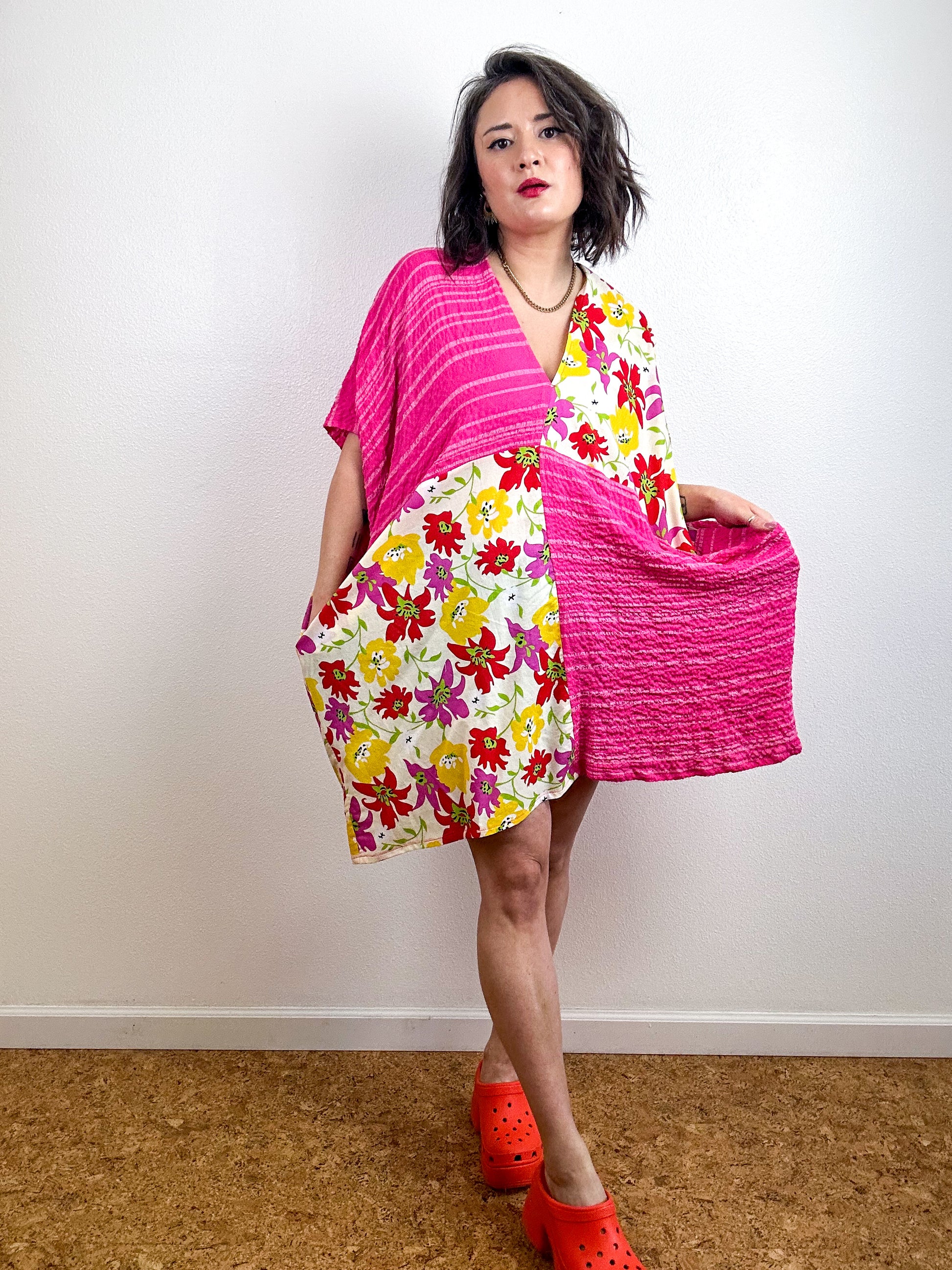 Color block caftan dress with an oversized silhouette, mini length, contrast stripe side seam pockets. Minimalist design created from full rectangles of fabric produces zero material waste. Vintage floral 100% cotton fabric mixed with textured pink stripe seersucker.