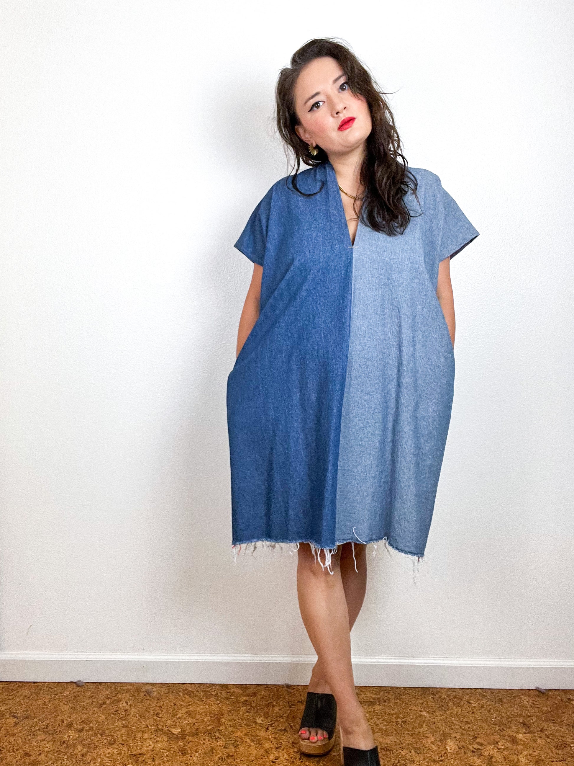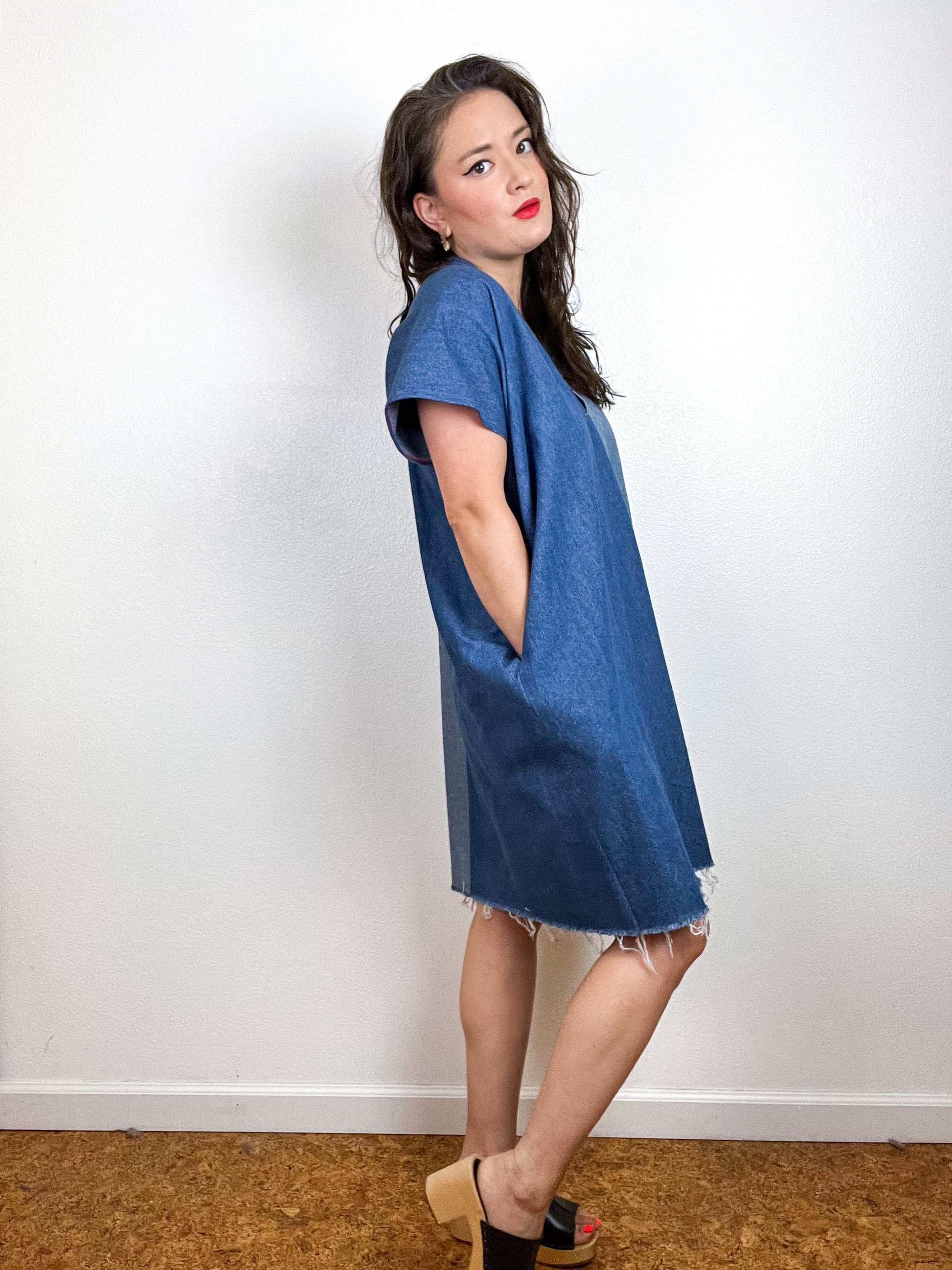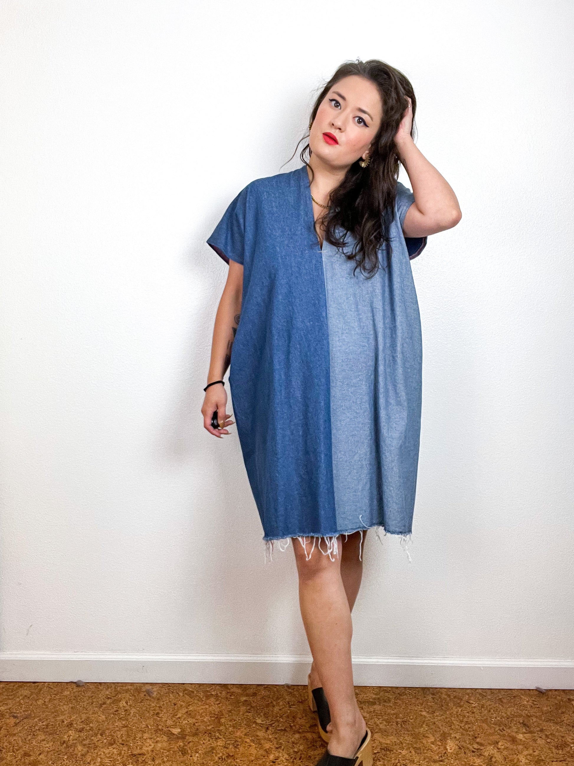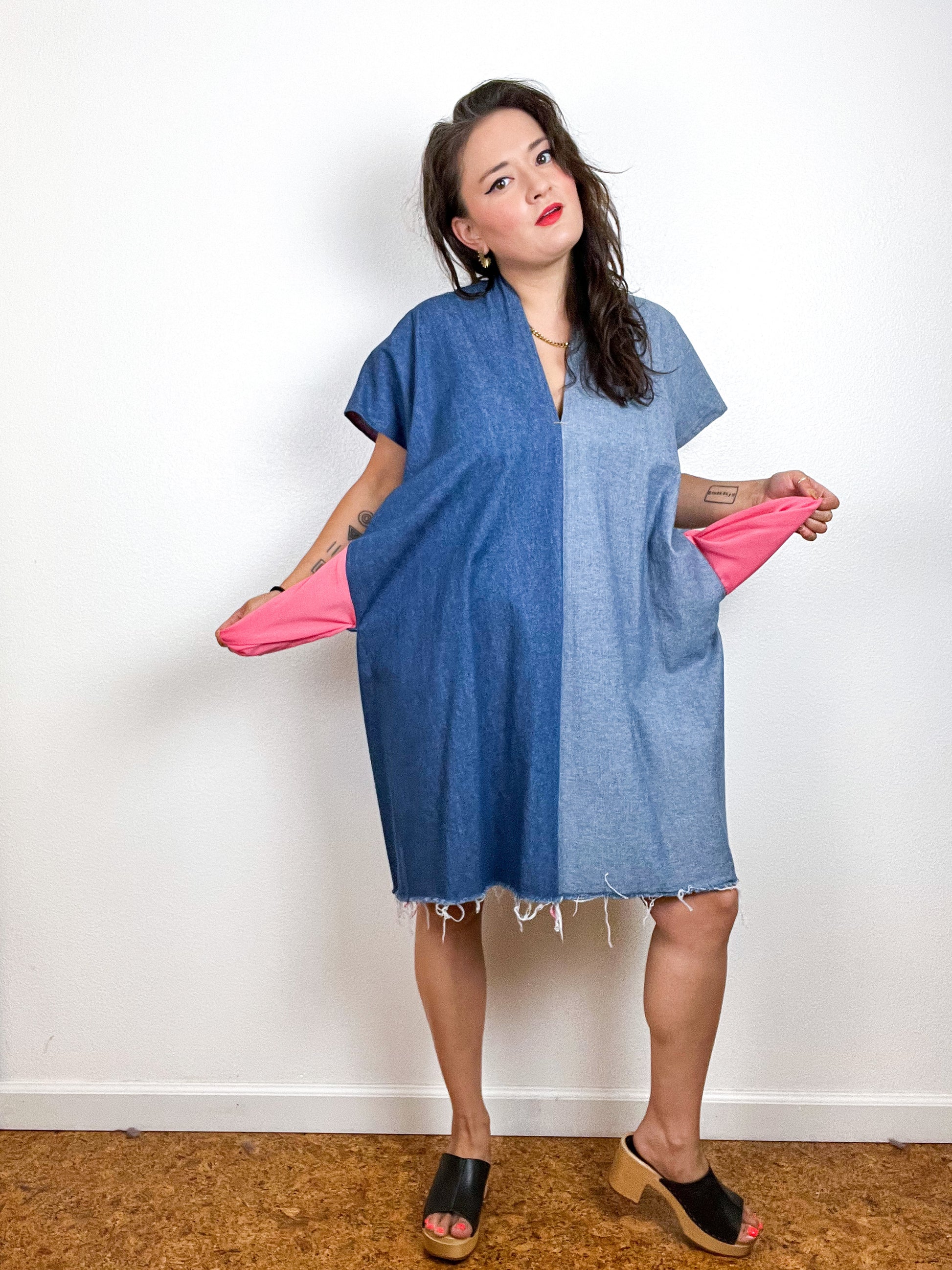 Denim smock dress with an oversized silhouette, slightly tapered hem, mini length, contrast pink pockets and raw fringe hem. Versatile shape can be styled as a dress or tunic. The minimalist design created from full rectangles of fabric produces little to no material waste. Medium weight 100% cotton denim utilizing face and reverse to create a two tone effect.