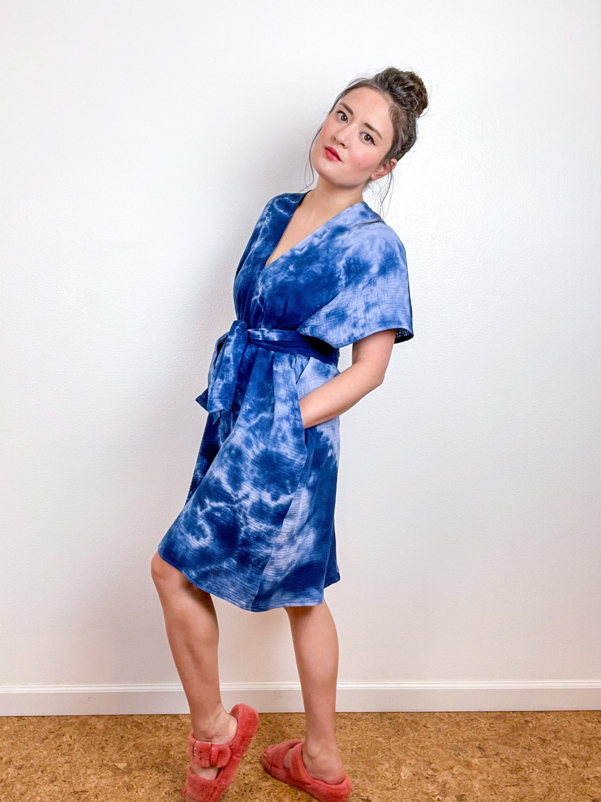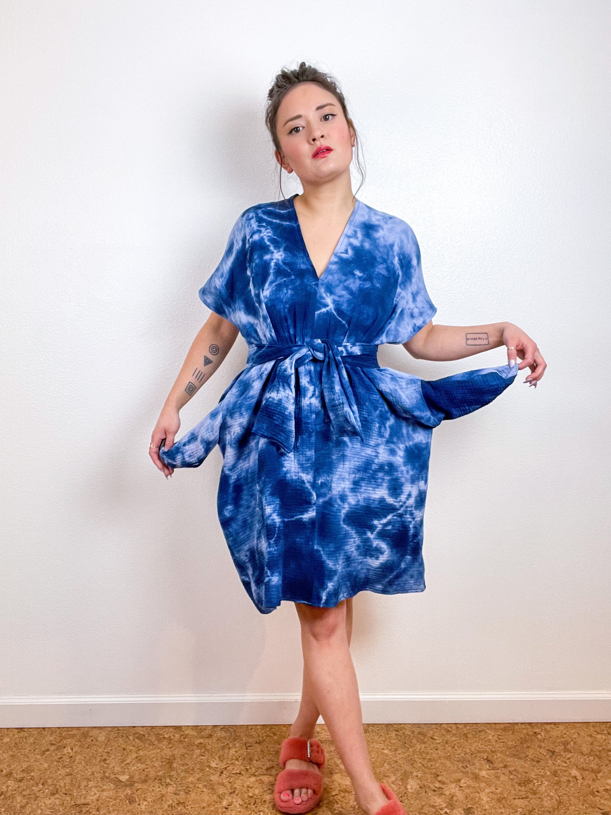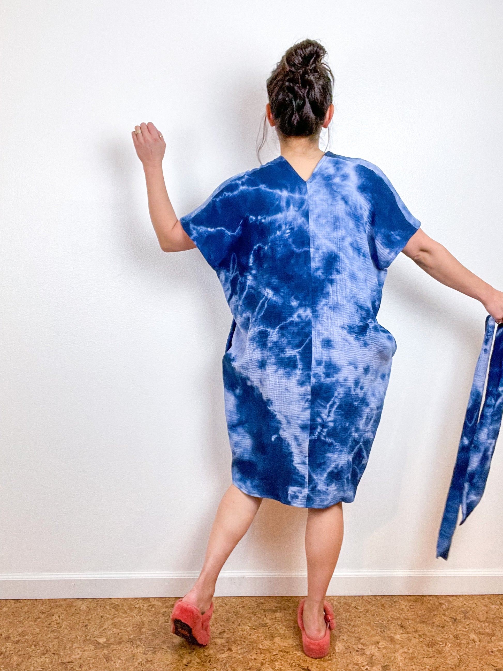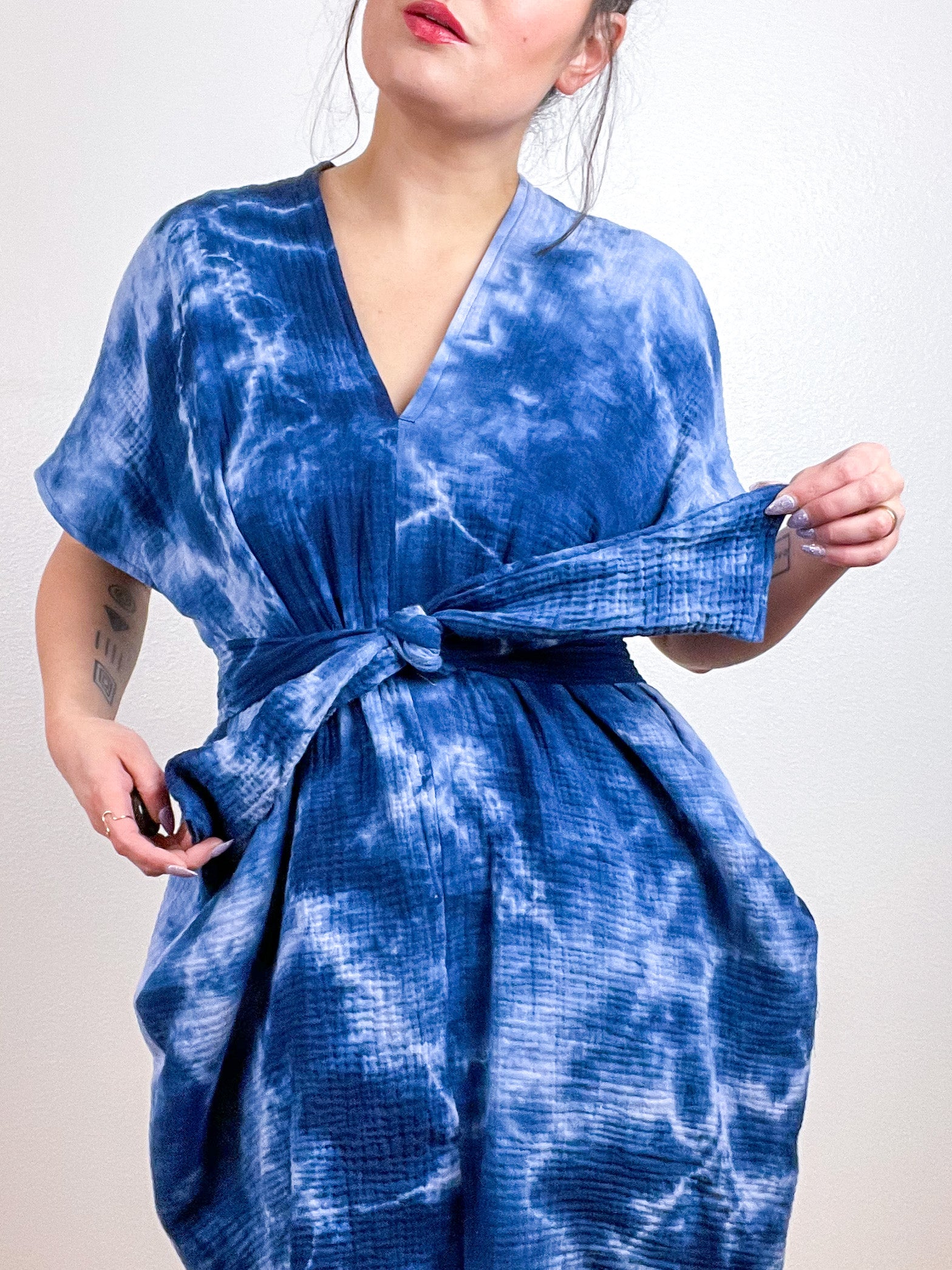 OOAK gauze caftan dress with an oversized silhouette, slightly tapered hem and nice deep pockets. Can be worn with included tie for a defined waist, or without for a more comfy look. Versatile shape can be styled as a dress or tunic over jeans or leggings. The minimalist design created from full rectangles of fabric produces little to no material waste. Lightweight 100% cotton double gauze fabric is hand-dyed in Royal blue with tie dye.