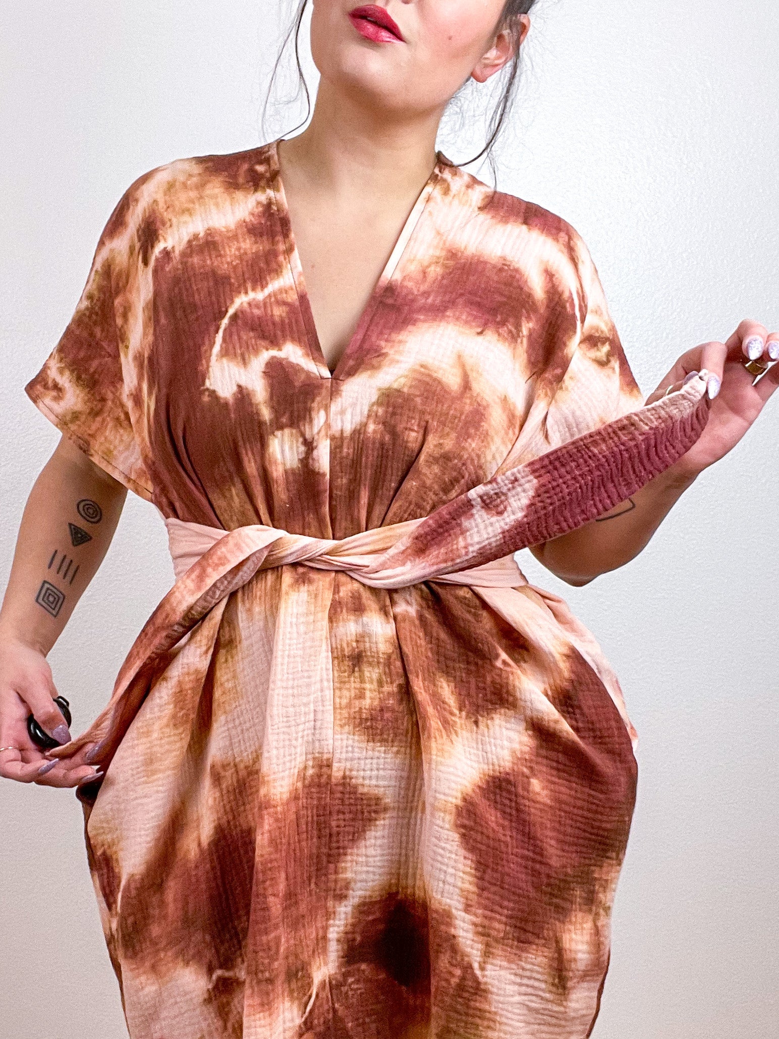 OOAK gauze caftan dress with an oversized silhouette, slightly tapered hem and nice deep pockets. Can be worn with included tie for a defined waist, or without for a more comfy look. Versatile shape can be styled as a dress or tunic over jeans or leggings. The minimalist design created from full rectangles of fabric produces little to no material waste. Lightweight 100% cotton double gauze fabric is hand-dyed in terracotta with tie dye.