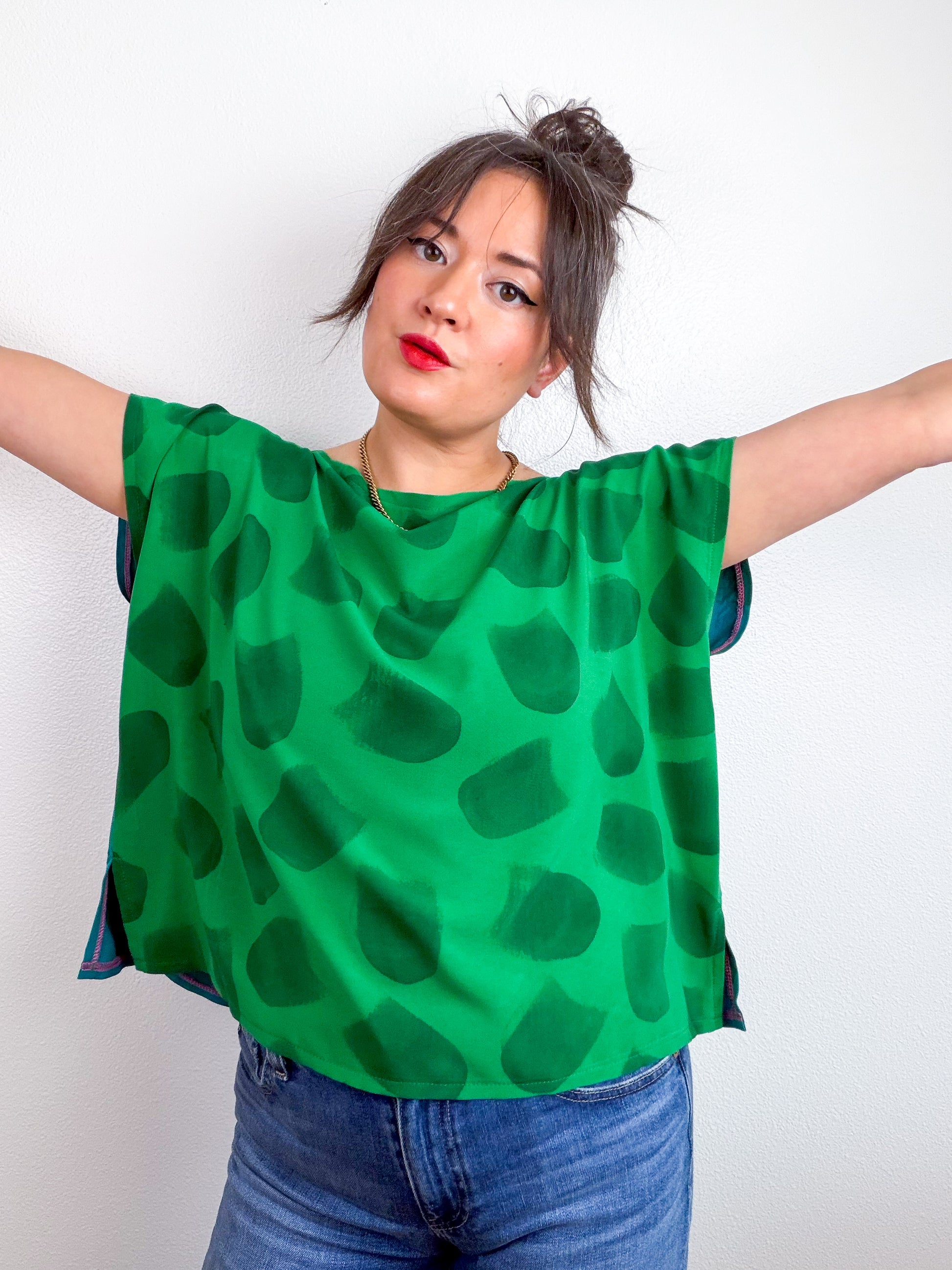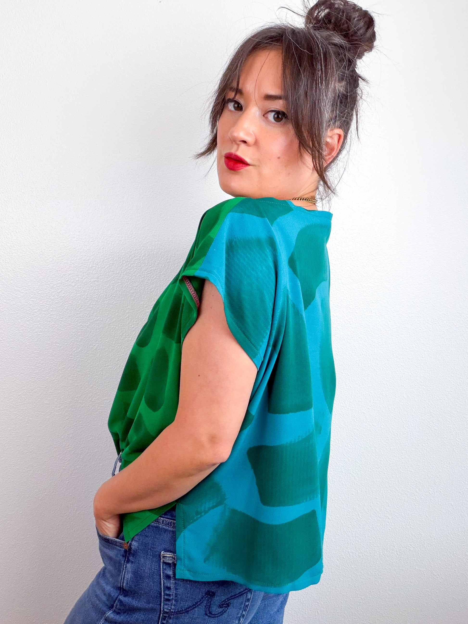 Light and airy bamboo crop top in turquoise and green brushstrokes. High boat neckline, side slits, wide flouncy fit, contrast pink stitching, flippable design.