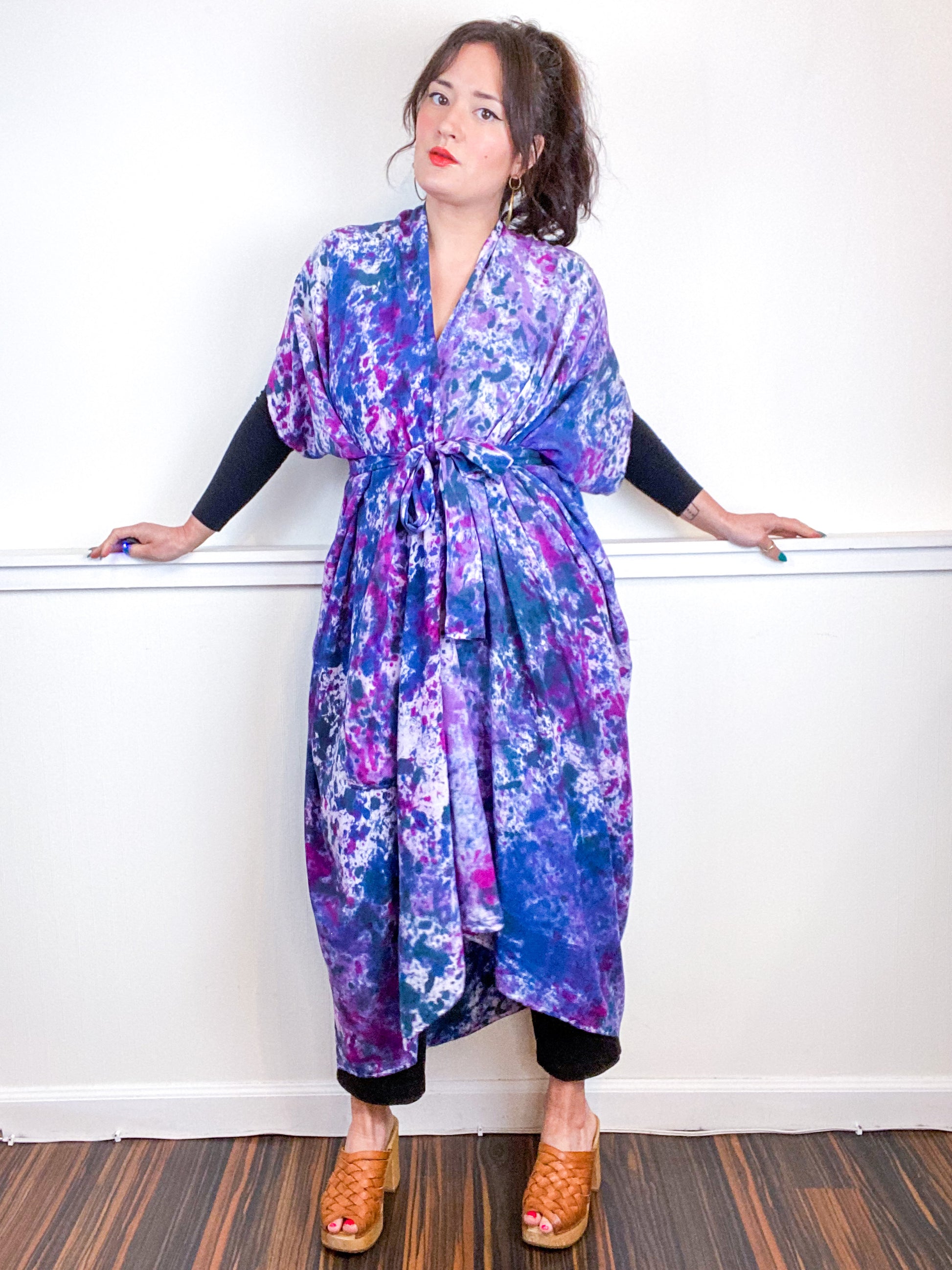 Hand-Dyed High Low Kimono Amethyst Orchid Indigo Teal Speckle