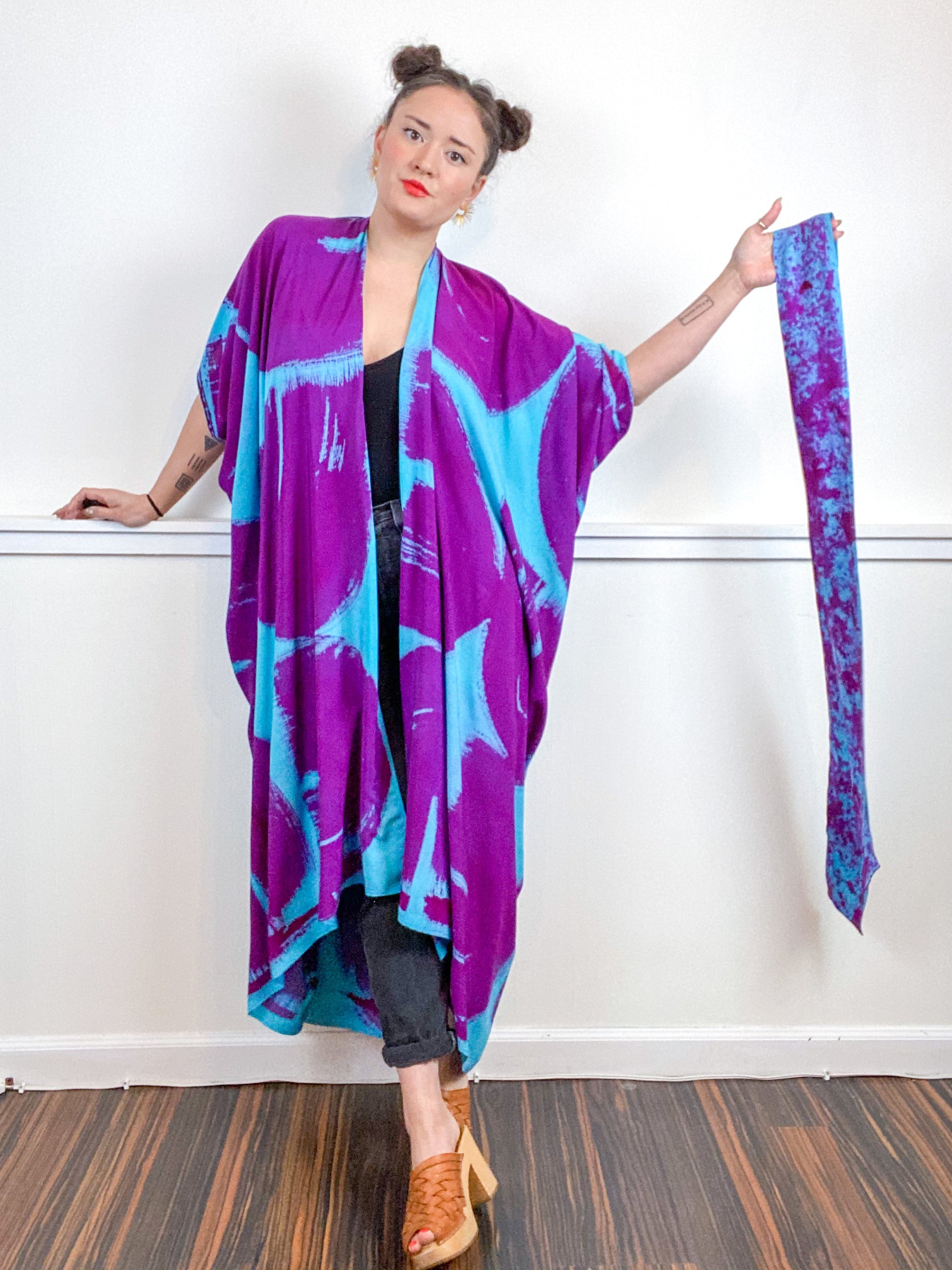 Soft and airy kimono with a flowing silhouette, tulip sleeve detail, curved high low hem and separate waist tie. Versatile shape can be styled as a wrap dress, an open kimono without the tie, or a robe for staying home. The minimalist design created from a full rectangle of fabric drapes beautifully over the shoulders and produces no material waste by utilizing one whole piece of fabric without scraps from corners and irregular cuts. Lightweight woven aqua fabric is hand-dyed with fuchsia algae thickened dye using a gestural brushstroke technique.
