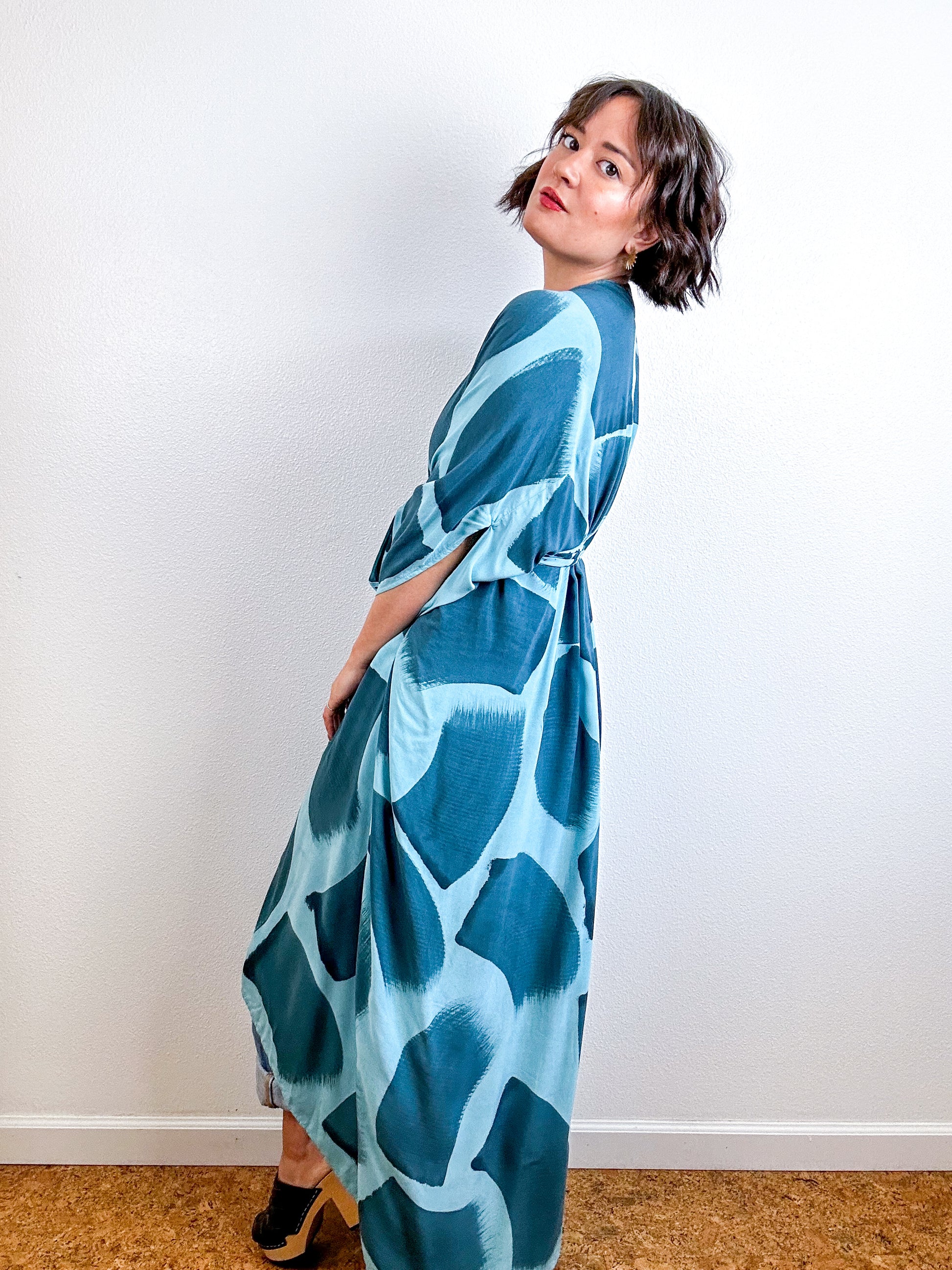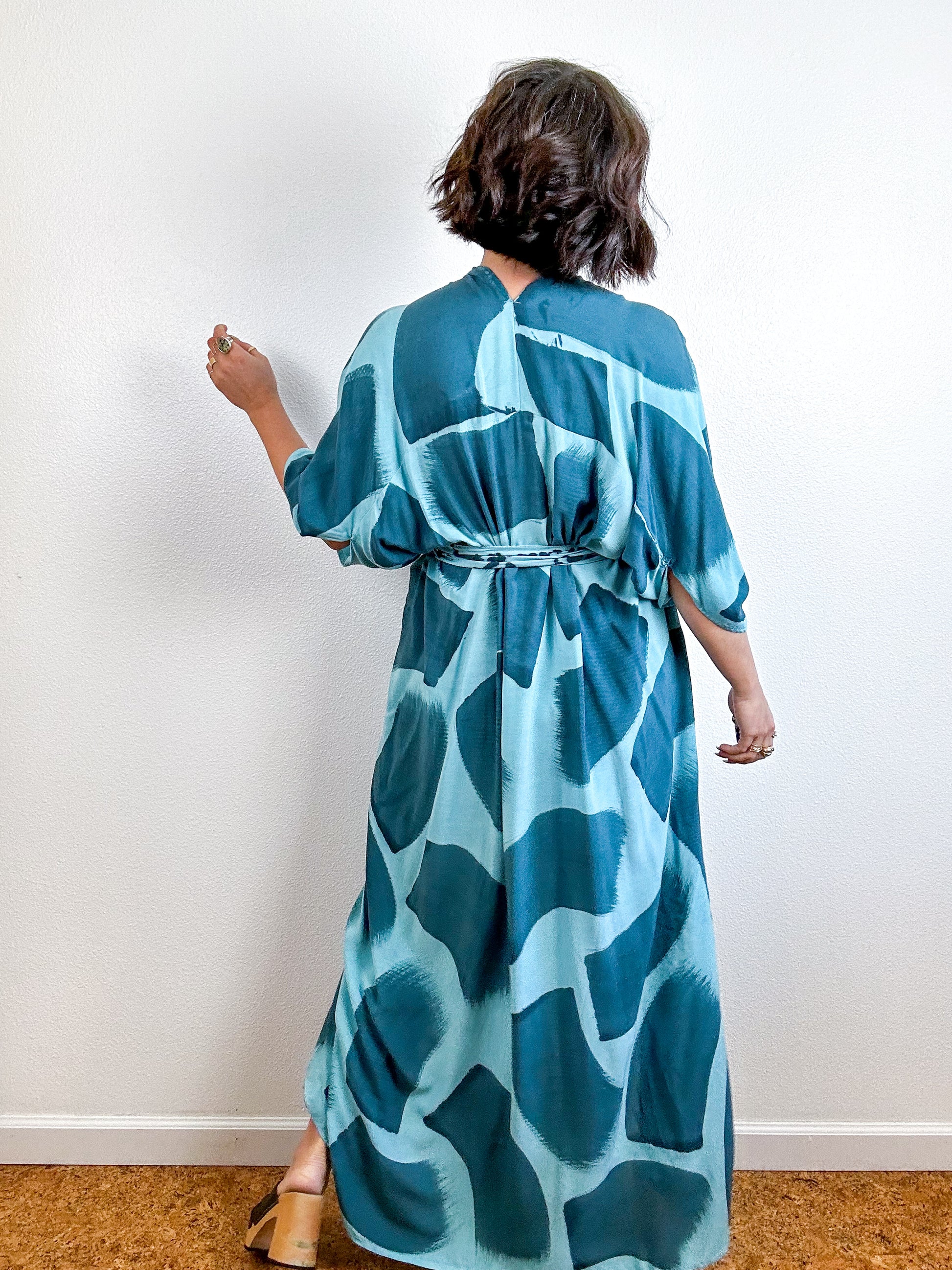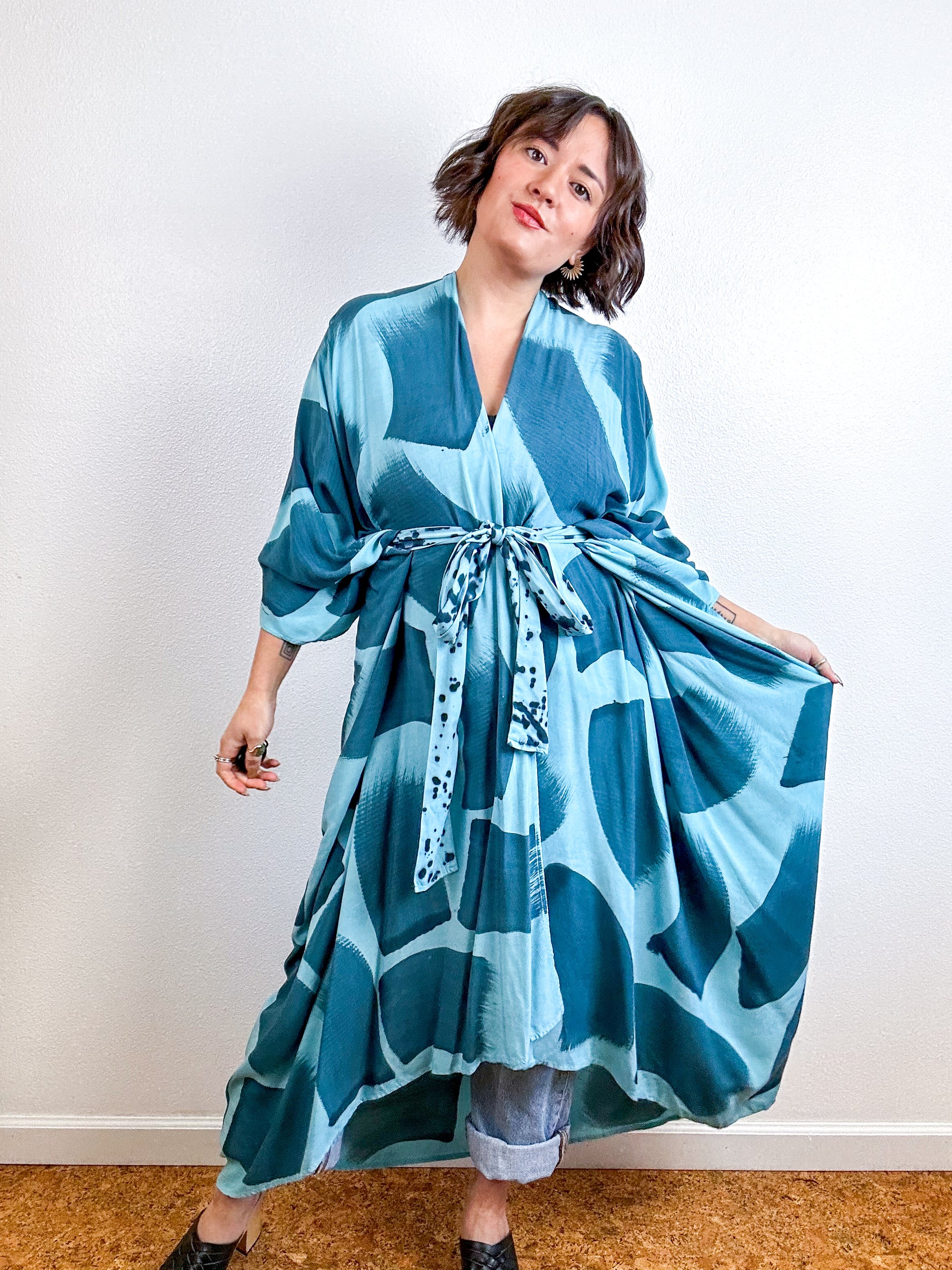 Soft and airy kimono with a flowing silhouette, tulip sleeve detail, curved high low hem and separate waist tie. Versatile shape can be styled as a wrap dress, an open kimono without the tie, or a robe for staying home. The minimalist design created from a full rectangle of fabric drapes beautifully over the shoulders and produces no material waste by utilizing one whole piece of fabric without scraps from corners and irregular cuts. Lightweight woven aqua fabric is hand-dyed with teal algae thickened dye using a gestural brushstroke technique.