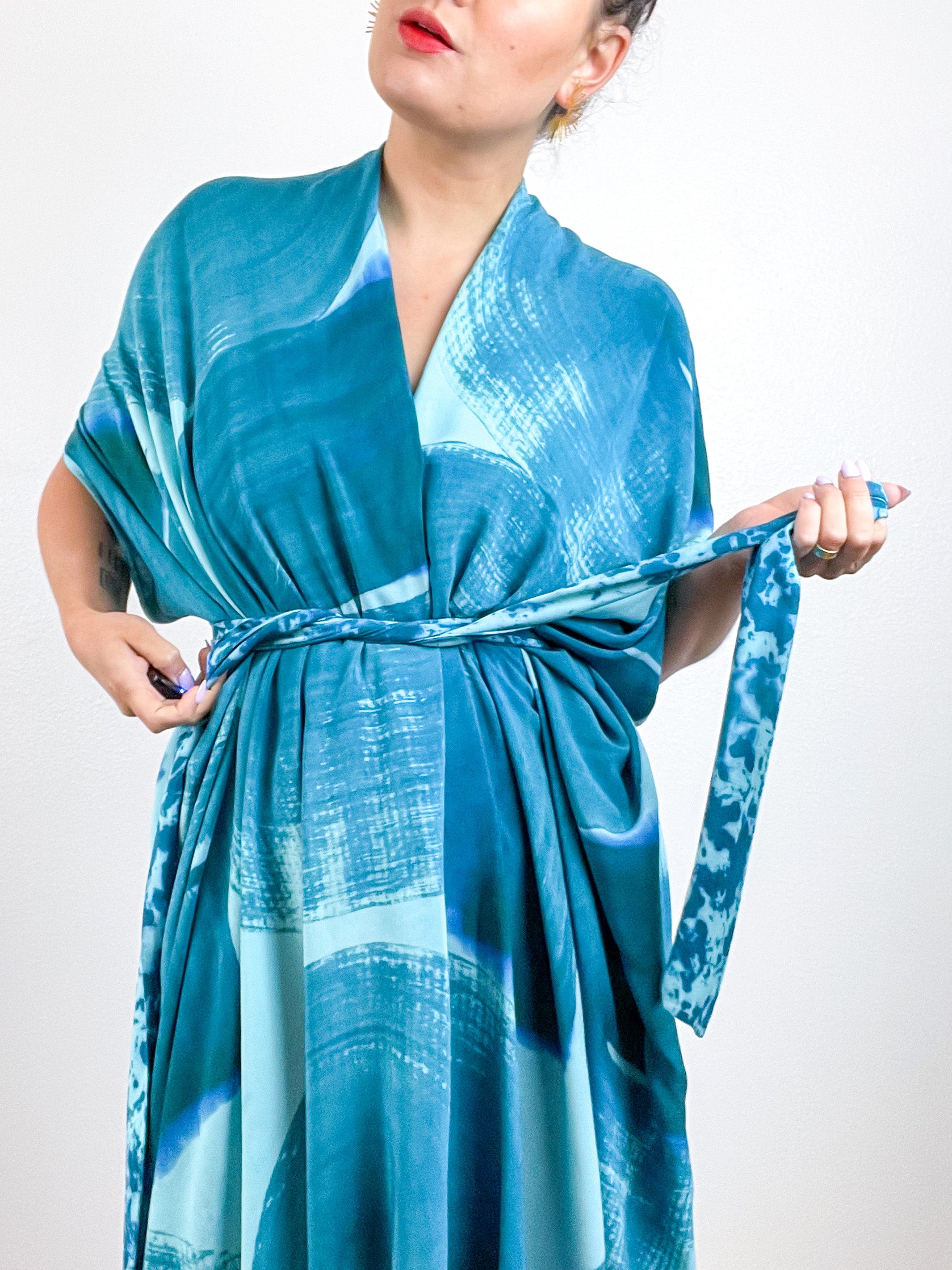Soft and airy kimono with a flowing silhouette, tulip sleeve detail, curved high low hem and separate waist tie. Versatile shape can be styled as a wrap dress, an open kimono without the tie, or a robe for staying home. The minimalist design created from a full rectangle of fabric drapes beautifully over the shoulders and produces no material waste by utilizing one whole piece of fabric without scraps from corners and irregular cuts. Lightweight woven aqua fabric is hand-dyed with teal algae thickened dye using a gestural brushstroke technique.