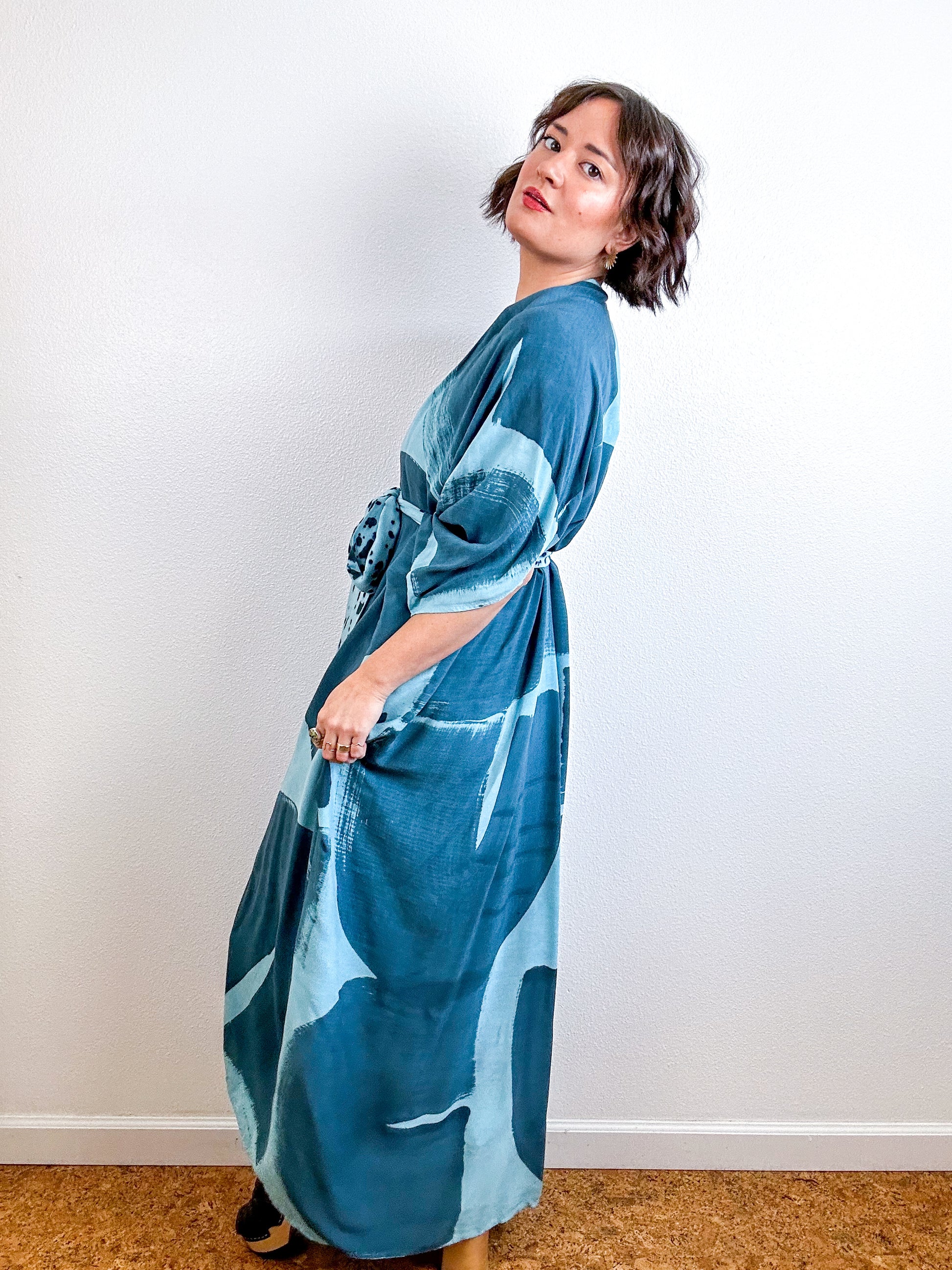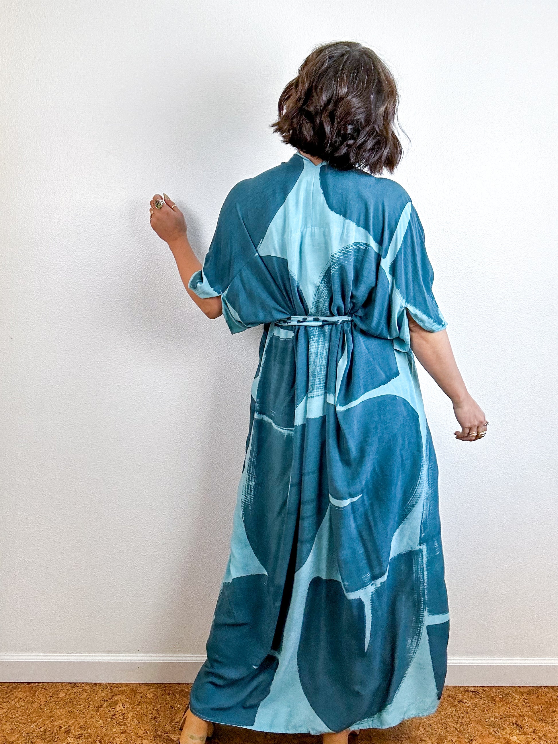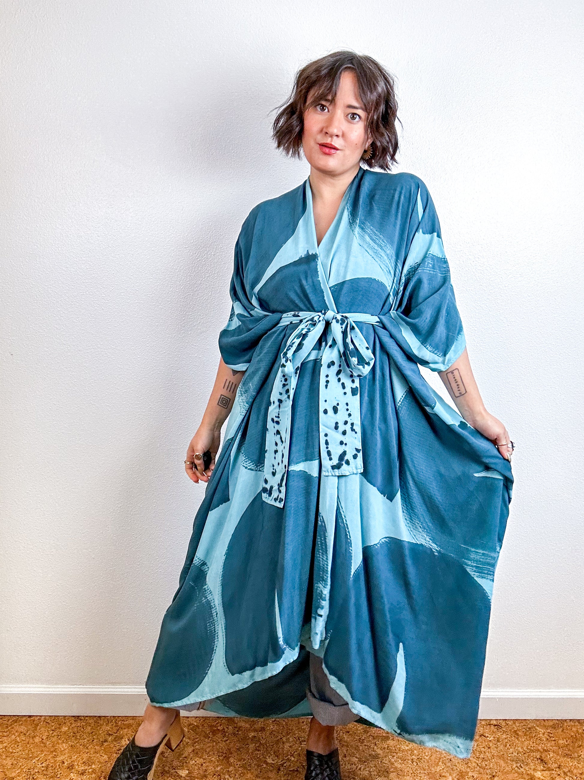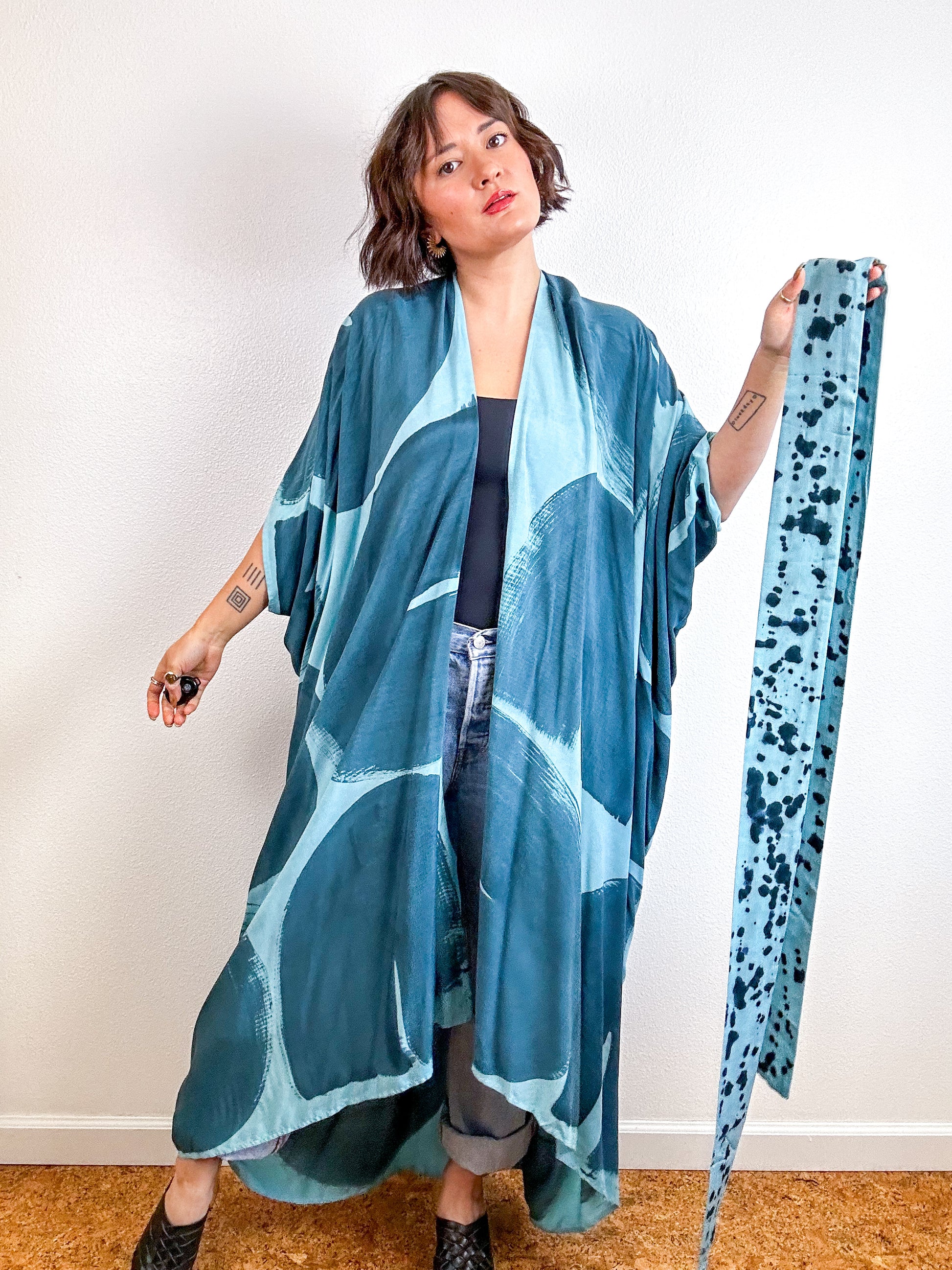 Soft and airy kimono with a flowing silhouette, tulip sleeve detail, curved high low hem and separate waist tie. Versatile shape can be styled as a wrap dress, an open kimono without the tie, or a robe for staying home. The minimalist design created from a full rectangle of fabric drapes beautifully over the shoulders and produces no material waste by utilizing one whole piece of fabric without scraps from corners and irregular cuts. Lightweight woven aqua fabric is hand-dyed with teal algae thickened dye using a gestural brushstroke technique.