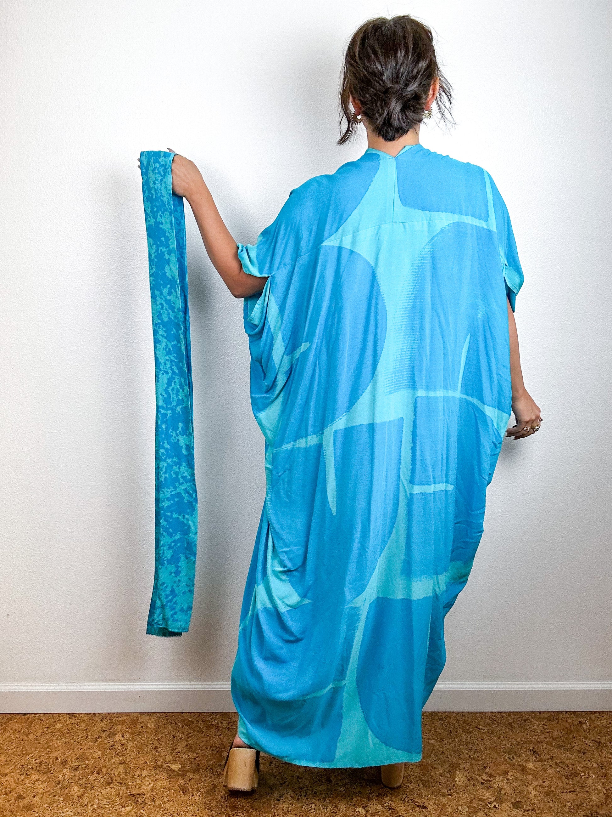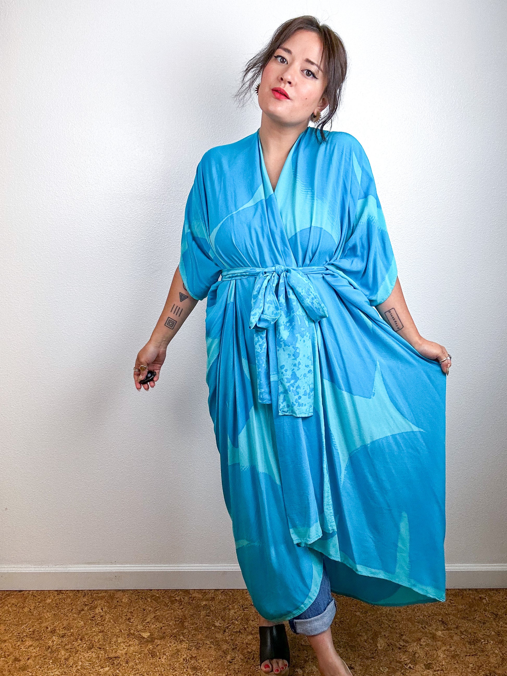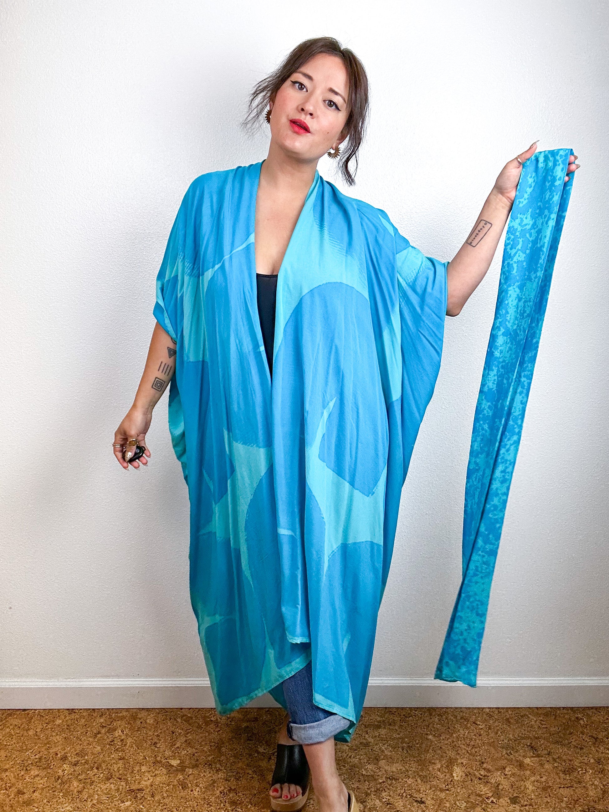 Soft and airy kimono with a flowing silhouette, tulip sleeve detail, curved high low hem and separate waist tie. Versatile shape can be styled as a wrap dress, an open kimono without the tie, or a robe for staying home. The minimalist design created from a full rectangle of fabric drapes beautifully over the shoulders and produces no material waste by utilizing one whole piece of fabric without scraps from corners and irregular cuts. Lightweight woven aqua fabric is hand-dyed with turquoise algae thickened dye using a gestural brushstroke technique.
