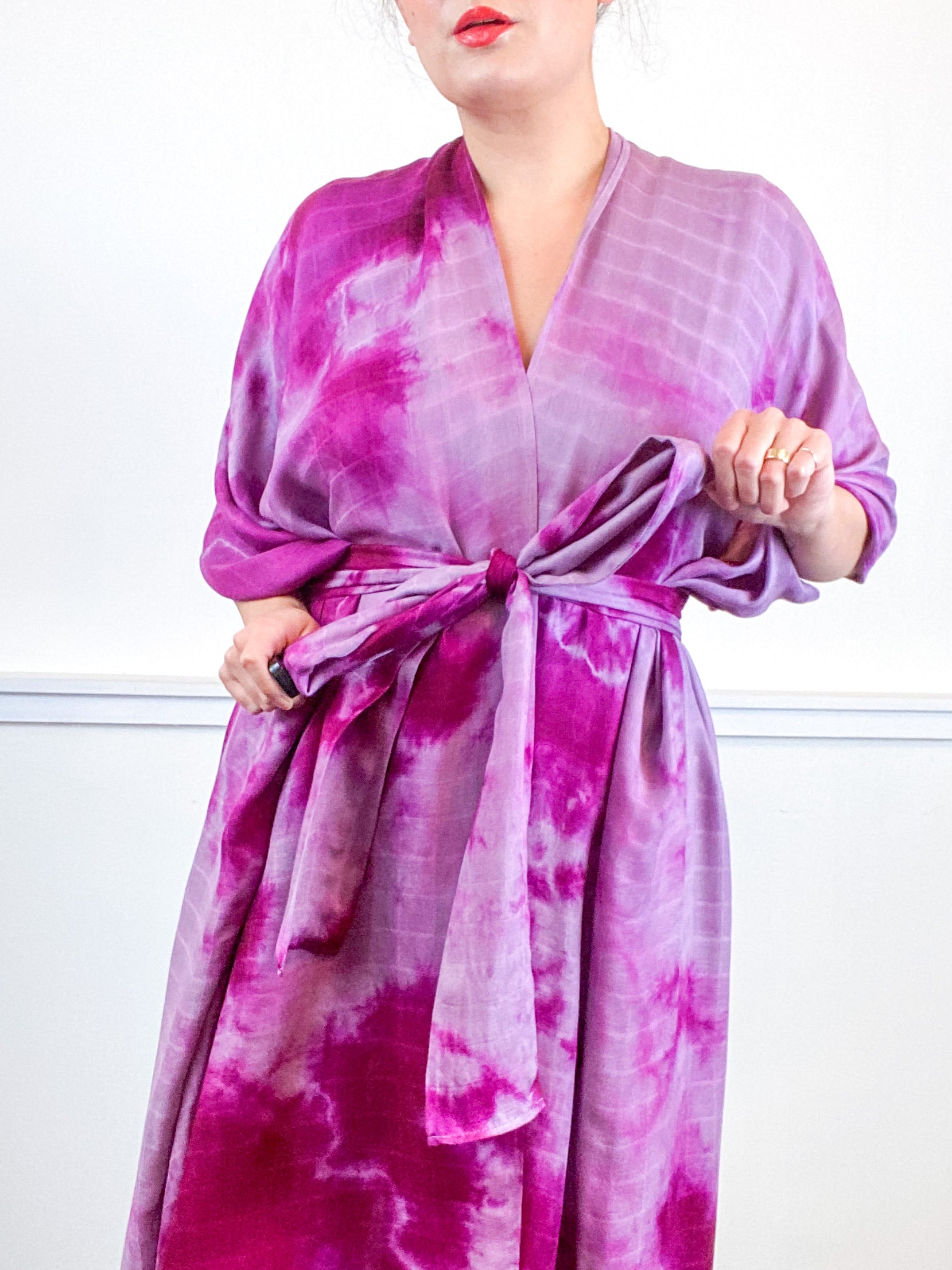 Soft and airy kimono with a flowing silhouette, fringed selvage sleeve detail, curved high low hem and optional waist tie. Versatile shape can be styled as a wrap dress, lightweight jacket over jeans, or an elegant robe over lingerie. The minimalist design created from a full rectangle of fabric drapes beautifully over the shoulders and produces no material waste by utilizing one whole piece of fabric without scraps from corners and irregular cuts. Lightweight grey bamboo fabric with subtle square pattern weave is hand-dyed in a vibrant amethyst color with a low water tie technique.