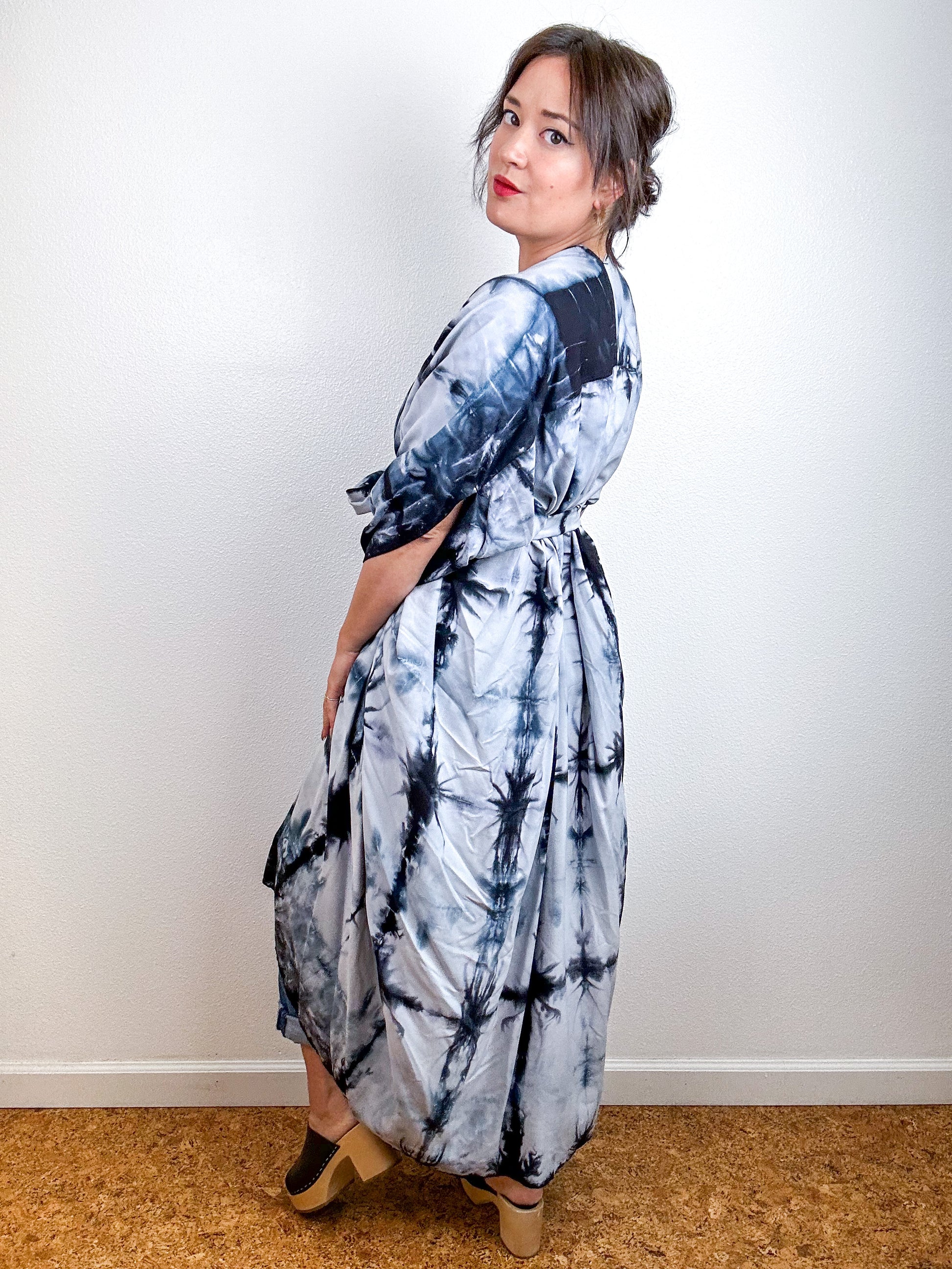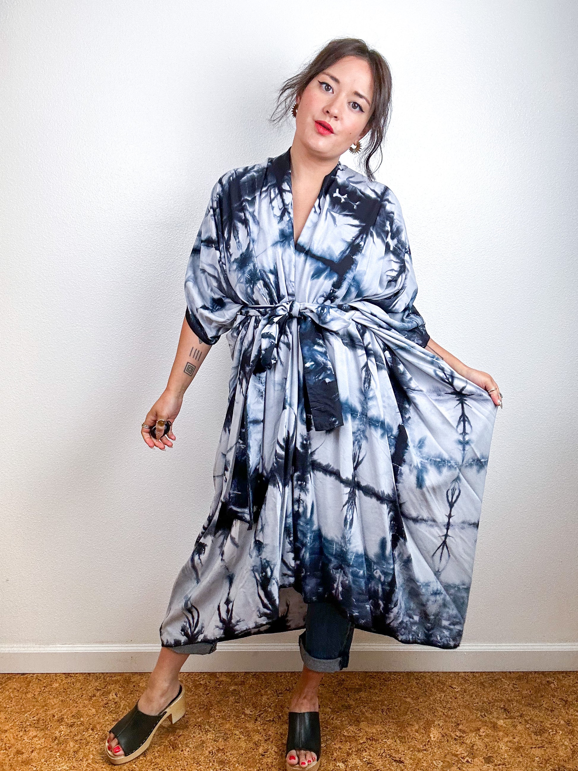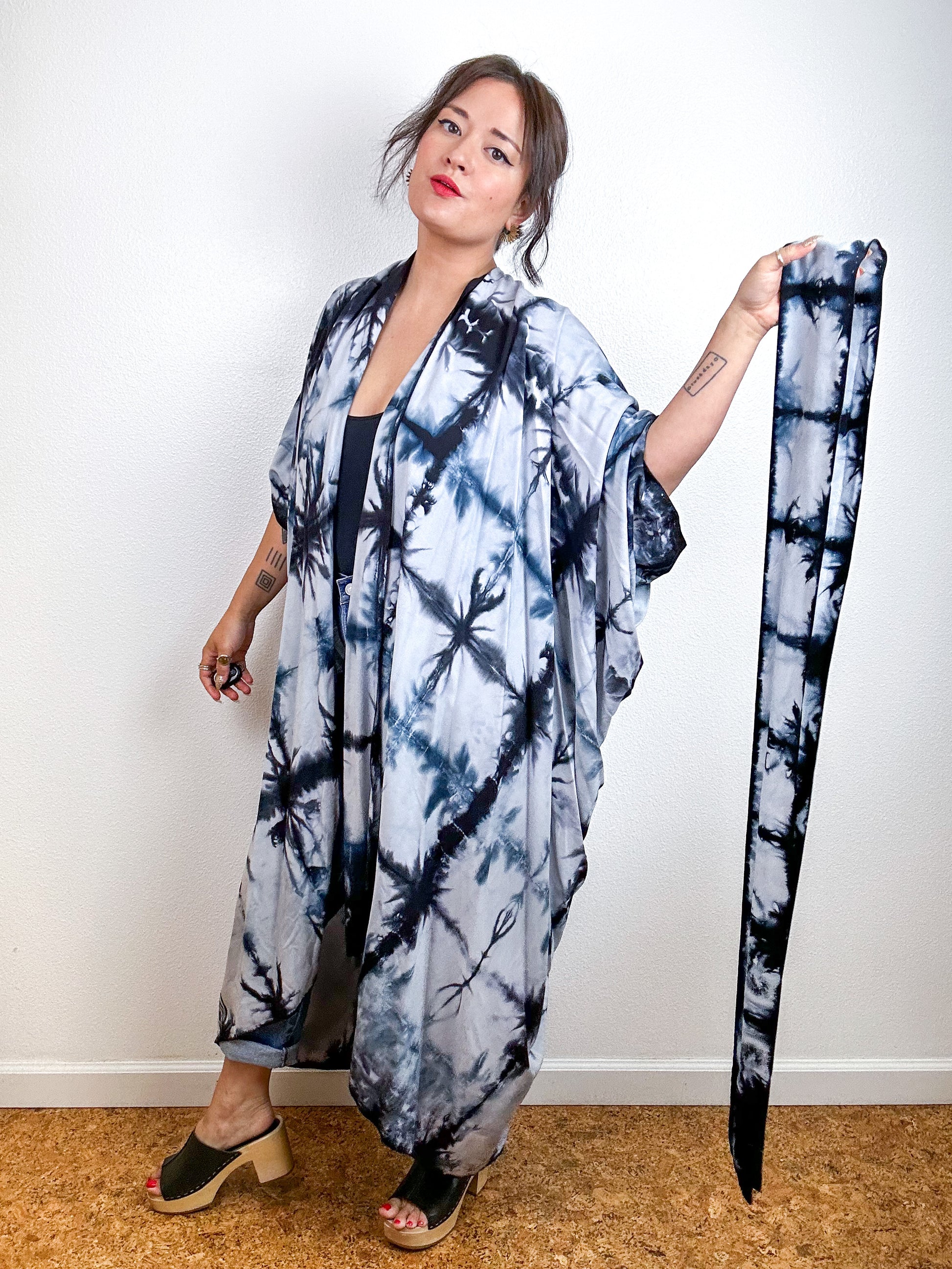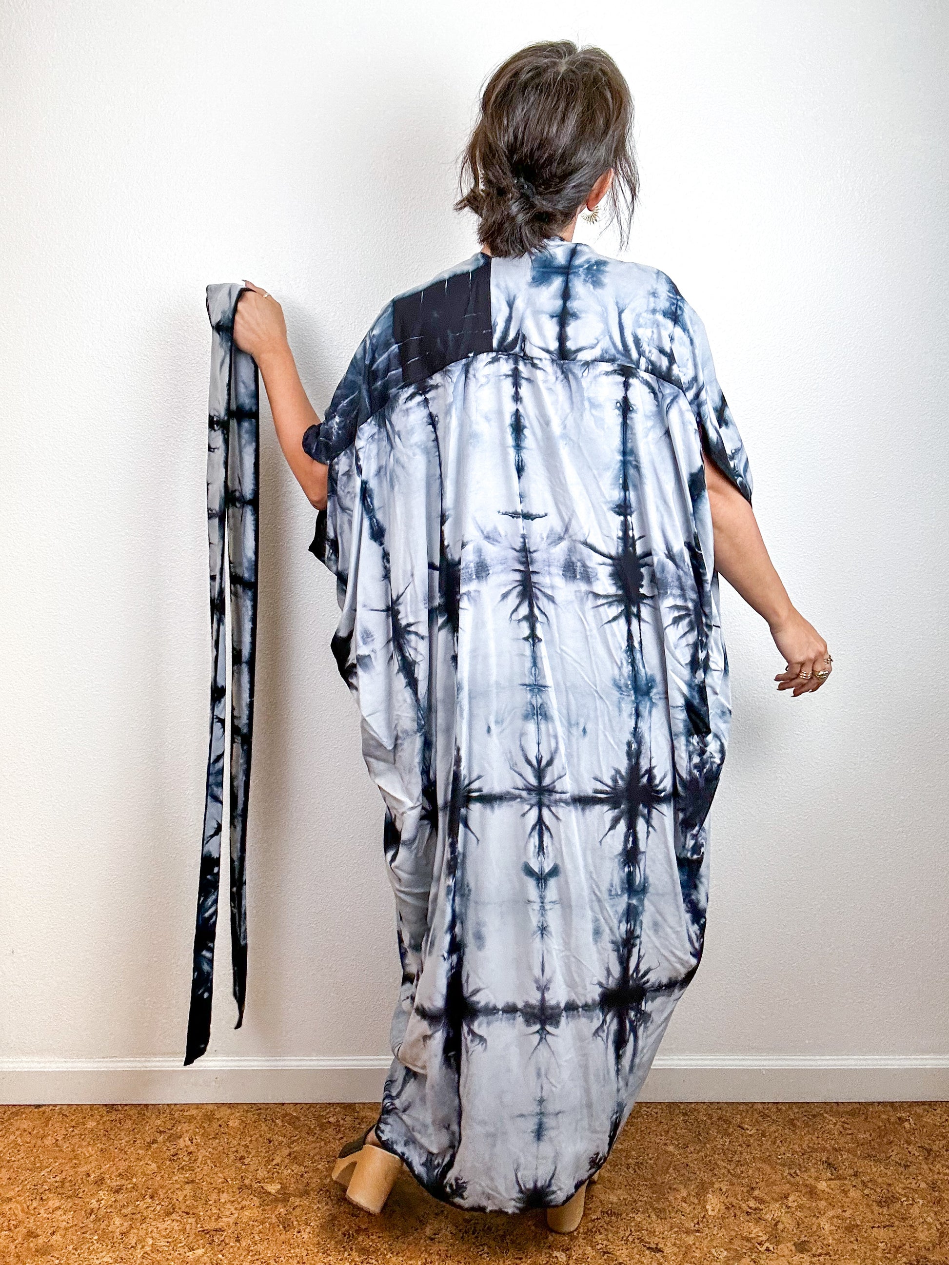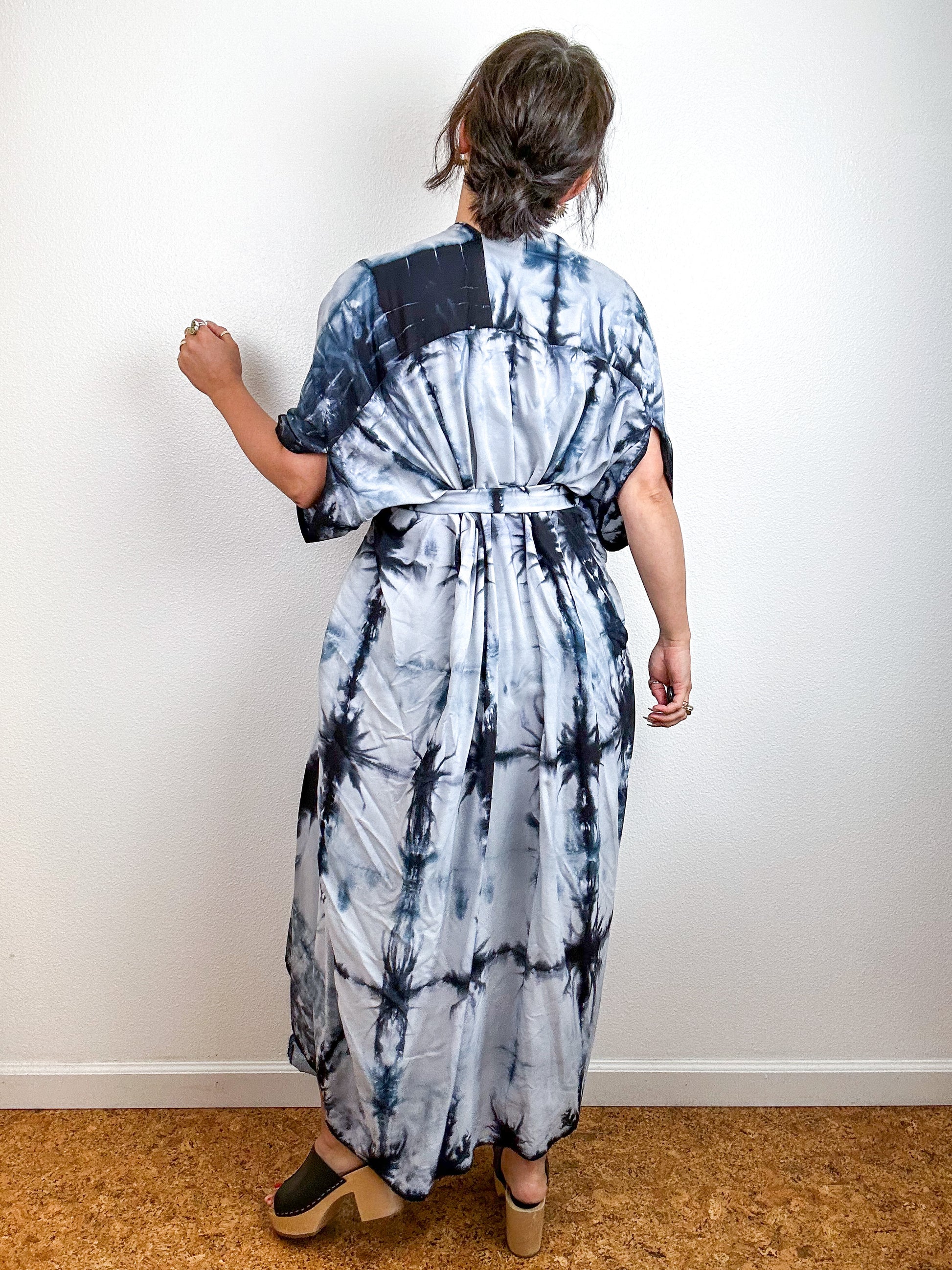 Soft and airy kimono with a flowing silhouette, tulip sleeve detail, curved high low hem and optional waist tie. Versatile shape can be styled as a wrap dress, lightweight jacket over jeans, or an elegant robe over lingerie. The minimalist design created from a full rectangle of fabric drapes beautifully over the shoulders and produces no material waste by utilizing one whole piece of fabric without scraps from corners and irregular cuts. Lightweight woven fabric is hand-dyed in a blue black color with a low water tie technique.