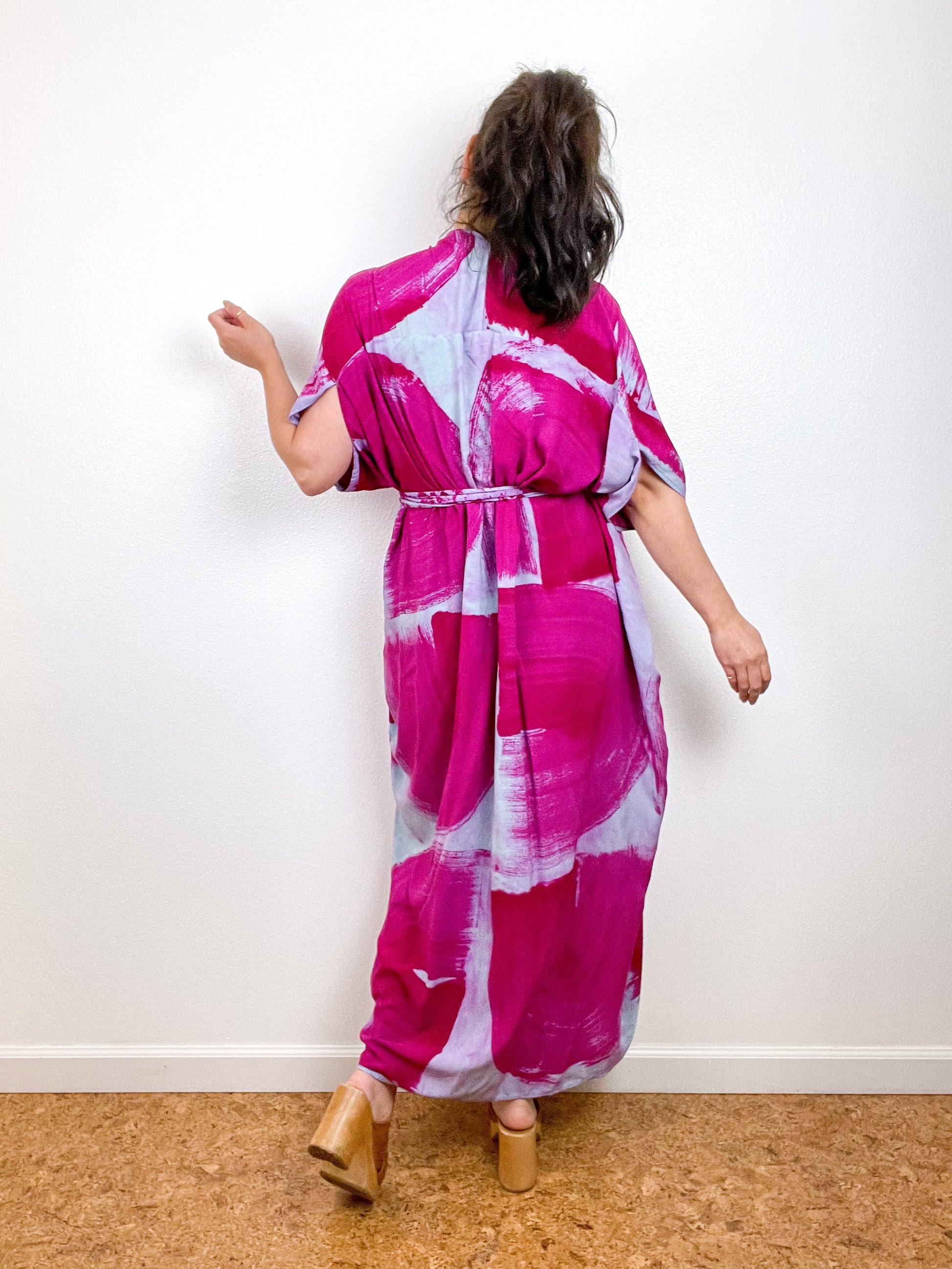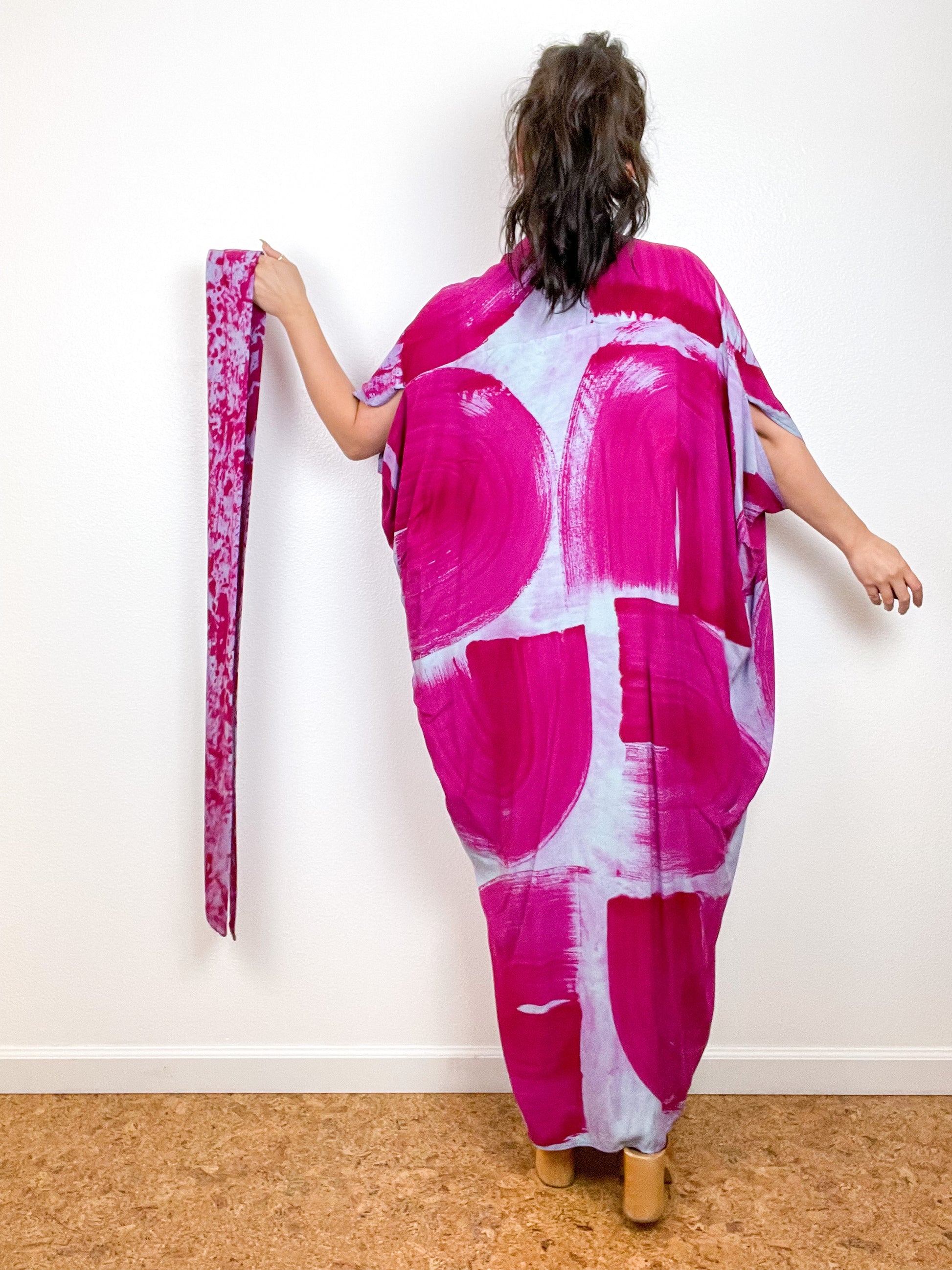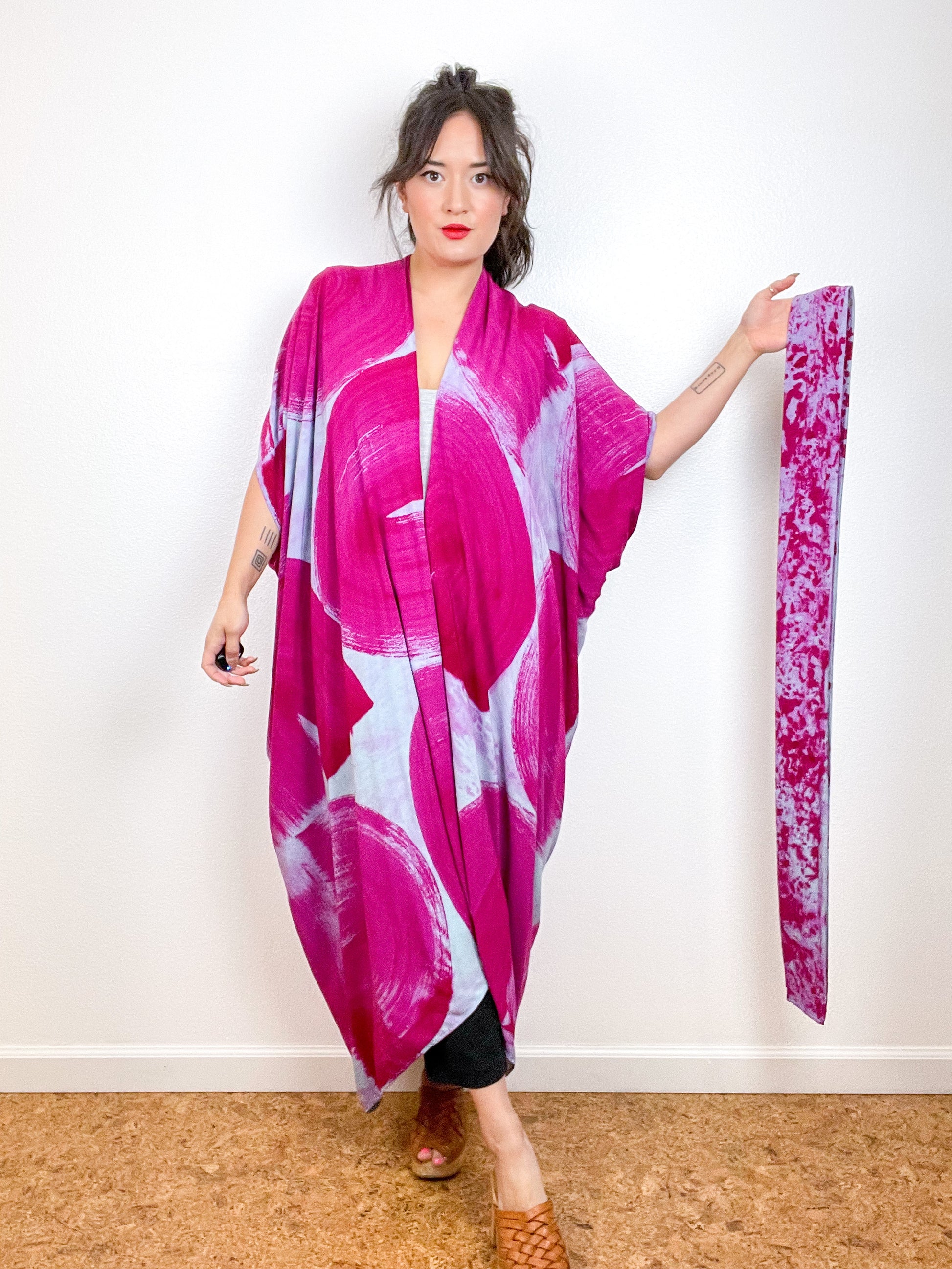 Soft and airy kimono with a flowing silhouette, tulip sleeve detail, curved high low hem and separate waist tie. Versatile shape can be styled as a wrap dress, an open kimono without the tie, or a robe for staying home. The minimalist design created from a full rectangle of fabric drapes beautifully over the shoulders and produces no material waste by utilizing one whole piece of fabric without scraps from corners and irregular cuts. Lightweight woven baby blue fabric is hand-dyed with bright amethyst algae thickened dye using a gestural brushstroke technique.