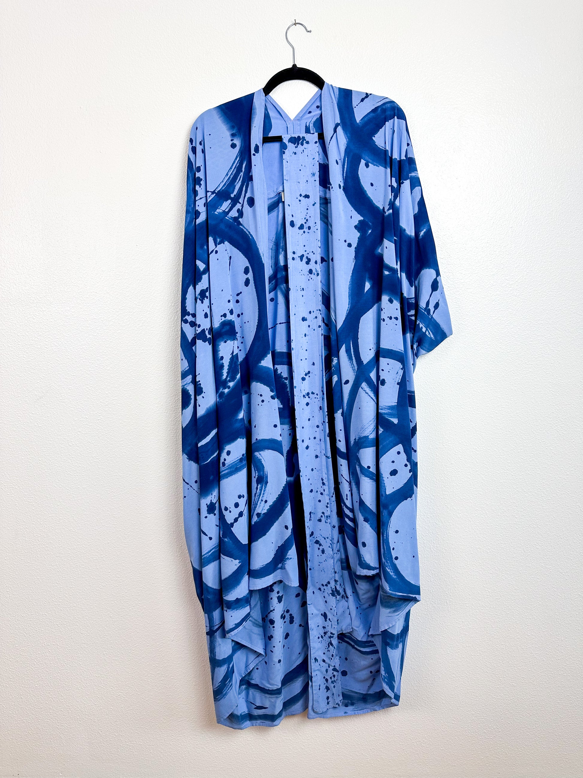 Soft and airy kimono with a flowing silhouette, tulip sleeve detail, curved high low hem and separate waist tie. Versatile shape can be styled as a wrap dress, an open kimono without the tie, or a robe for staying home. The minimalist design created from a full rectangle of fabric drapes beautifully over the shoulders and produces no material waste by utilizing one whole piece of fabric without scraps from corners and irregular cuts. Lightweight woven blue fabric is hand-dyed with indigo algae thickened dye using a gestural brushstroke technique.