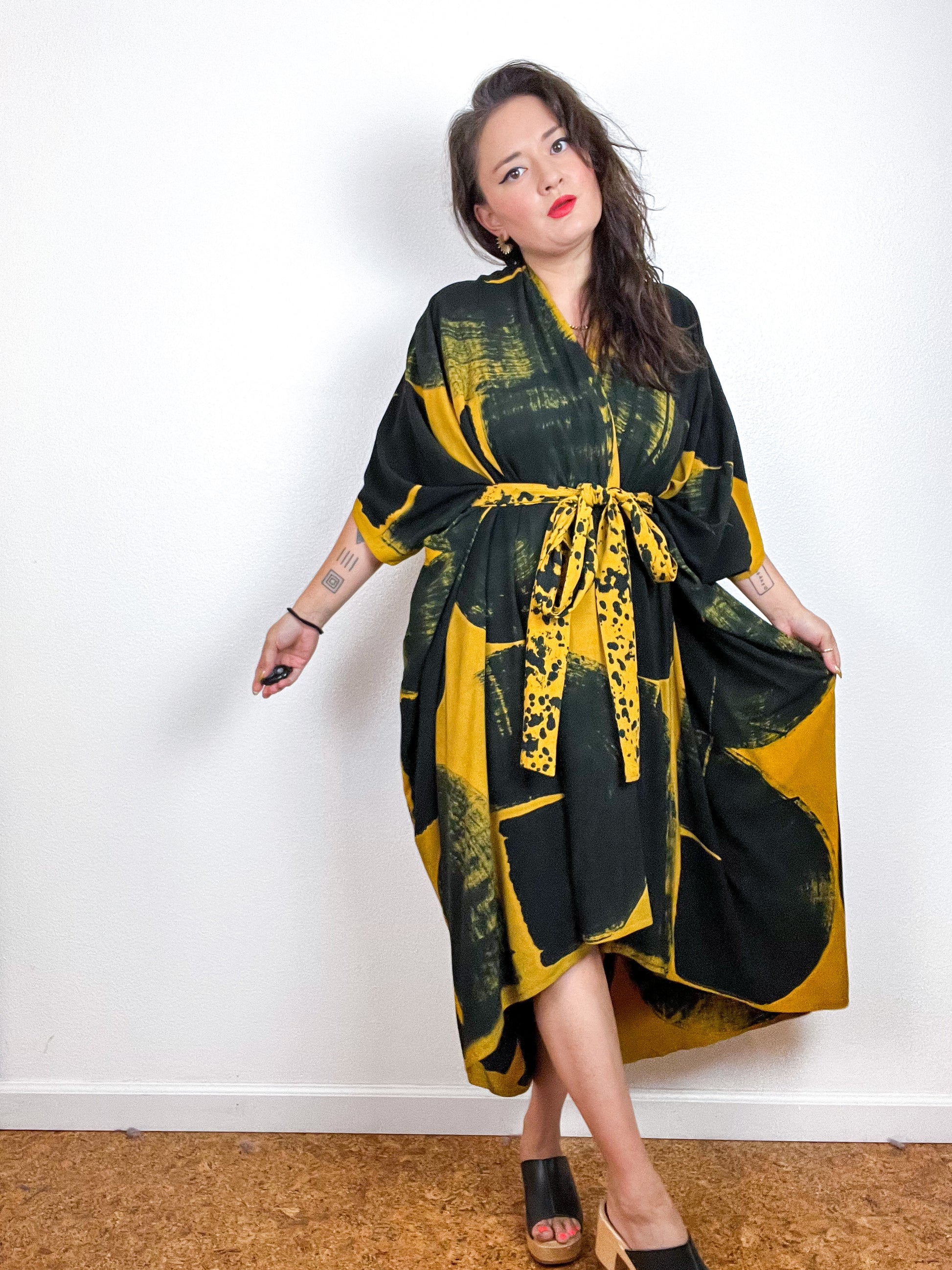 Soft and airy kimono with a flowing silhouette, tulip sleeve detail, curved high low hem and separate waist tie. Versatile shape can be styled as a wrap dress, an open kimono without the tie, or a robe for staying home. The minimalist design created from a full rectangle of fabric drapes beautifully over the shoulders and produces no material waste by utilizing one whole piece of fabric without scraps from corners and irregular cuts. Lightweight woven mustard yellow fabric is hand-dyed with black algae thickened dye using a gestural brushstroke technique.