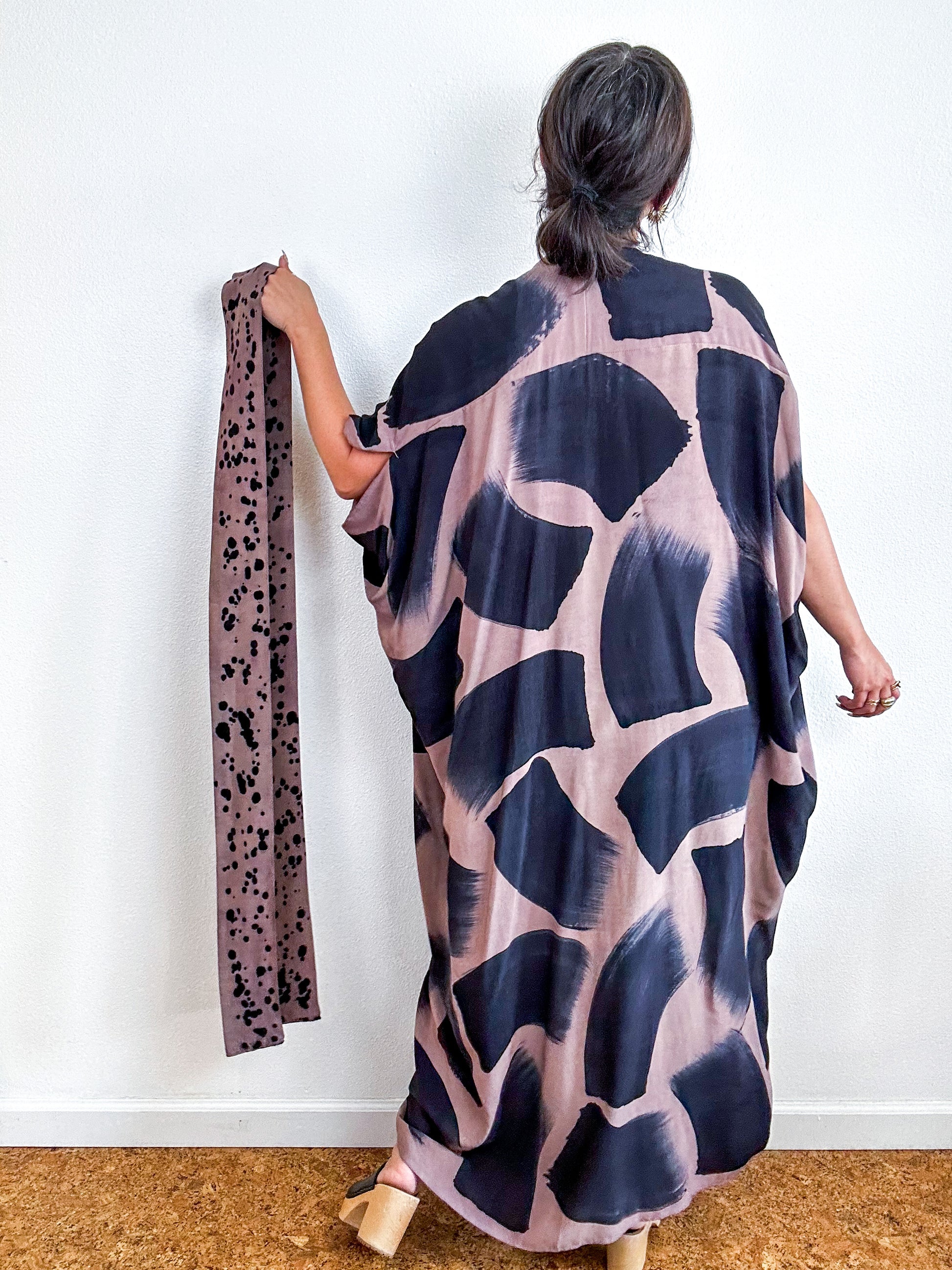 Soft and airy kimono with a flowing silhouette, tulip sleeve detail, curved high low hem and separate waist tie. Versatile shape can be styled as a wrap dress, an open kimono without the tie, or a robe for staying home. The minimalist design created from a full rectangle of fabric drapes beautifully over the shoulders and produces no material waste by utilizing one whole piece of fabric without scraps from corners and irregular cuts. Lightweight woven light cocoa brown fabric is hand-dyed with black algae thickened dye using a gestural brushstroke technique.