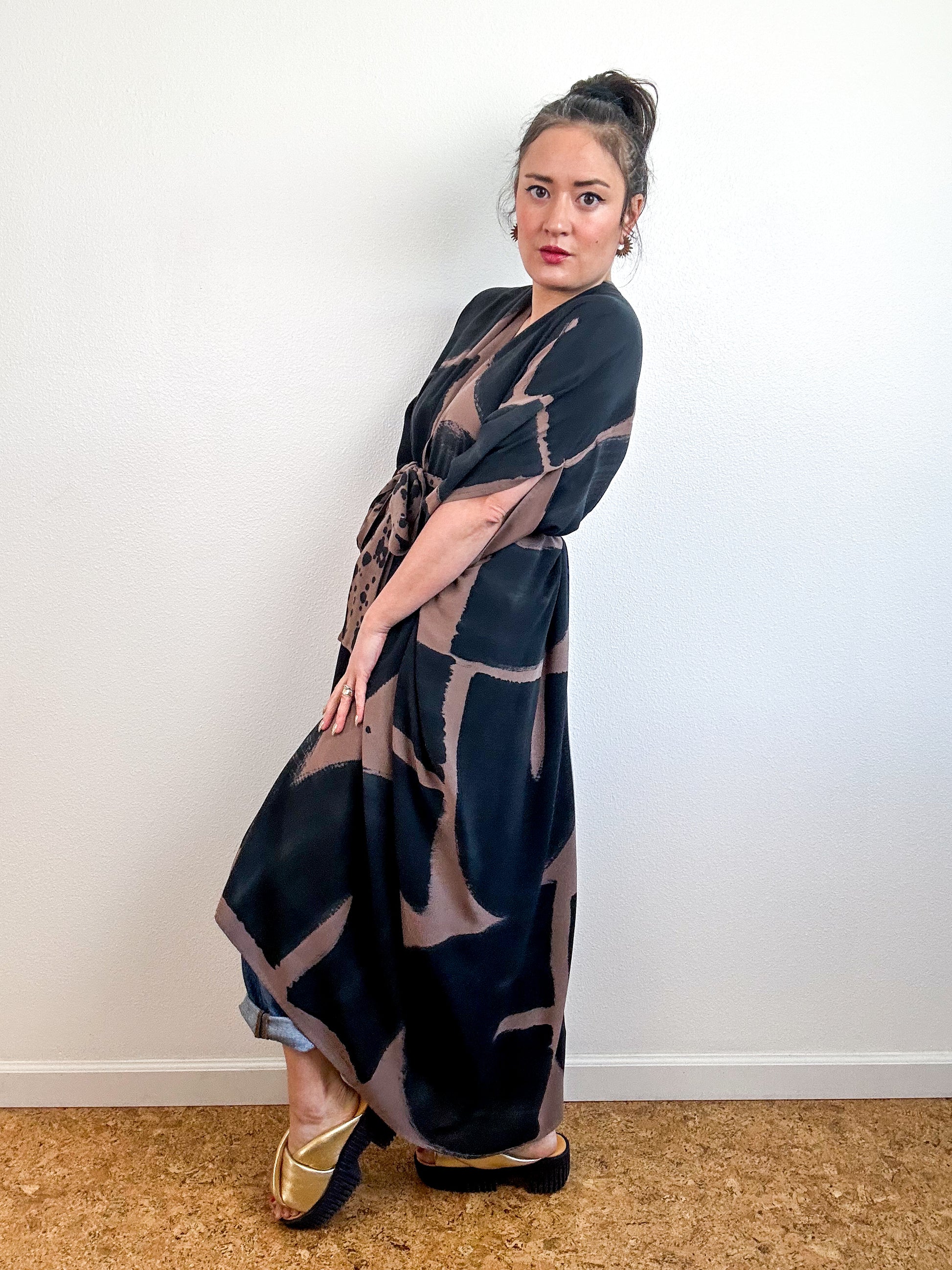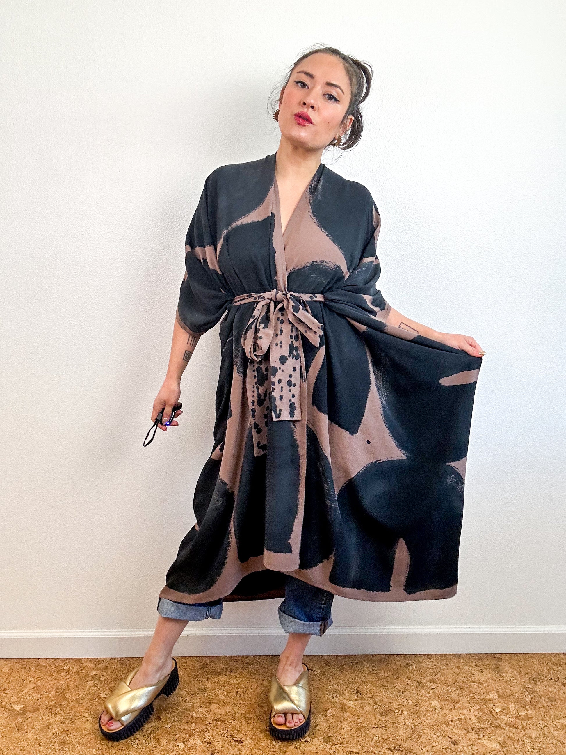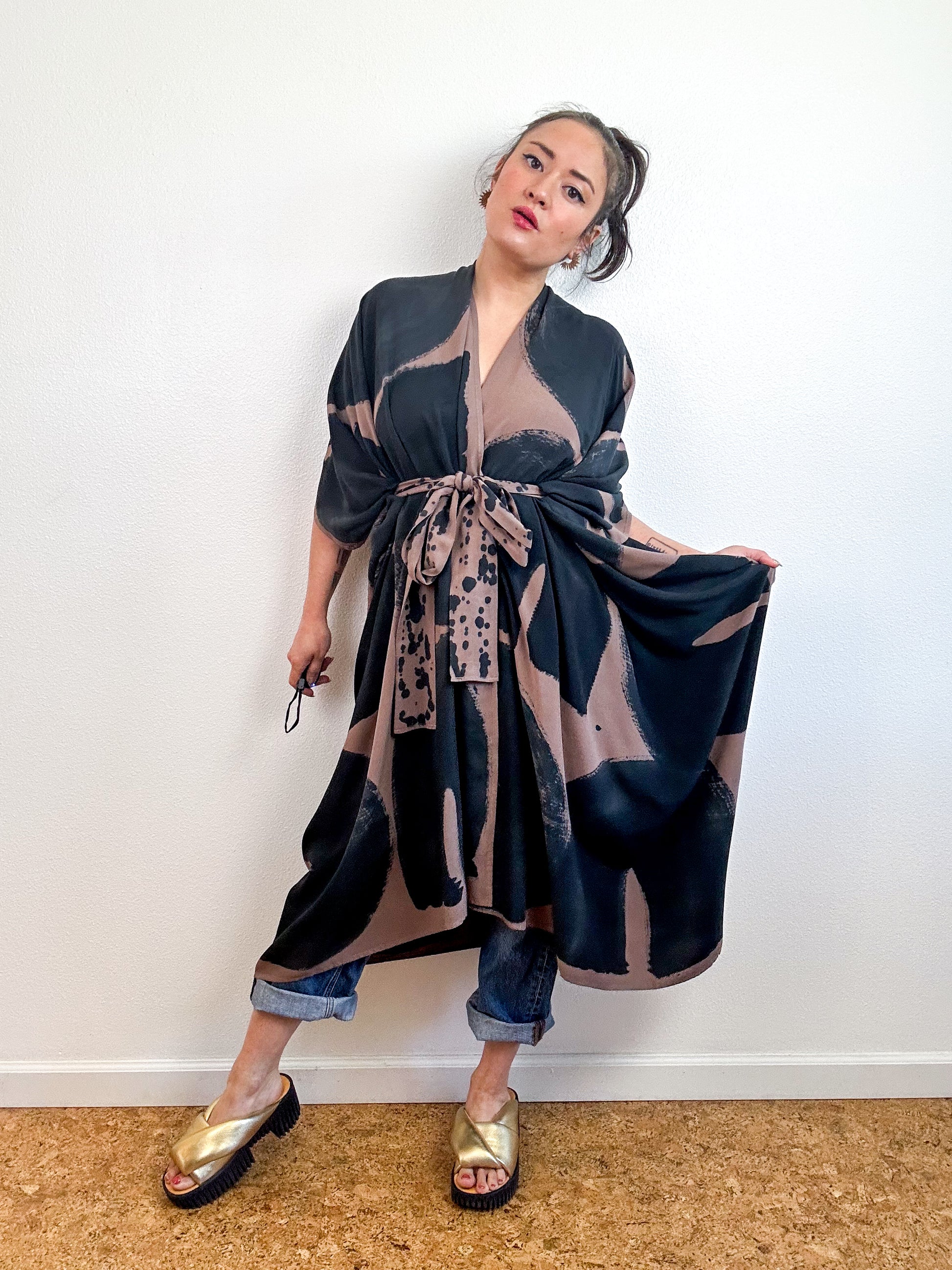 Soft and airy kimono with a flowing silhouette, tulip sleeve detail, curved high low hem and separate waist tie. Versatile shape can be styled as a wrap dress, an open kimono without the tie, or a robe for staying home. The minimalist design created from a full rectangle of fabric drapes beautifully over the shoulders and produces no material waste by utilizing one whole piece of fabric without scraps from corners and irregular cuts. Lightweight woven light cocoa brown fabric is hand-dyed with black algae thickened dye using a gestural brushstroke technique.