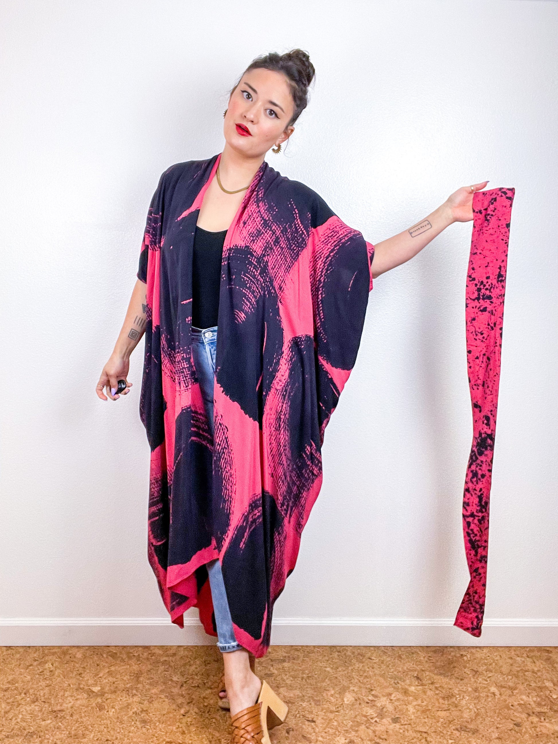 Hand-Dyed High Low Kimono Coral Black Brushstroke