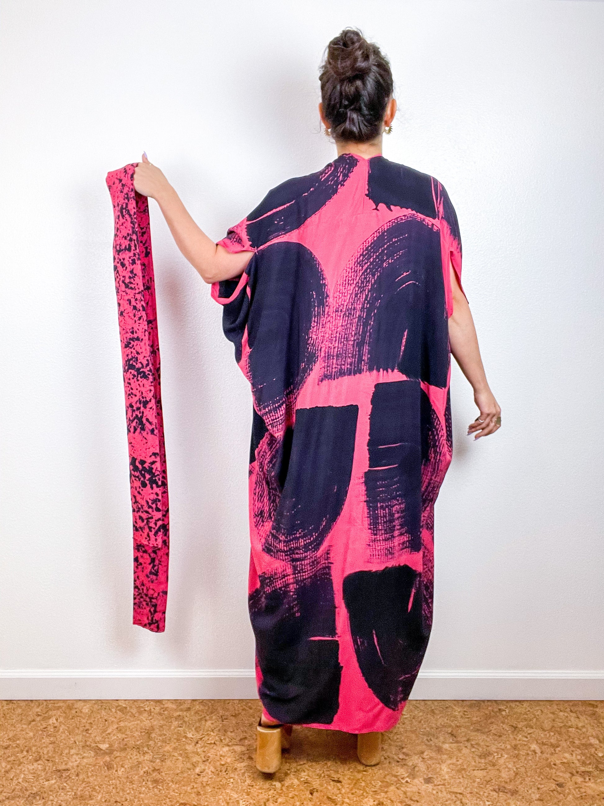 Soft and airy kimono with a flowing silhouette, tulip sleeve detail, curved high low hem and separate waist tie. Versatile shape can be styled as a wrap dress, an open kimono without the tie, or a robe for staying home. The minimalist design created from a full rectangle of fabric drapes beautifully over the shoulders and produces no material waste by utilizing one whole piece of fabric without scraps from corners and irregular cuts. Lightweight woven coral red fabric is hand-dyed with black algae thickened dye using a gestural brushstroke technique.