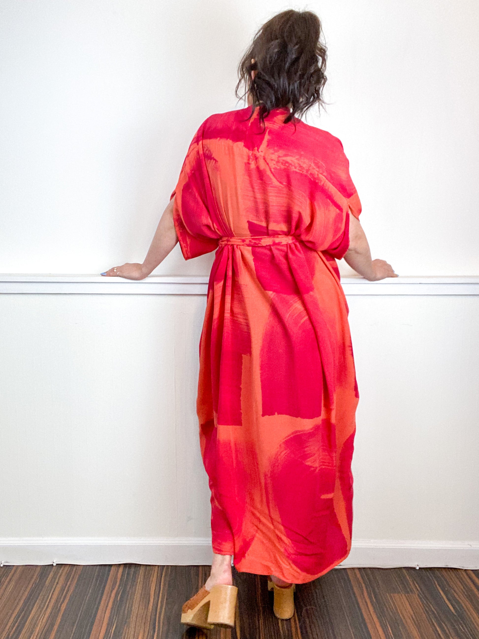Soft and airy kimono with a flowing silhouette, tulip sleeve detail, curved high low hem and separate waist tie. Versatile shape can be styled as a wrap dress, an open kimono without the tie, or a robe for staying home. The minimalist design created from a full rectangle of fabric drapes beautifully over the shoulders and produces no material waste by utilizing one whole piece of fabric without scraps from corners and irregular cuts. Lightweight woven coral orange fabric is hand-dyed with fuchsia algae thickened dye using a gestural brushstroke technique.
