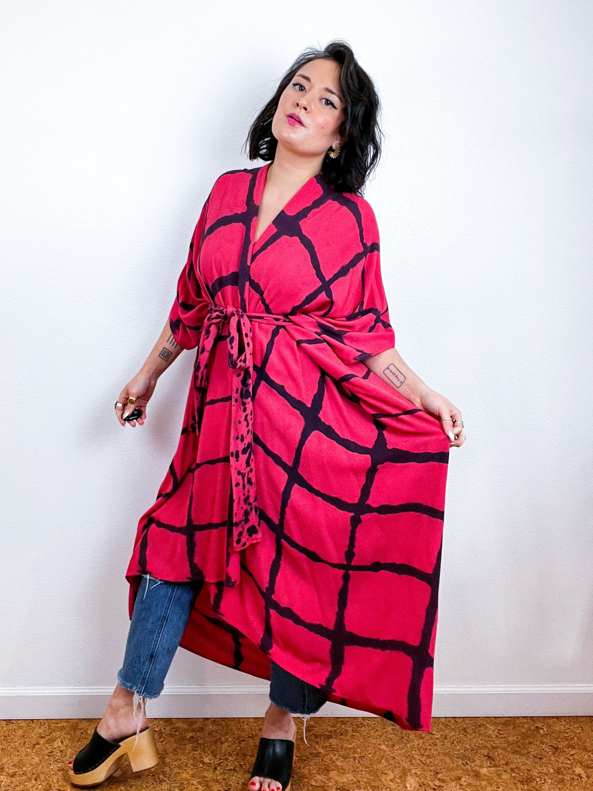Hand-Dyed High Low Kimono Coral Grey Windowpane
