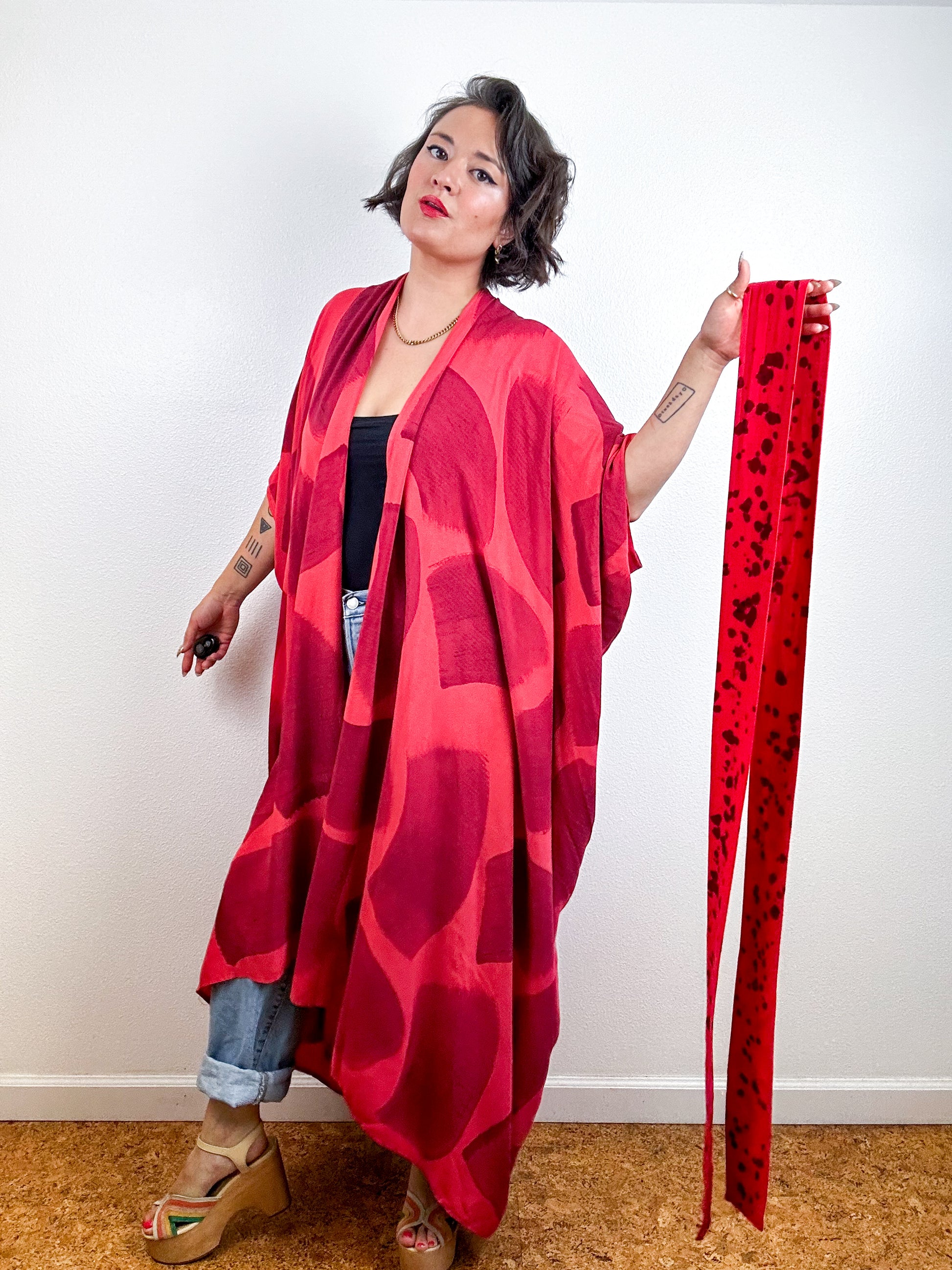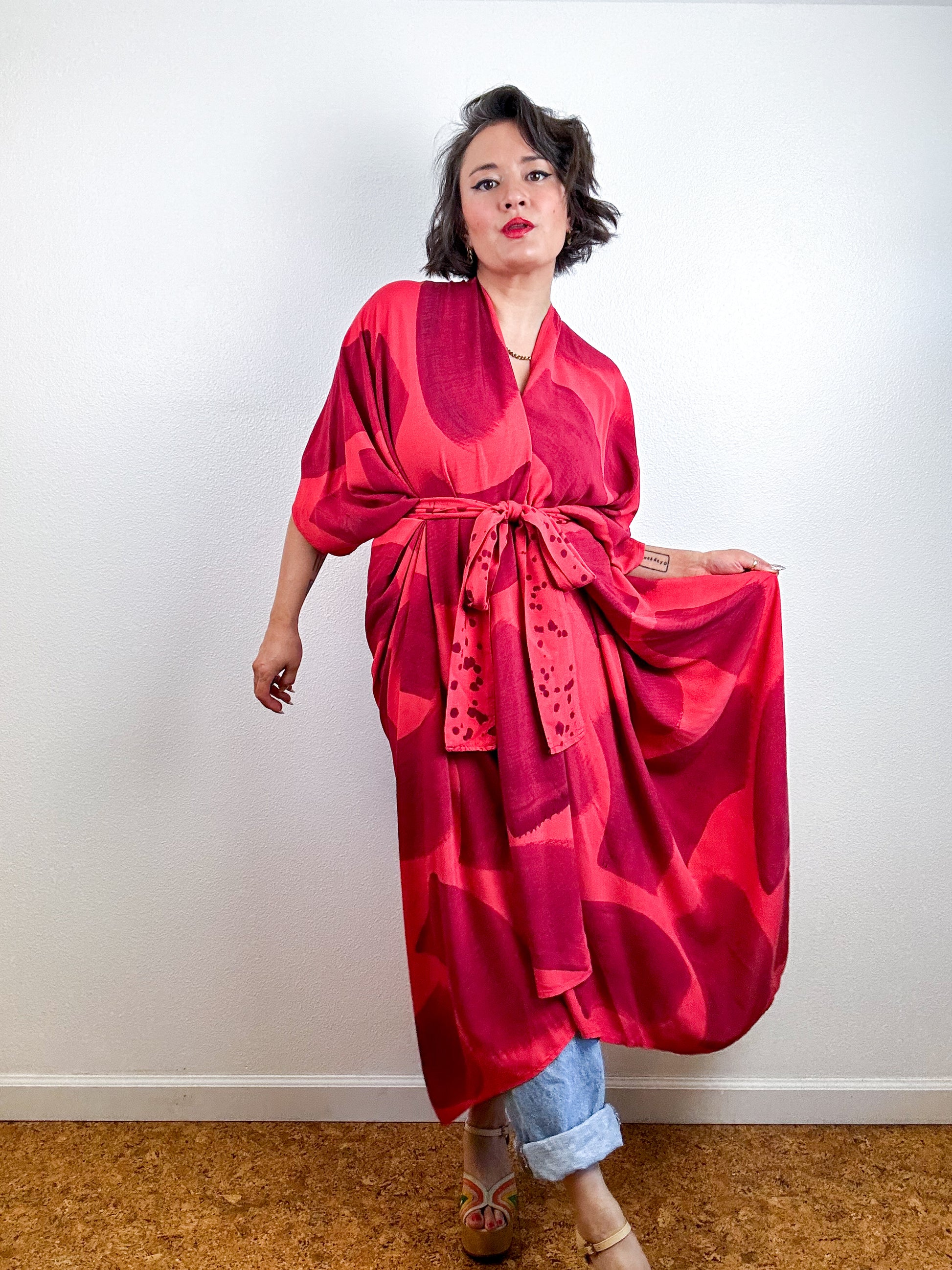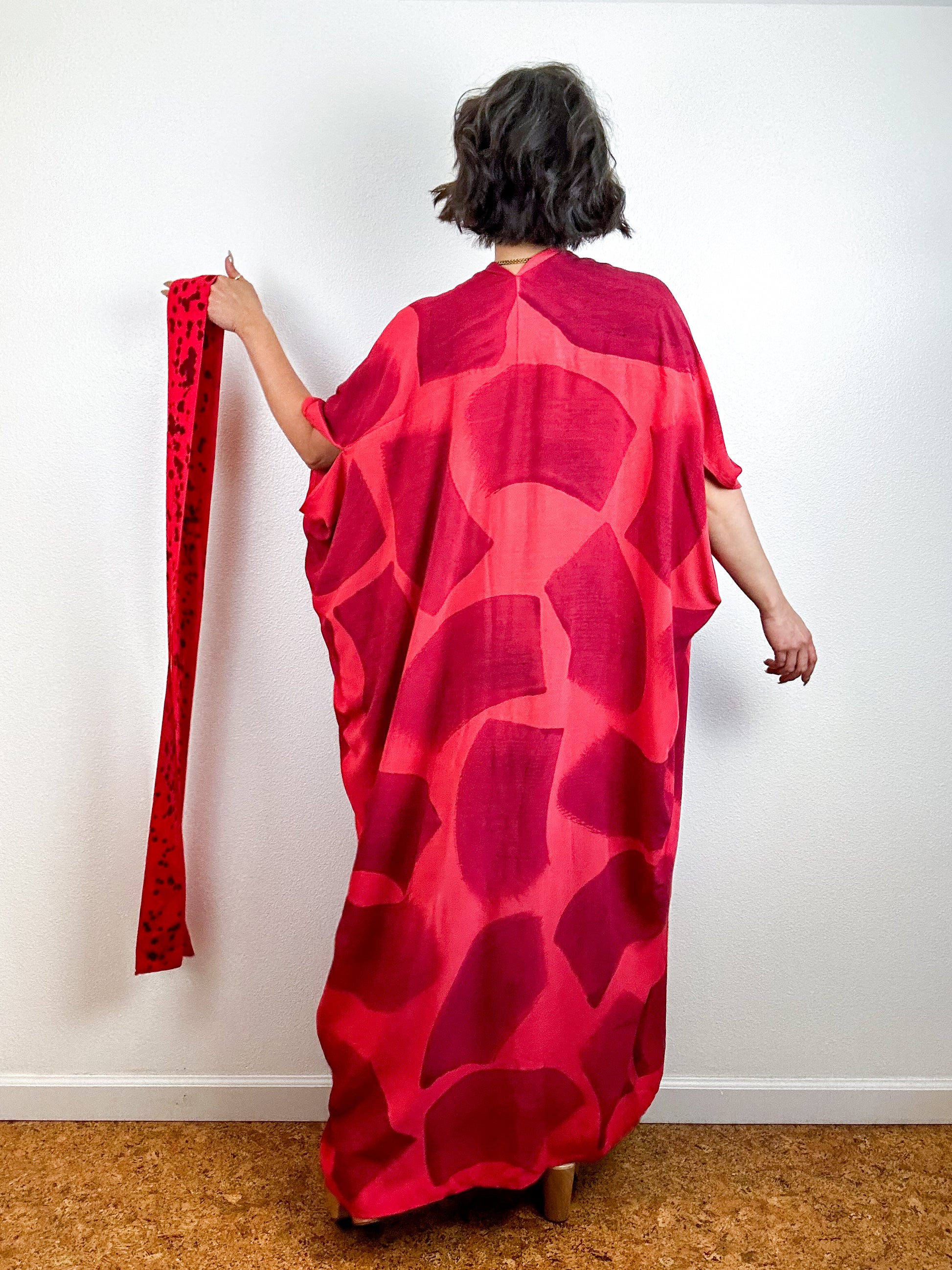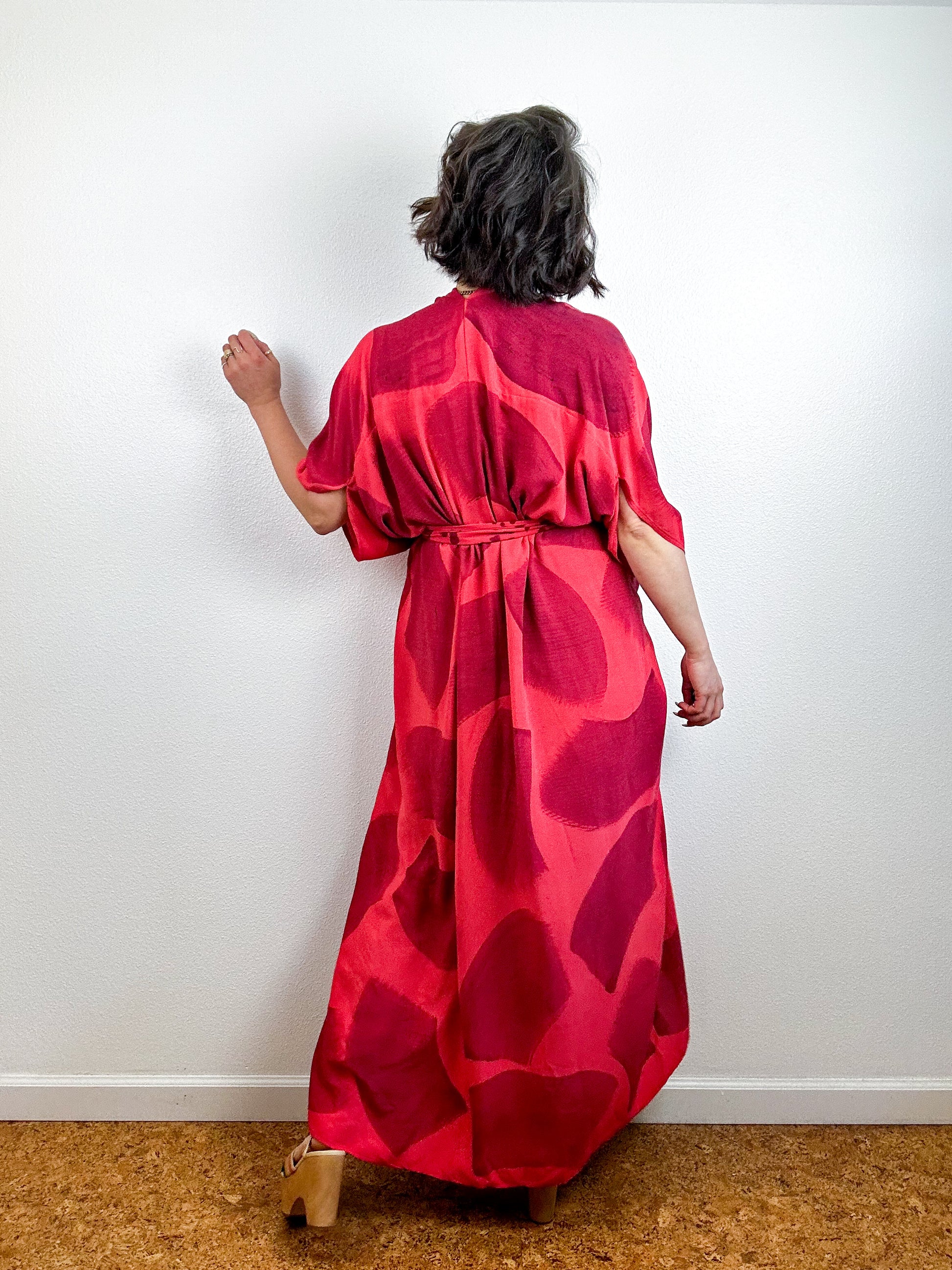 Hand-Dyed High Low Kimono Coral Maroon Brush