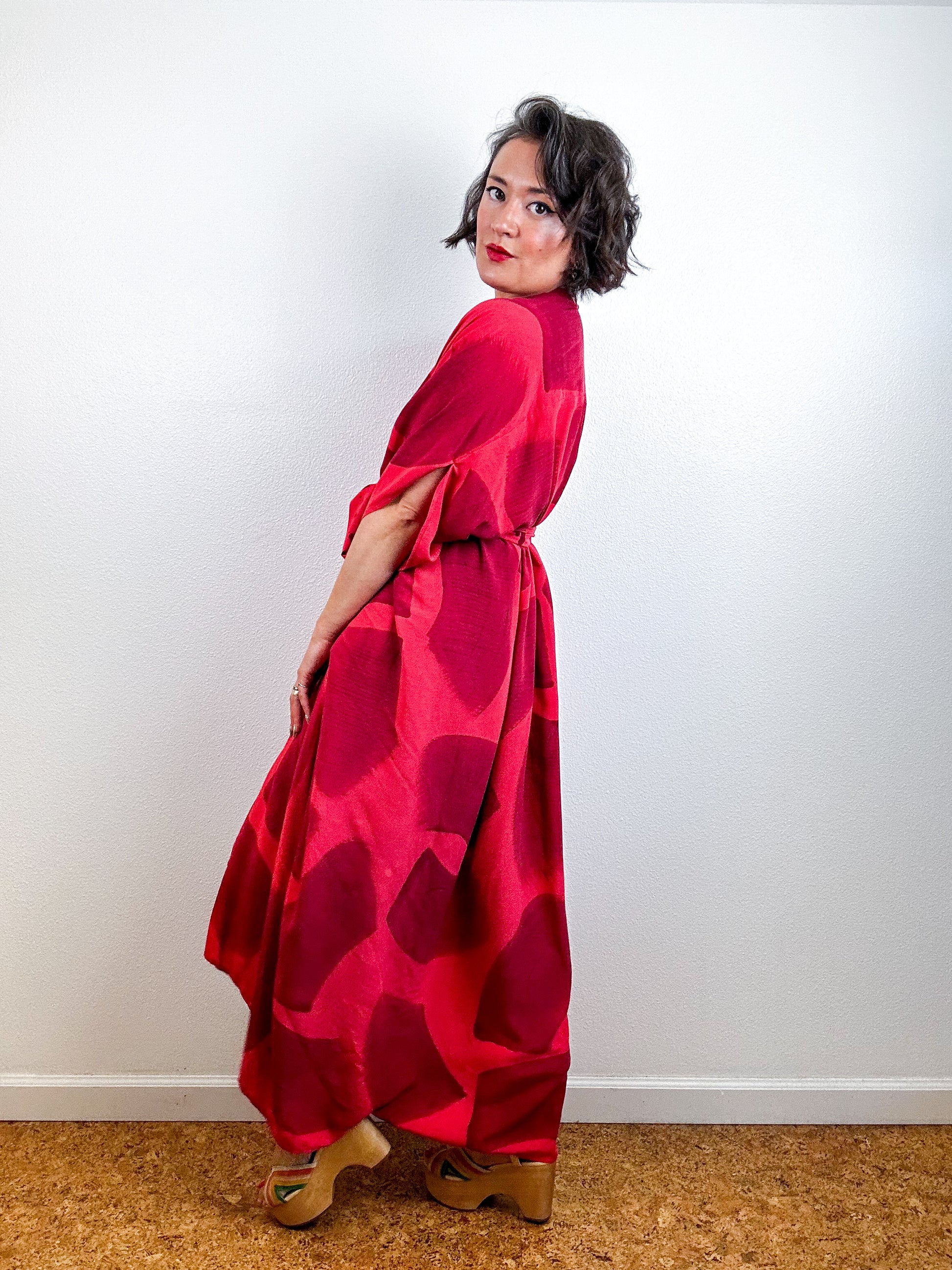 Soft and airy kimono with a flowing silhouette, tulip sleeve detail, curved high low hem and separate waist tie. Versatile shape can be styled as a wrap dress, an open kimono without the tie, or a robe for staying home. The minimalist design created from a full rectangle of fabric drapes beautifully over the shoulders and produces no material waste by utilizing one whole piece of fabric without scraps from corners and irregular cuts. Lightweight woven coral pink fabric is hand-dyed with maroon algae thickened dye using a gestural brushstroke technique.