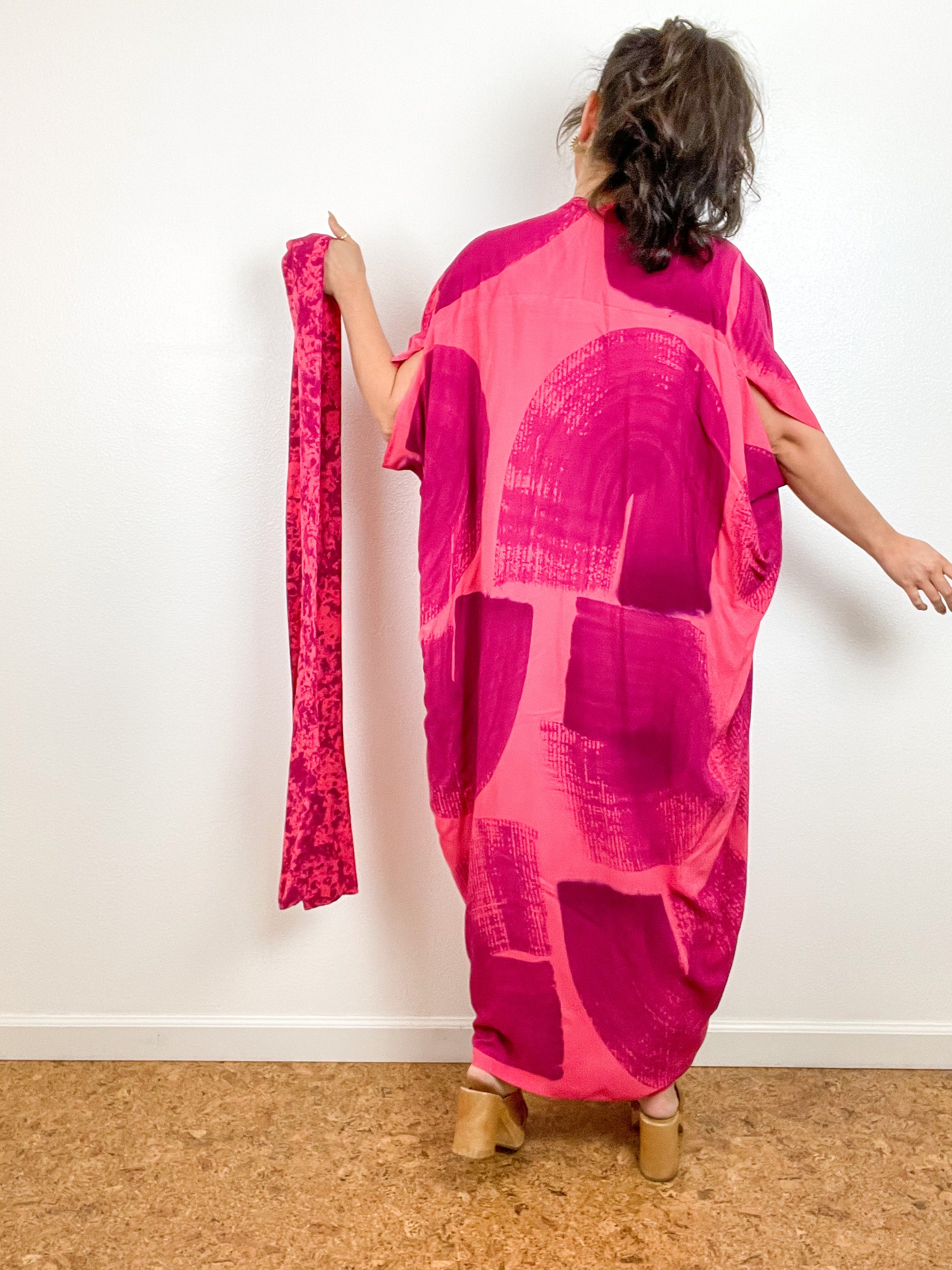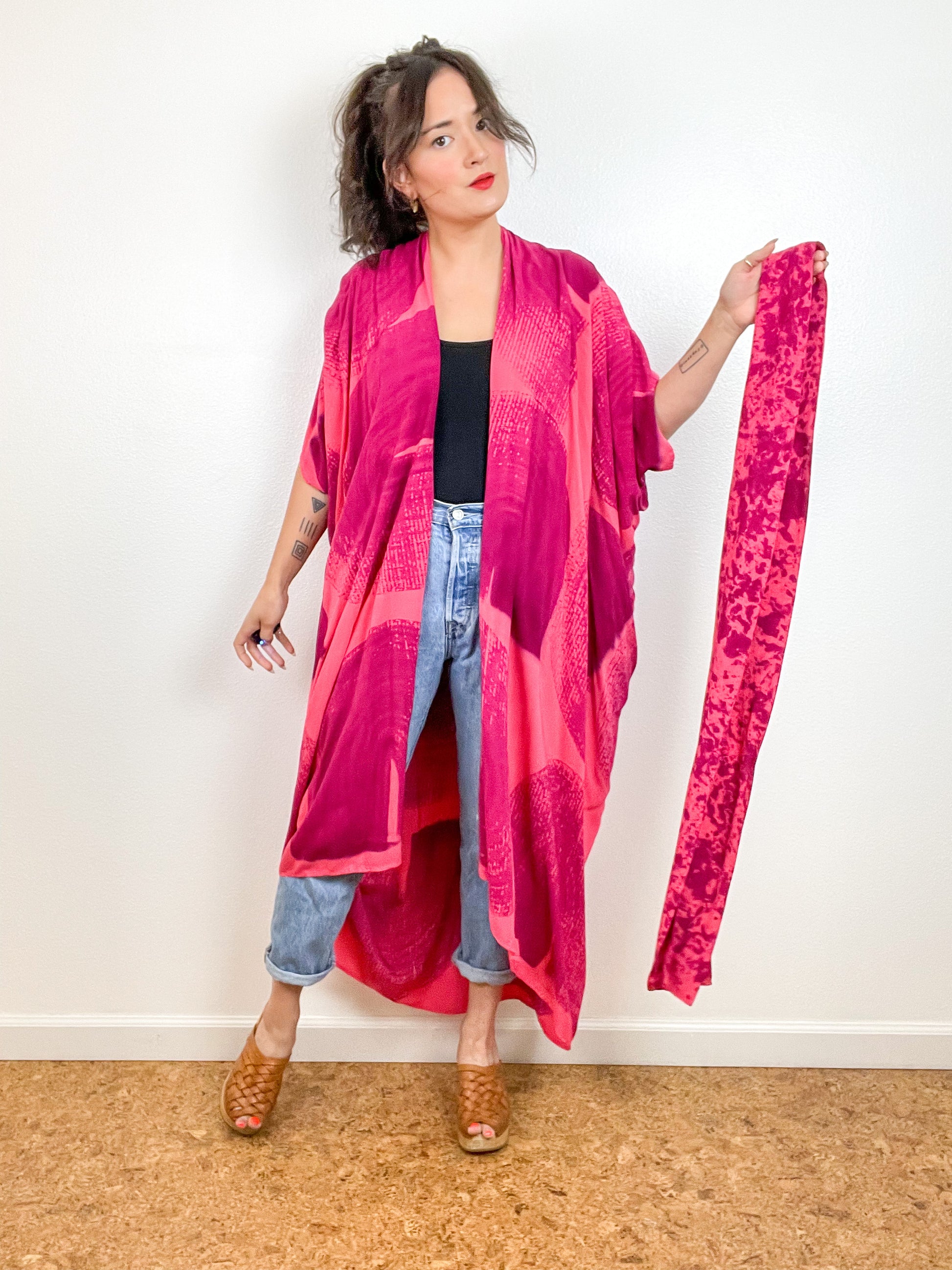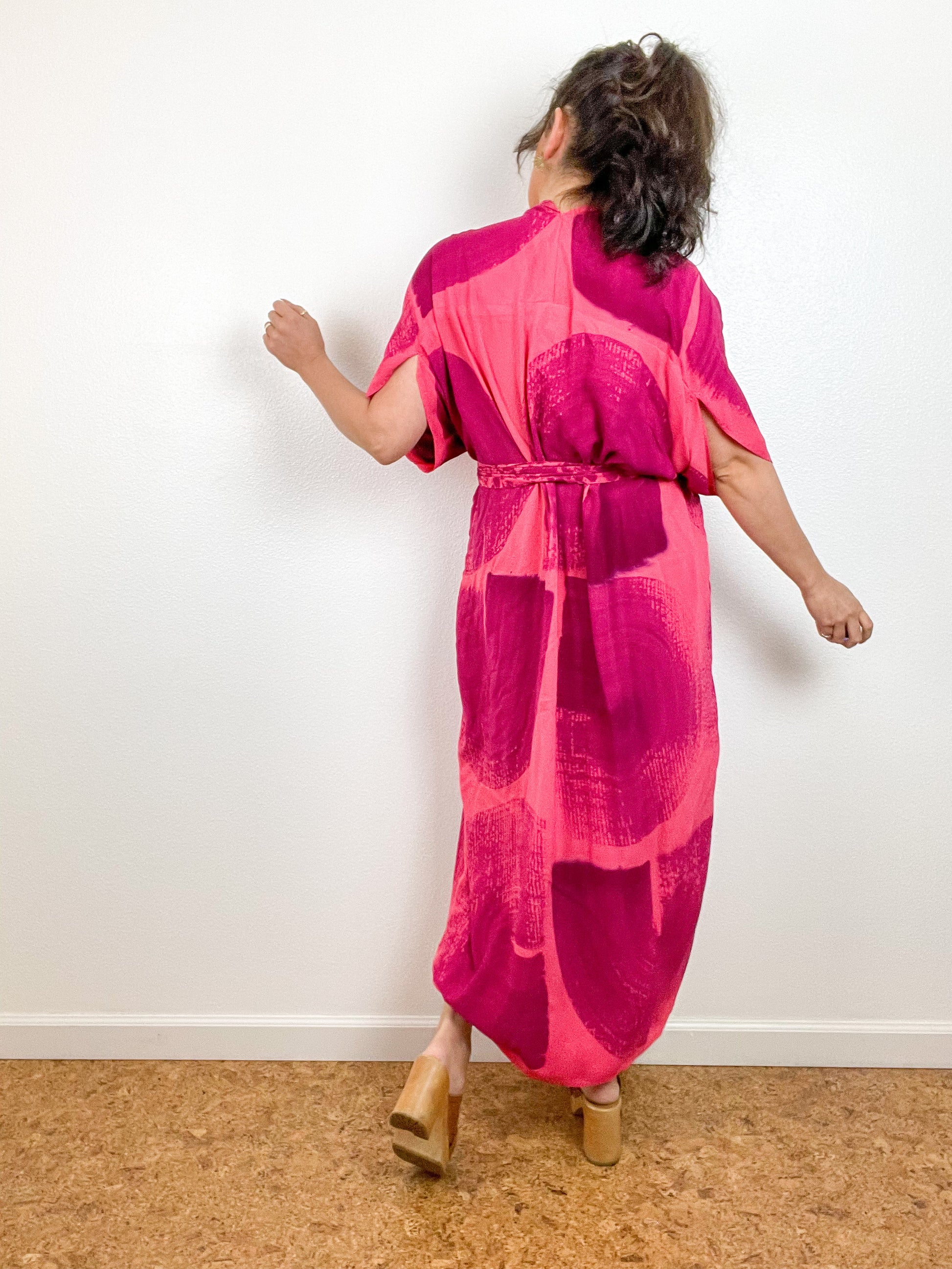 Hand-Dyed High Low Kimono Coral Maroon Brushstroke
