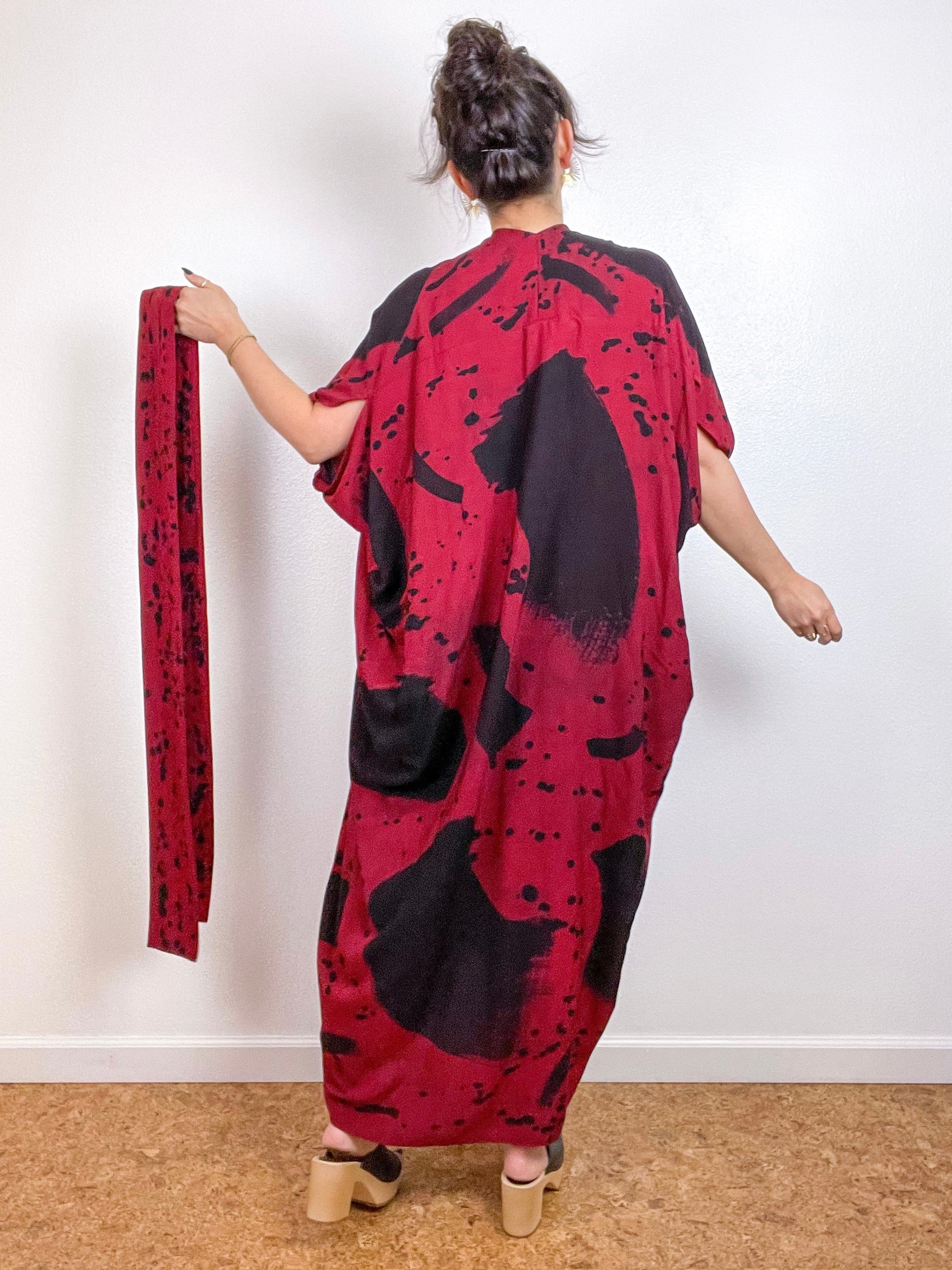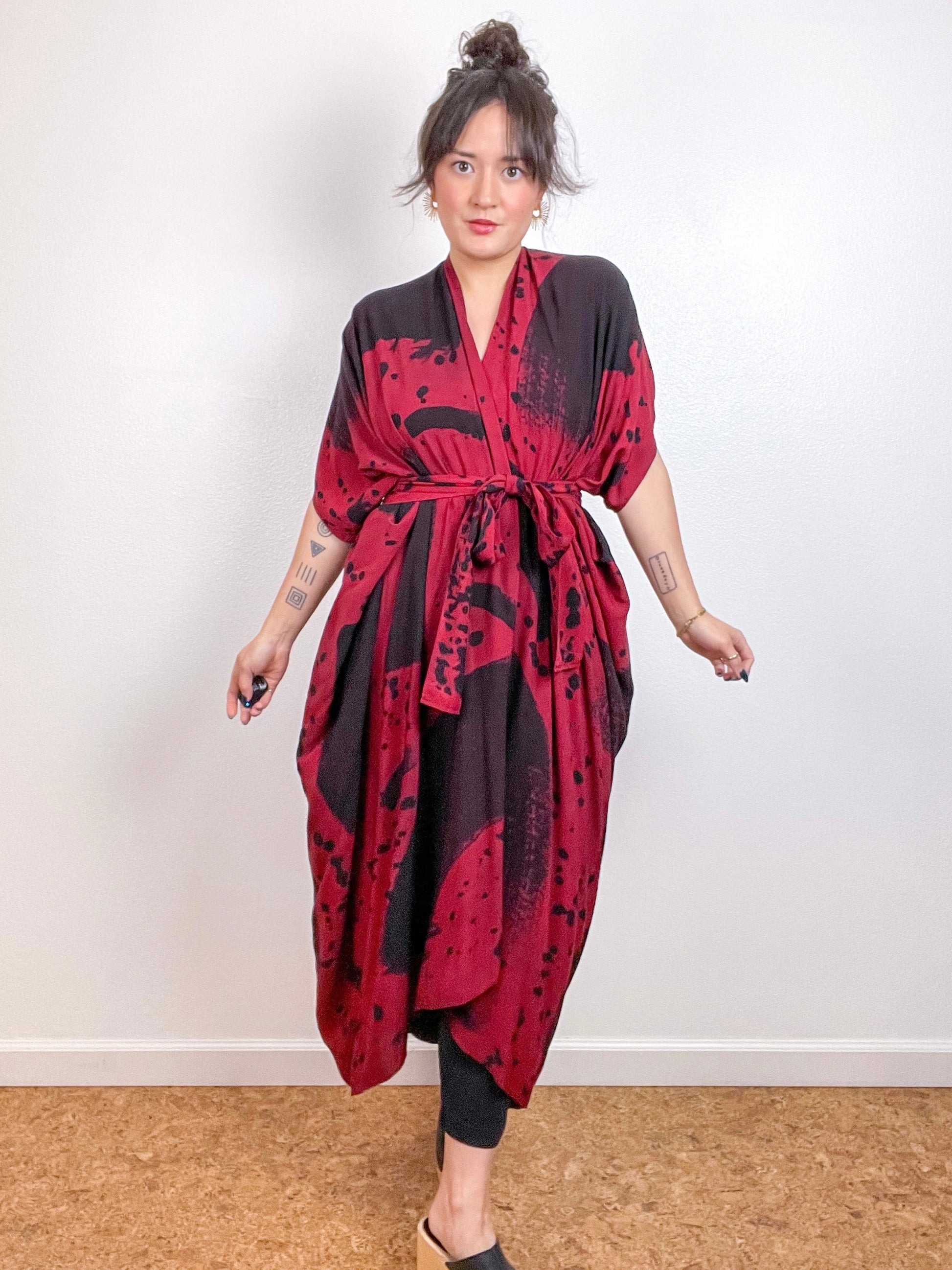 Soft and airy kimono with a flowing silhouette, tulip sleeve detail, curved high low hem and separate waist tie. Versatile shape can be styled as a wrap dress, an open kimono without the tie, or a robe for staying home. The minimalist design created from a full rectangle of fabric drapes beautifully over the shoulders and produces no material waste by utilizing one whole piece of fabric without scraps from corners and irregular cuts. Lightweight woven crimson red fabric is hand-dyed with black algae thickened dye using a gestural confetti technique.