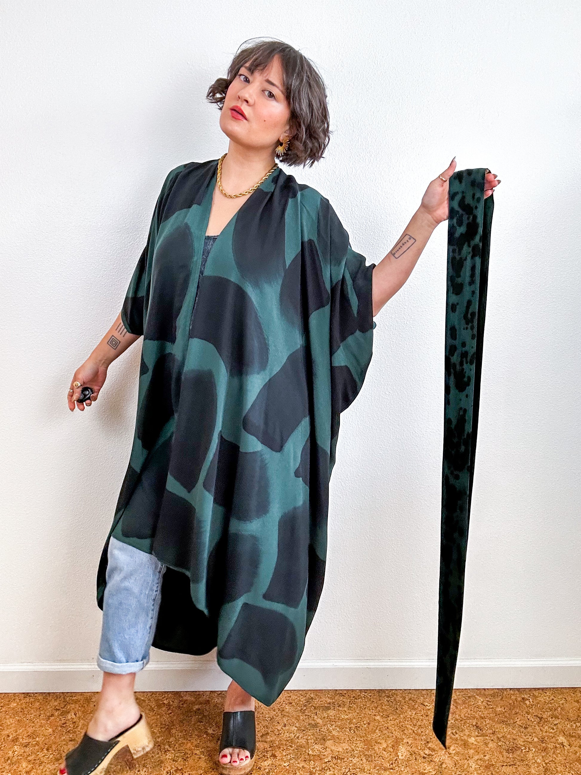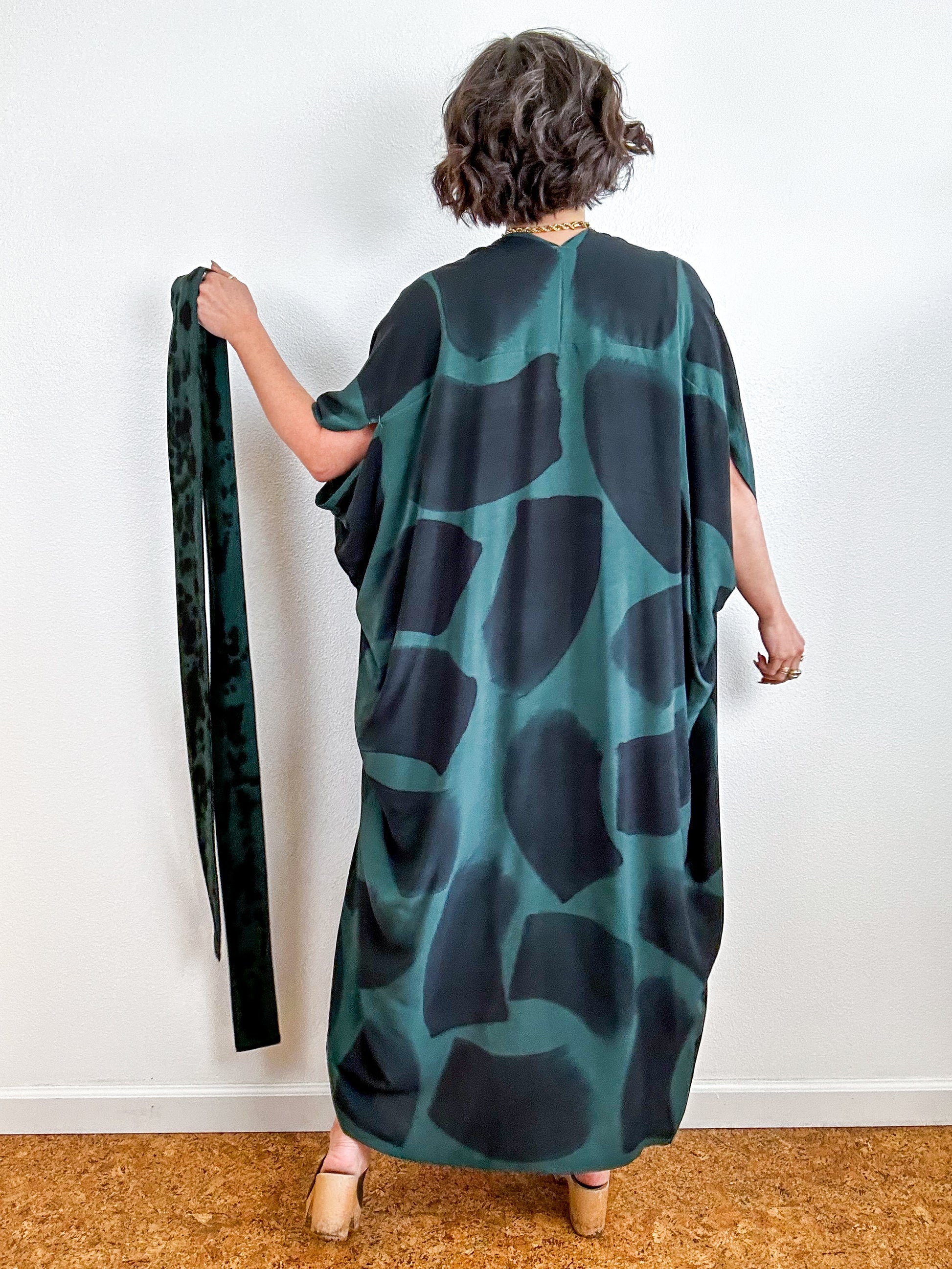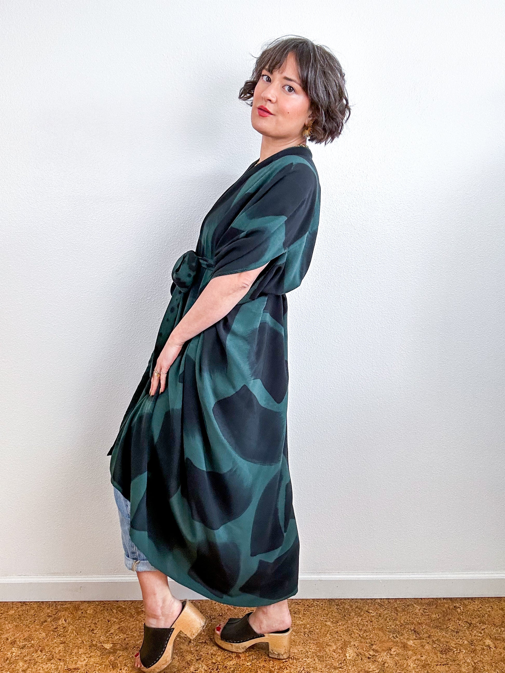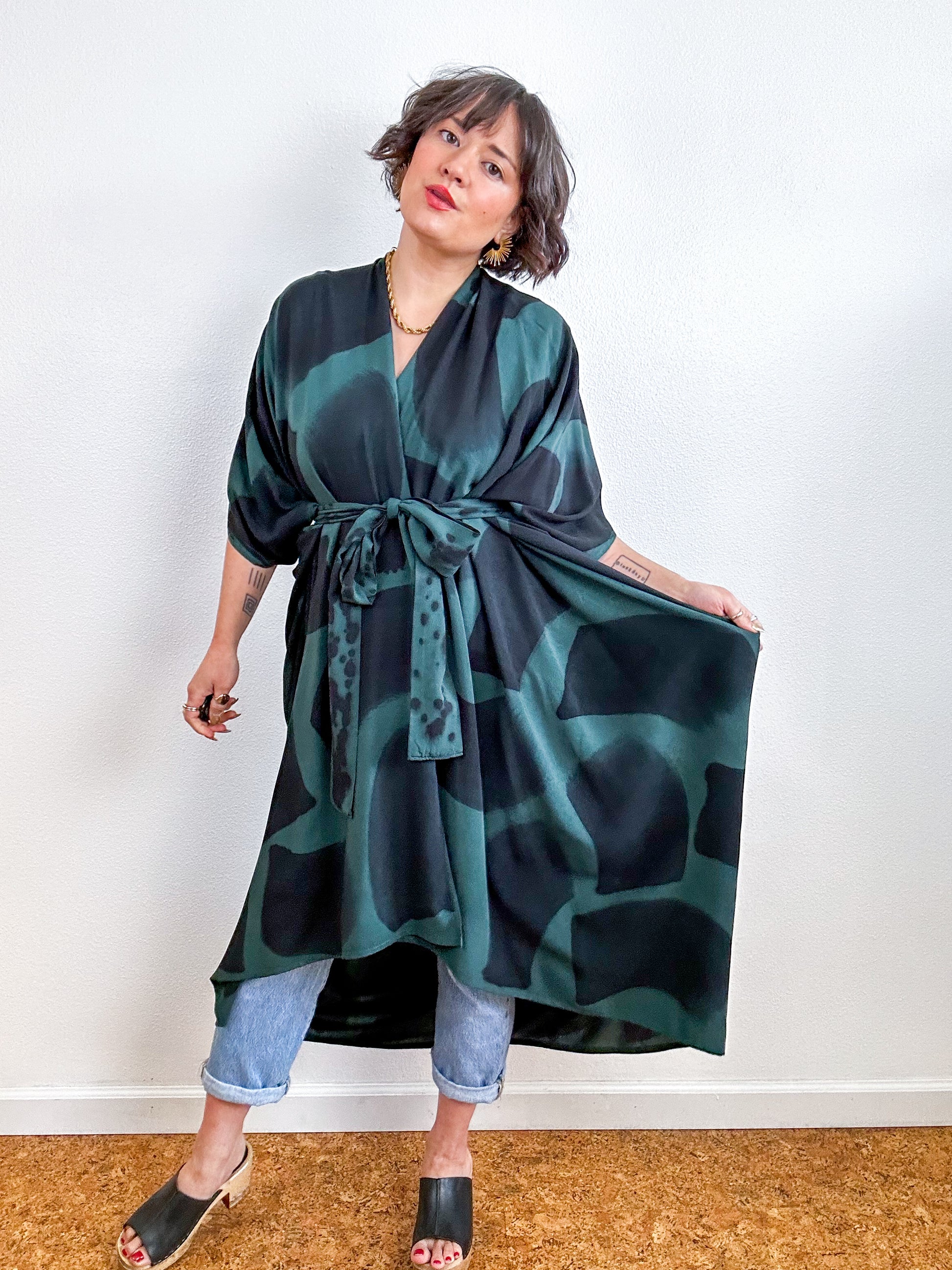 Soft and airy kimono with a flowing silhouette, tulip sleeve detail, curved high low hem and separate waist tie. Versatile shape can be styled as a wrap dress, an open kimono without the tie, or a robe for staying home. The minimalist design created from a full rectangle of fabric drapes beautifully over the shoulders and produces no material waste by utilizing one whole piece of fabric without scraps from corners and irregular cuts. Lightweight woven forest green fabric is hand-dyed with black algae thickened dye using a gestural brushstroke technique.