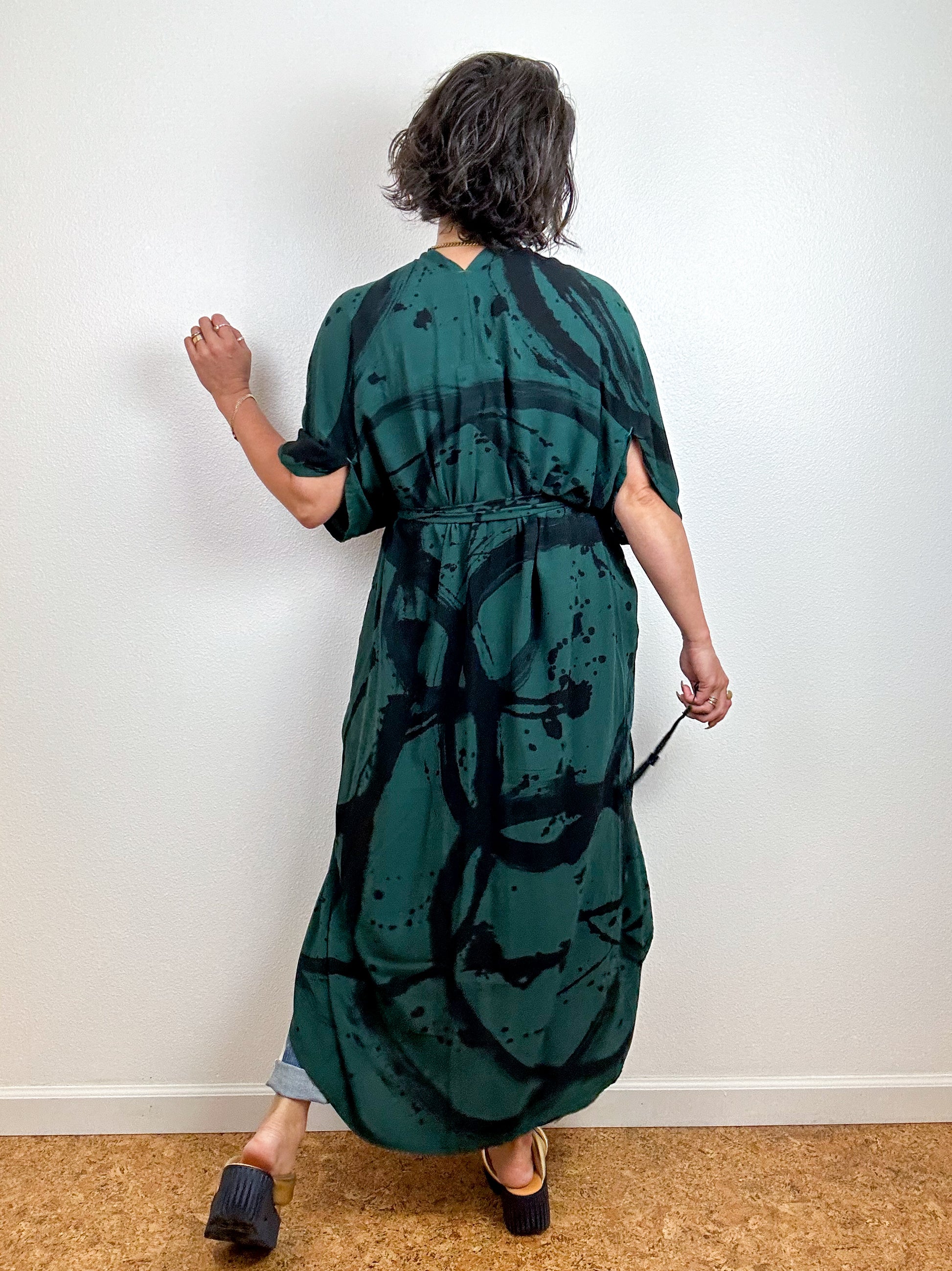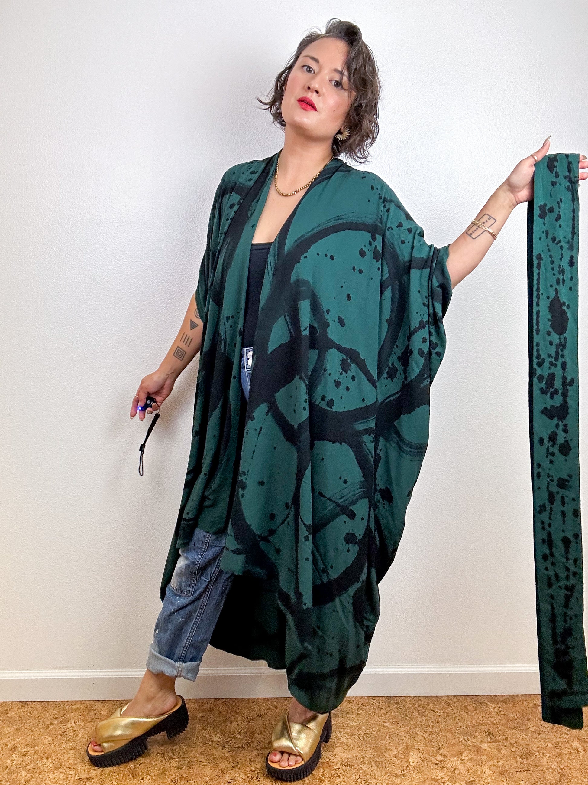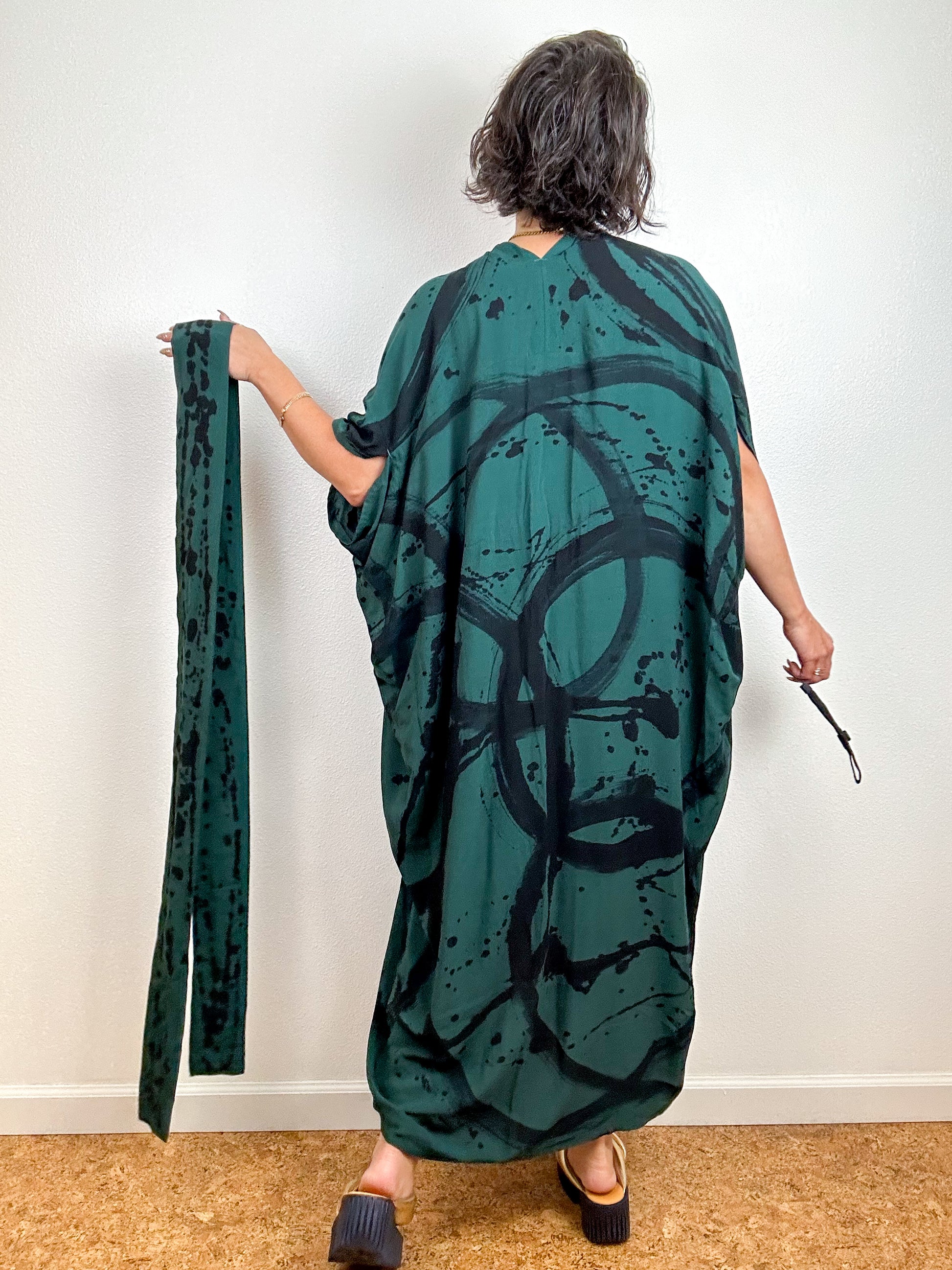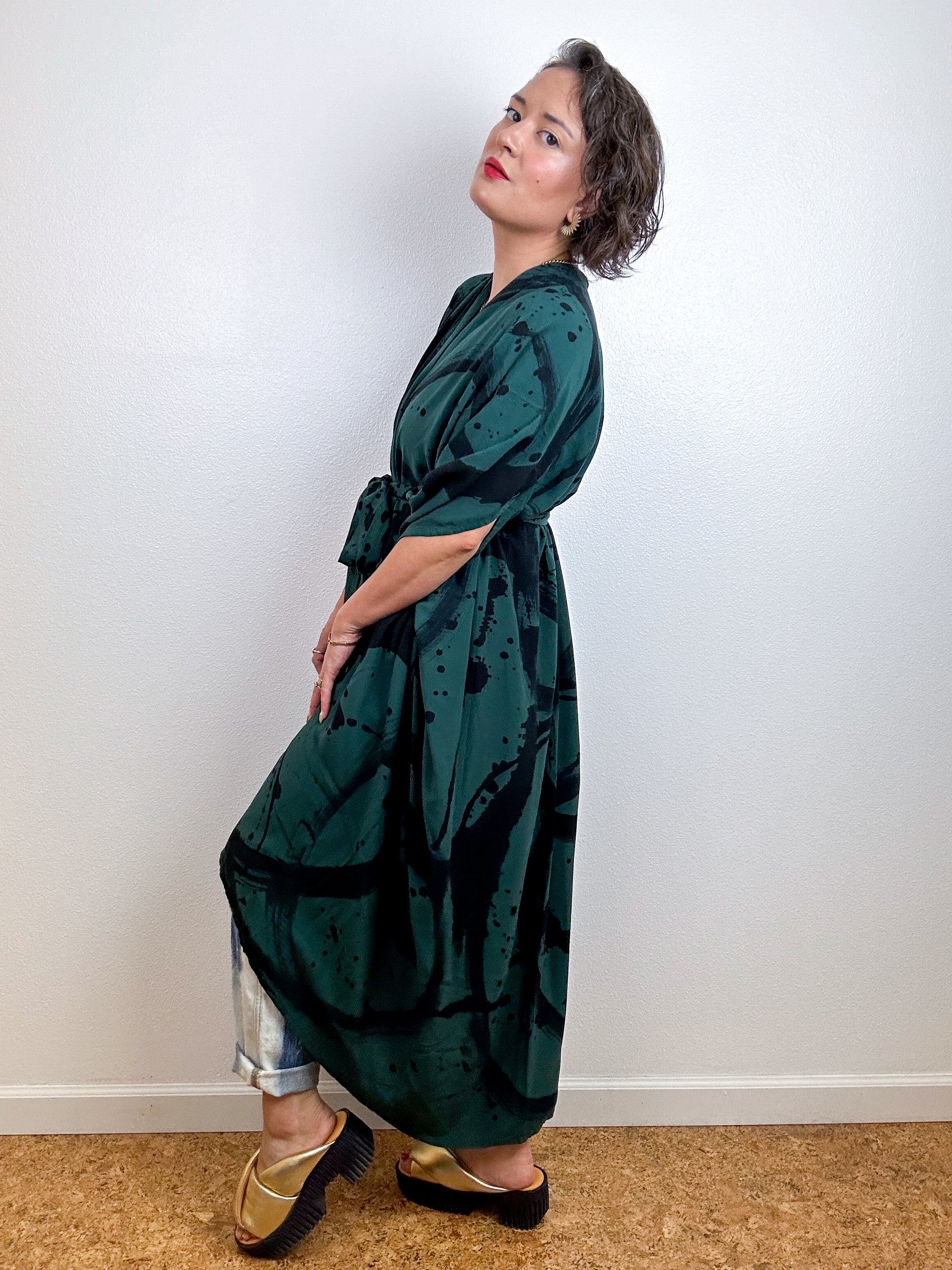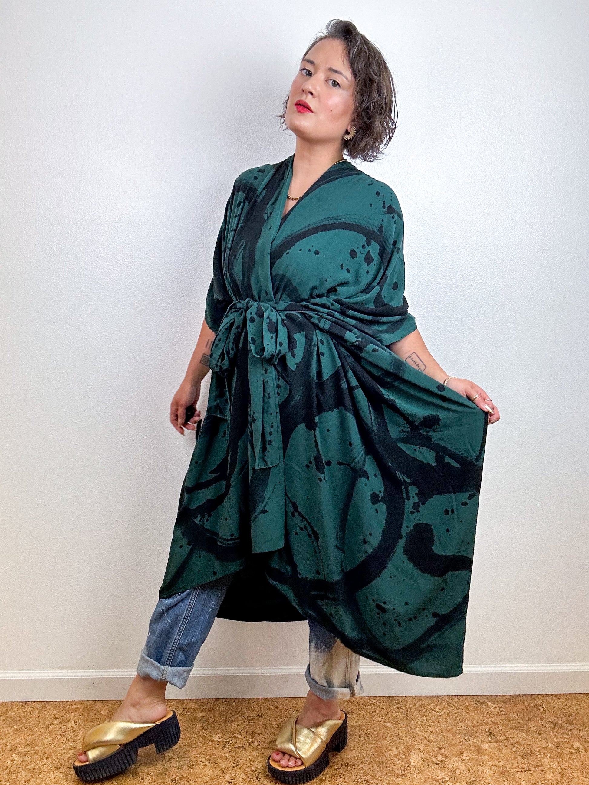 Soft and airy kimono with a flowing silhouette, tulip sleeve detail, curved high low hem and separate waist tie. Versatile shape can be styled as a wrap dress, an open kimono without the tie, or a robe for staying home. The minimalist design created from a full rectangle of fabric drapes beautifully over the shoulders and produces no material waste by utilizing one whole piece of fabric without scraps from corners and irregular cuts. Lightweight woven forest green fabric is hand-dyed with black algae thickened dye using a gestural brushstroke technique.