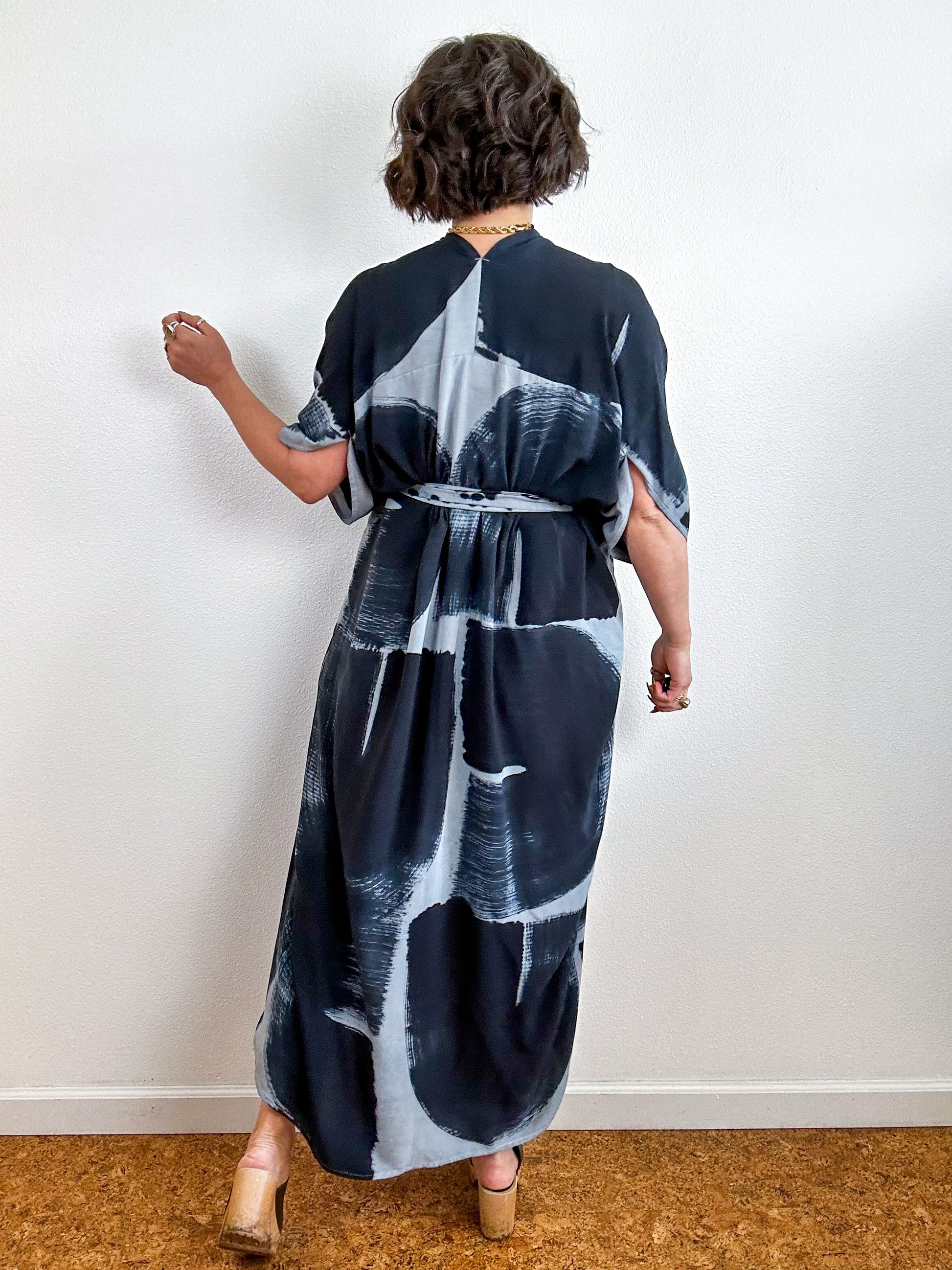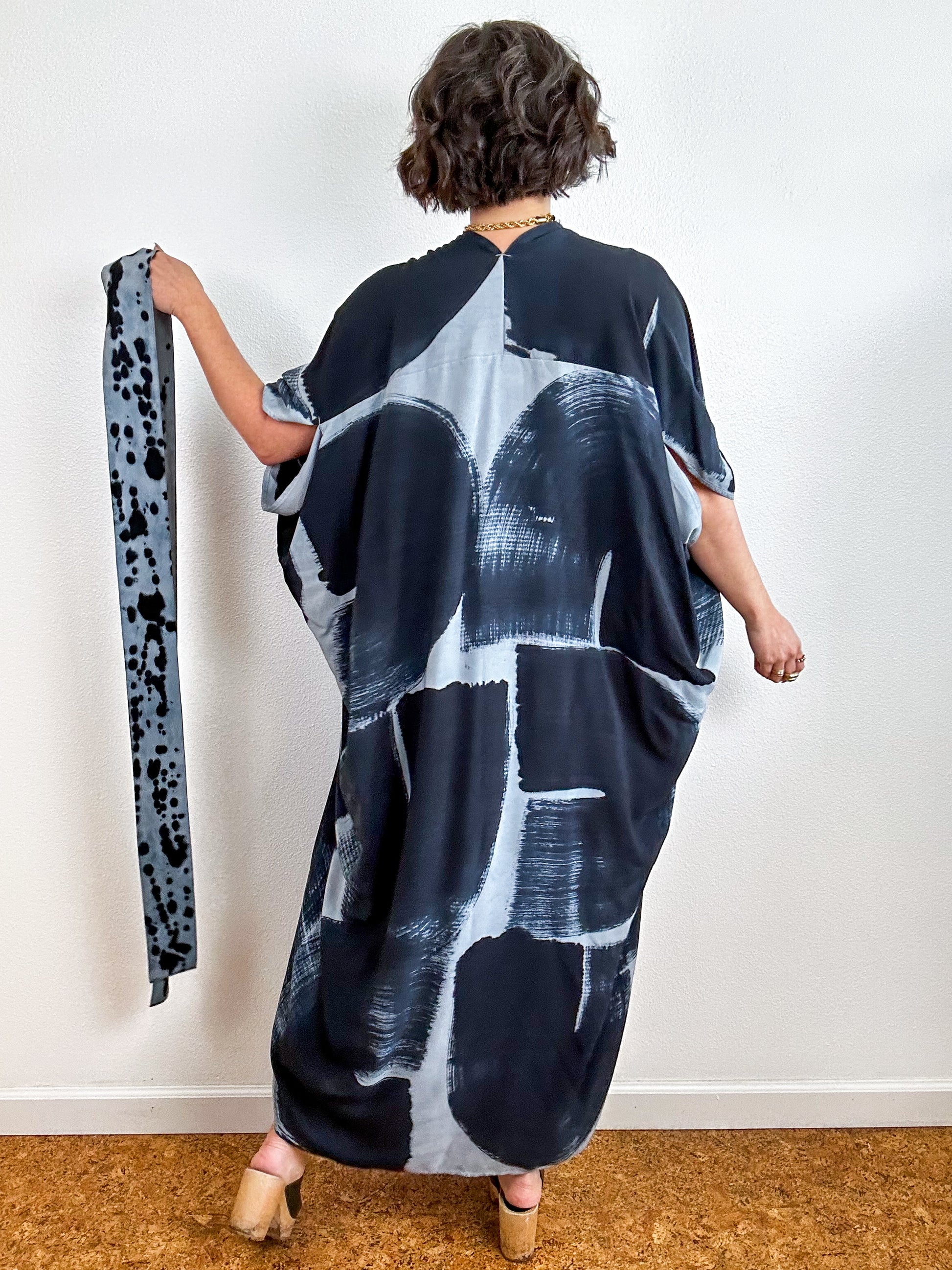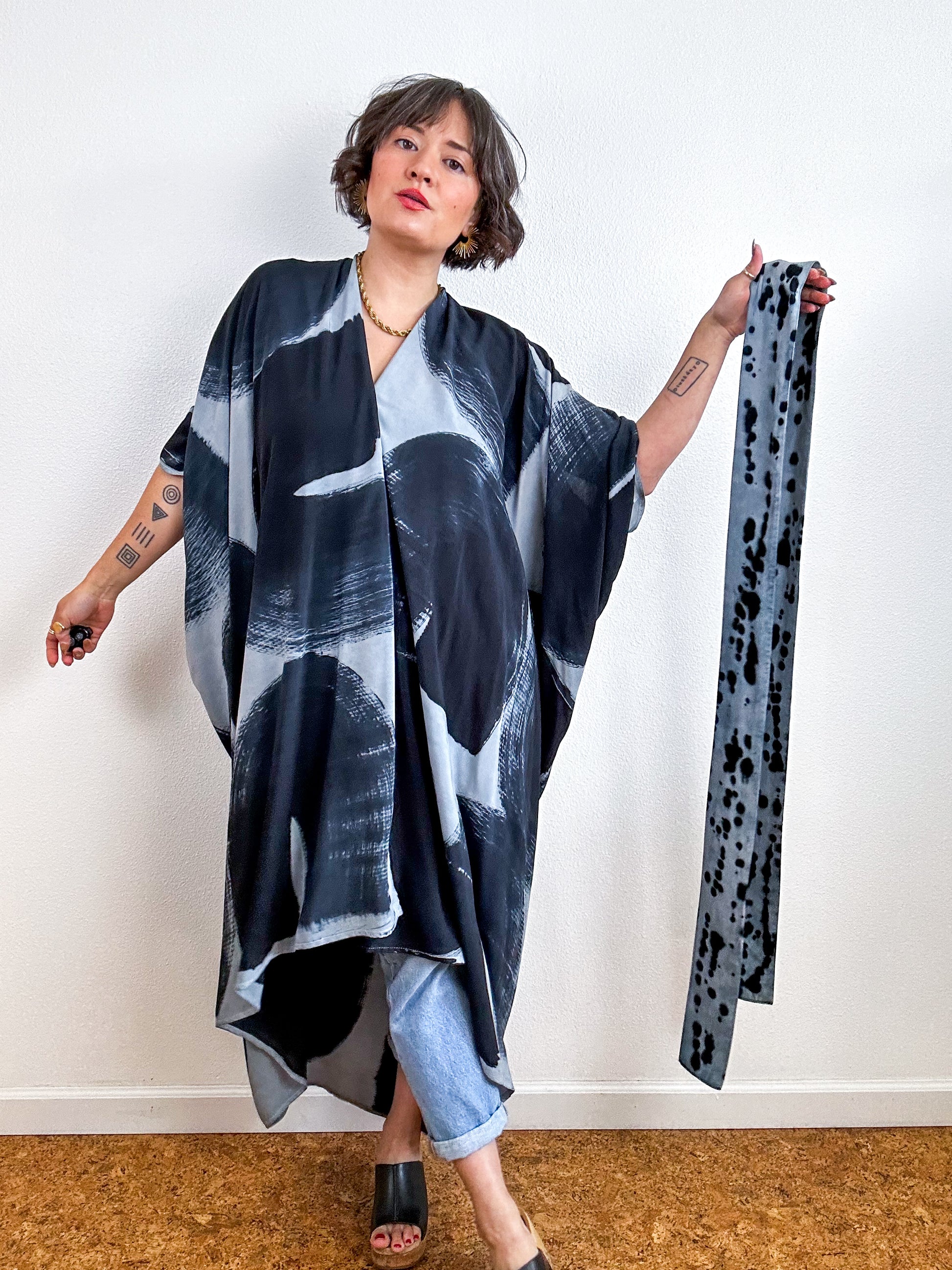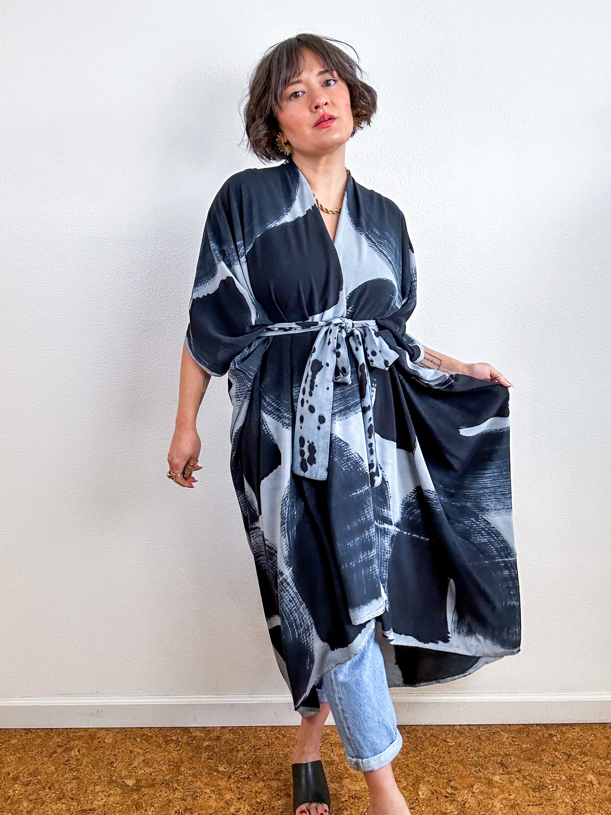 Soft and airy kimono with a flowing silhouette, tulip sleeve detail, curved high low hem and separate waist tie. Versatile shape can be styled as a wrap dress, an open kimono without the tie, or a robe for staying home. The minimalist design created from a full rectangle of fabric drapes beautifully over the shoulders and produces no material waste by utilizing one whole piece of fabric without scraps from corners and irregular cuts. Lightweight woven grey fabric is hand-dyed with black algae thickened dye using a gestural brushstroke technique.