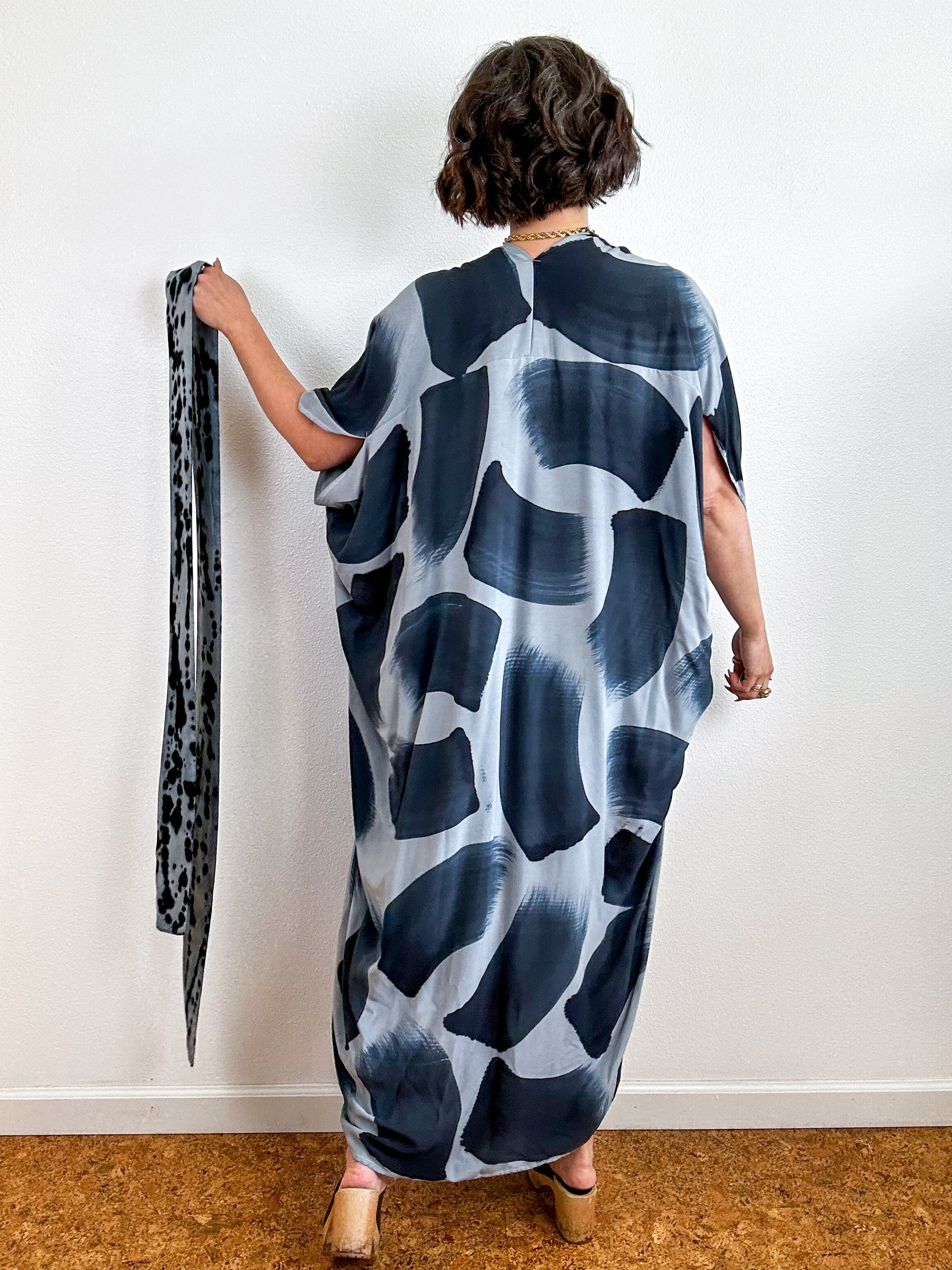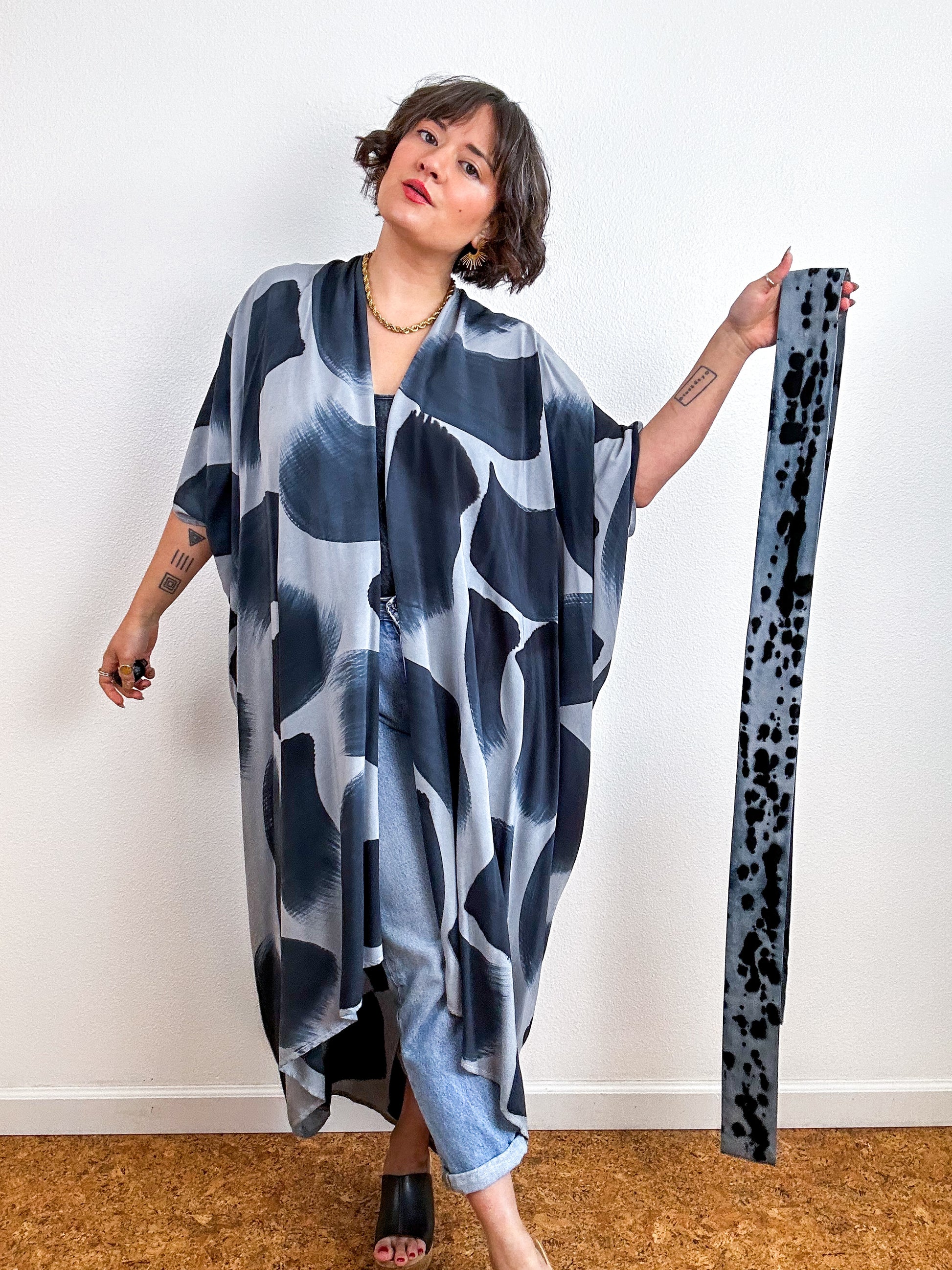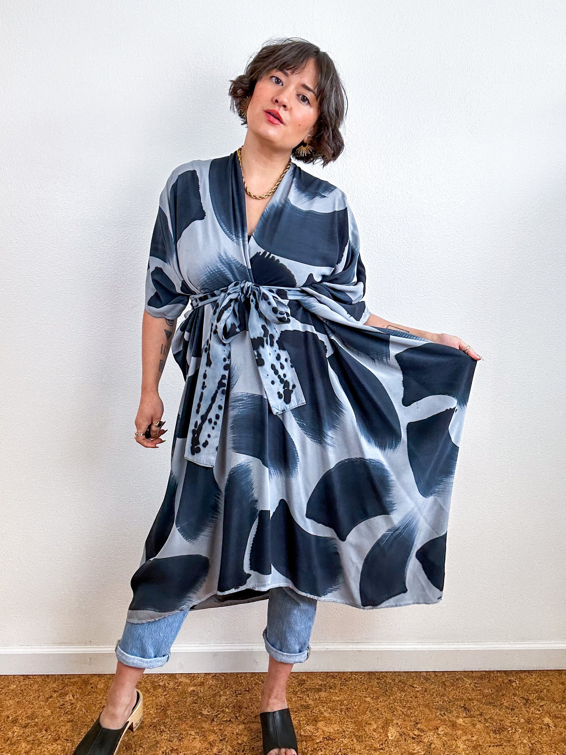 Soft and airy kimono with a flowing silhouette, tulip sleeve detail, curved high low hem and separate waist tie. Versatile shape can be styled as a wrap dress, an open kimono without the tie, or a robe for staying home. The minimalist design created from a full rectangle of fabric drapes beautifully over the shoulders and produces no material waste by utilizing one whole piece of fabric without scraps from corners and irregular cuts. Lightweight woven grey fabric is hand-dyed with black algae thickened dye using a gestural brushstroke technique.