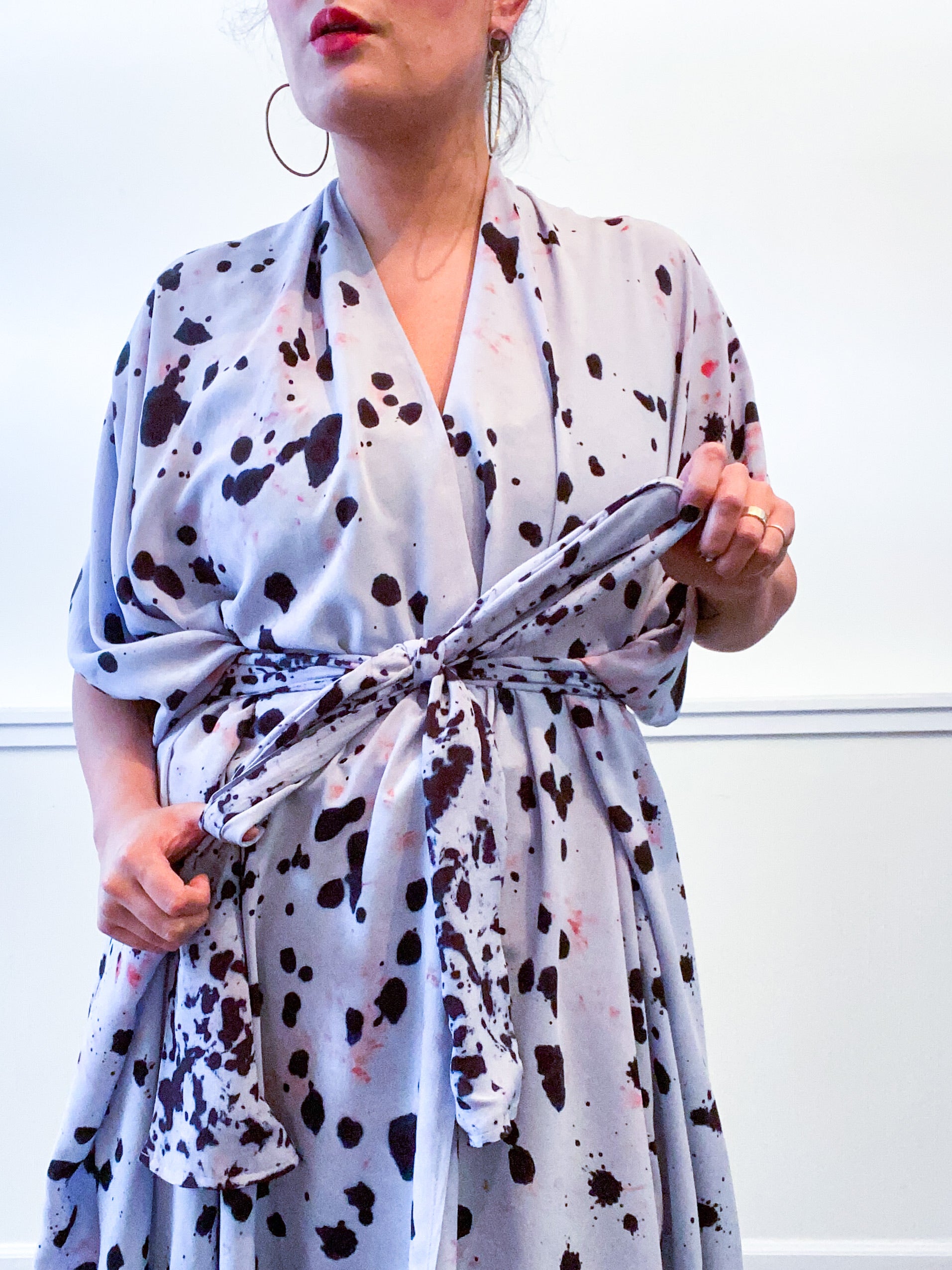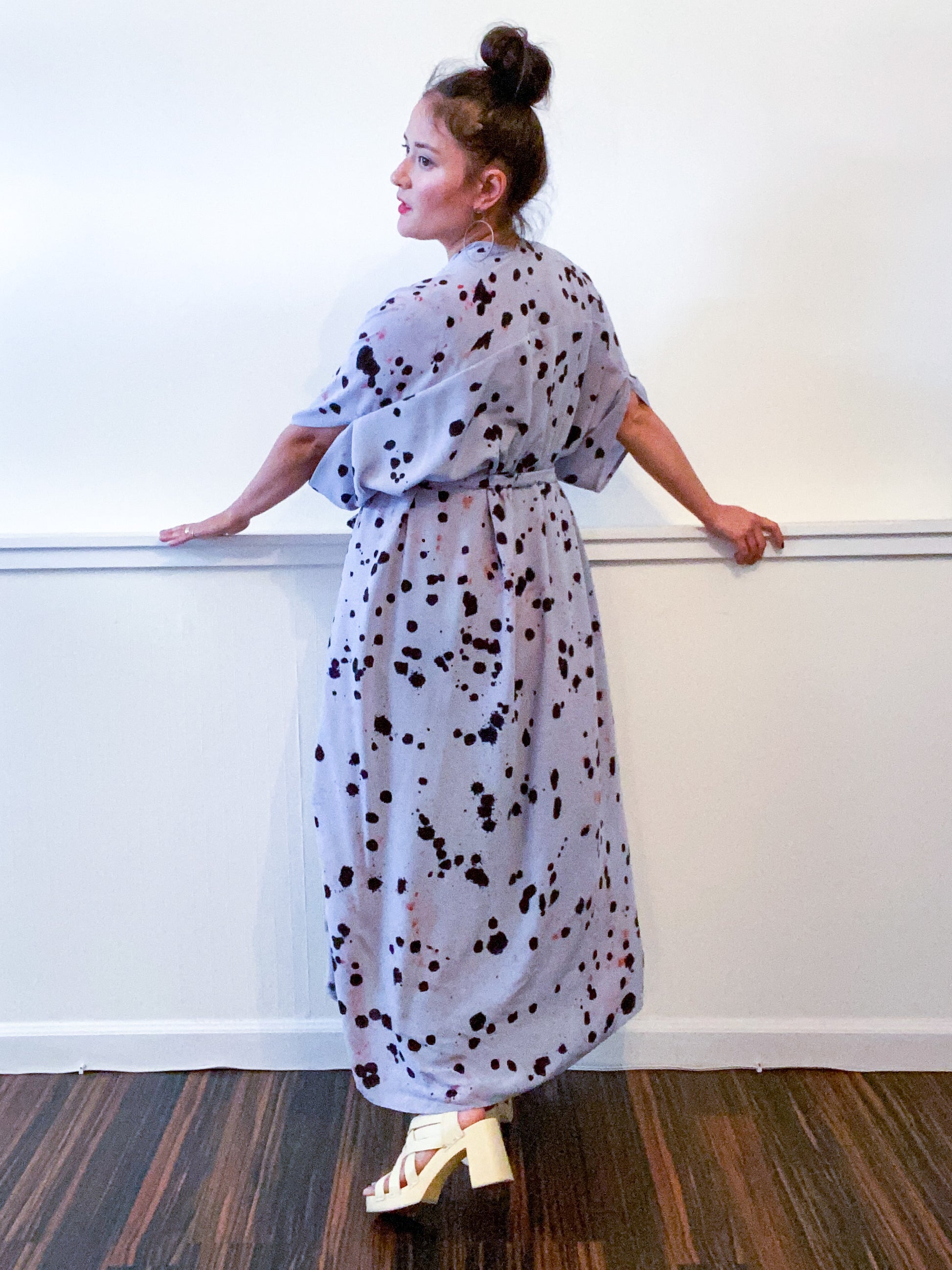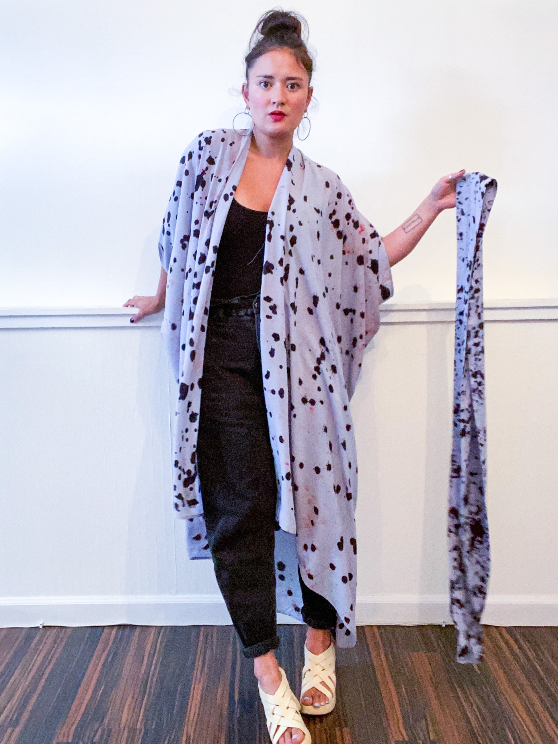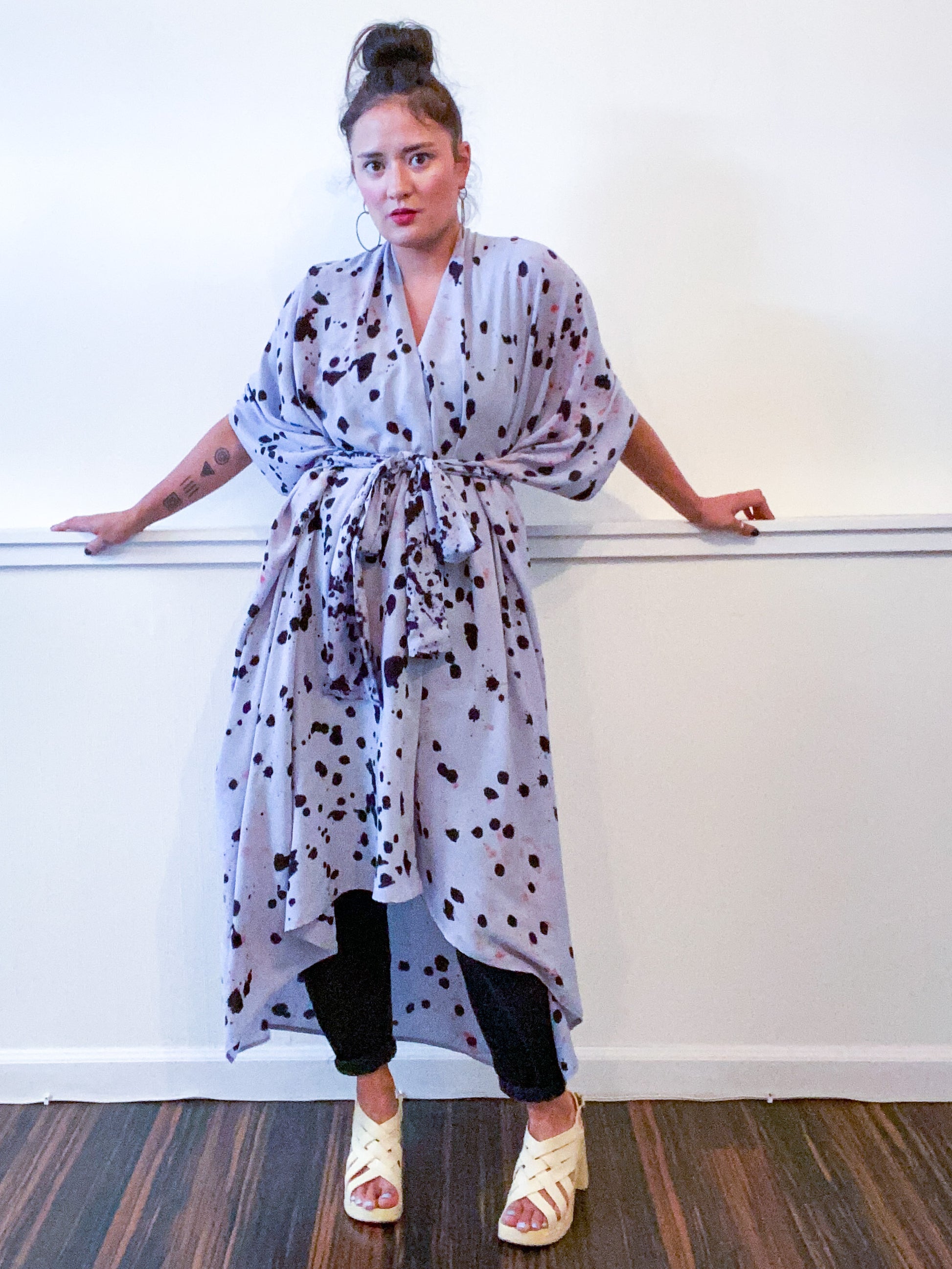 Soft and airy kimono with a flowing silhouette, fringed selvage sleeve detail, curved high low hem and optional waist tie. Versatile shape can be styled as a wrap dress, lightweight jacket over jeans, or an elegant robe over lingerie. The minimalist design created from a full rectangle of fabric drapes beautifully over the shoulders and produces no material waste by utilizing one whole piece of fabric without scraps from corners and irregular cuts. Lightweight grey woven fabric is hand-dyed with black drops and pink “shadows”.