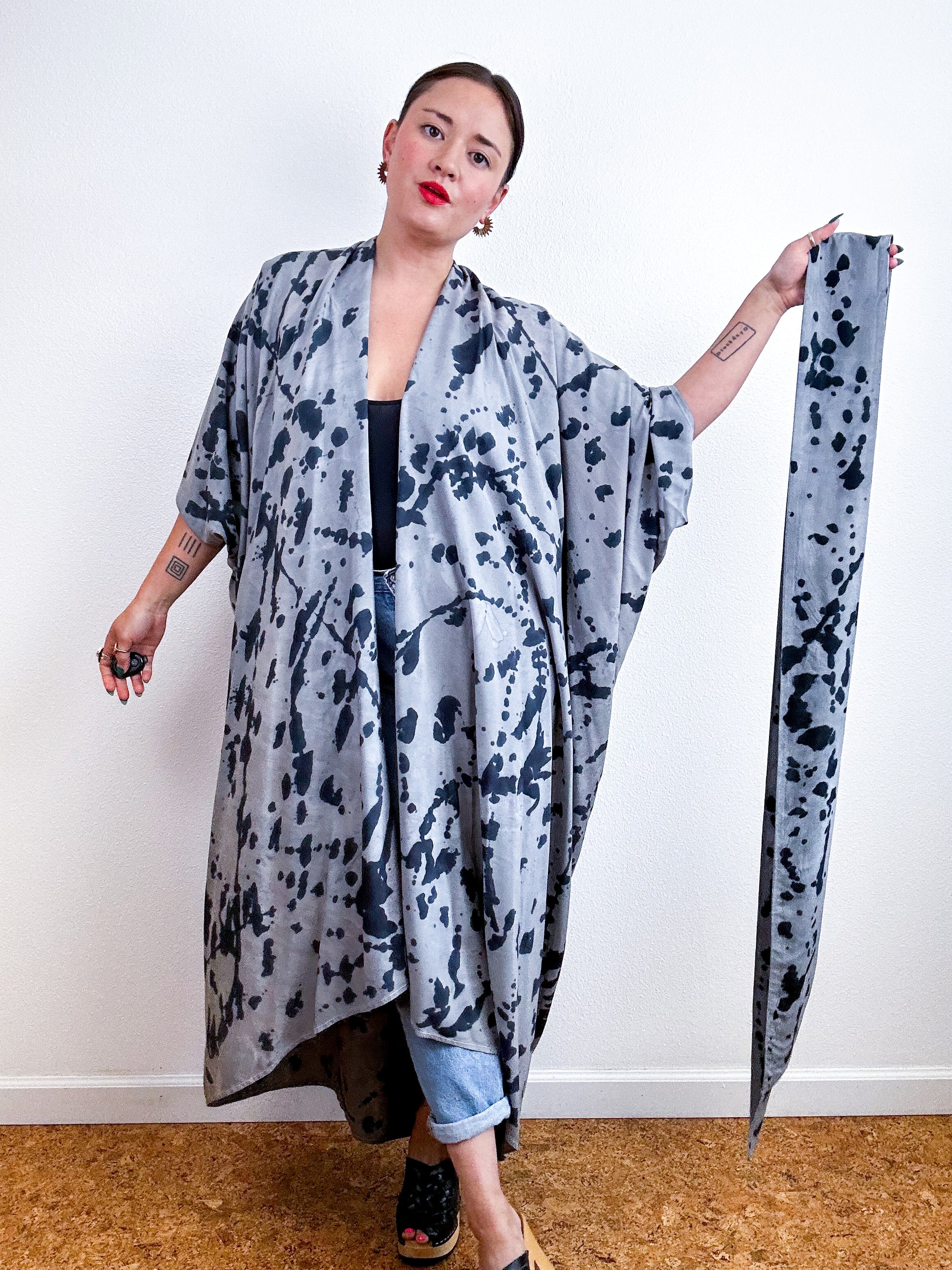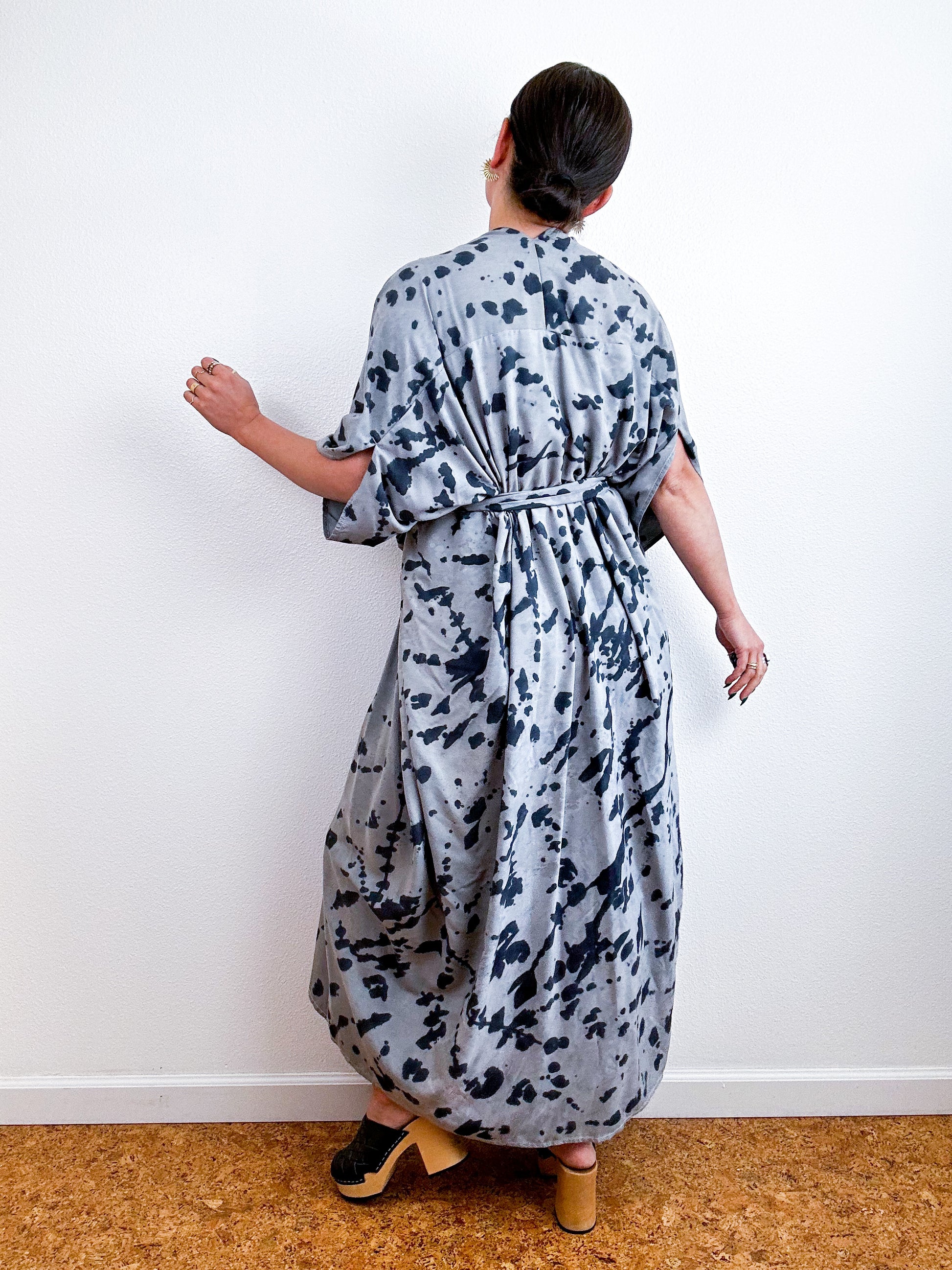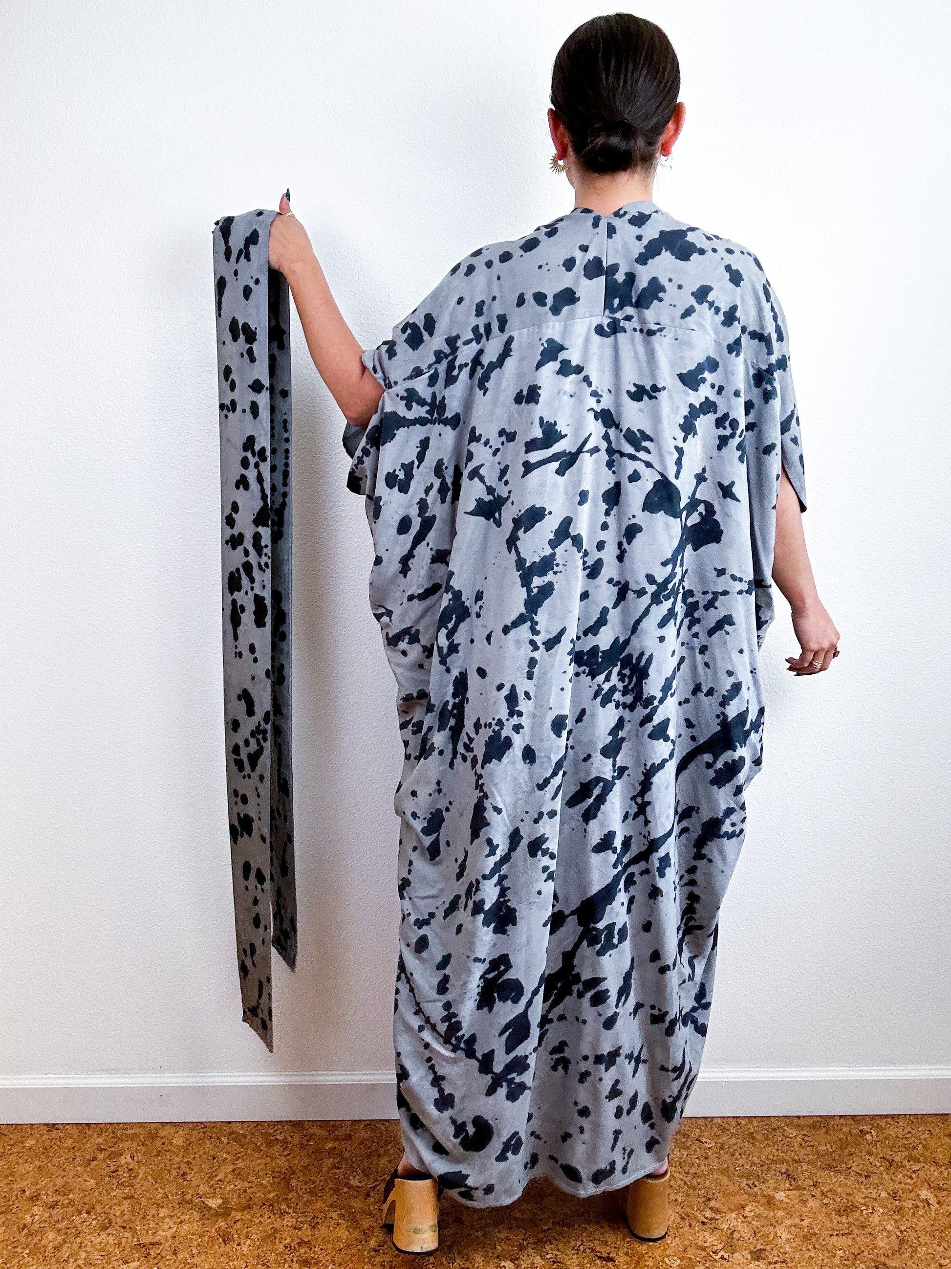 Soft and airy kimono with a flowing silhouette, tulip sleeve detail, curved high low hem and separate waist tie. Versatile shape can be styled as a wrap dress, an open kimono without the tie, or a robe for staying home. The minimalist design created from a full rectangle of fabric drapes beautifully over the shoulders and produces no material waste by utilizing one whole piece of fabric without scraps from corners and irregular cuts. Lightweight woven grey fabric dyed with black gestural splatter technique.