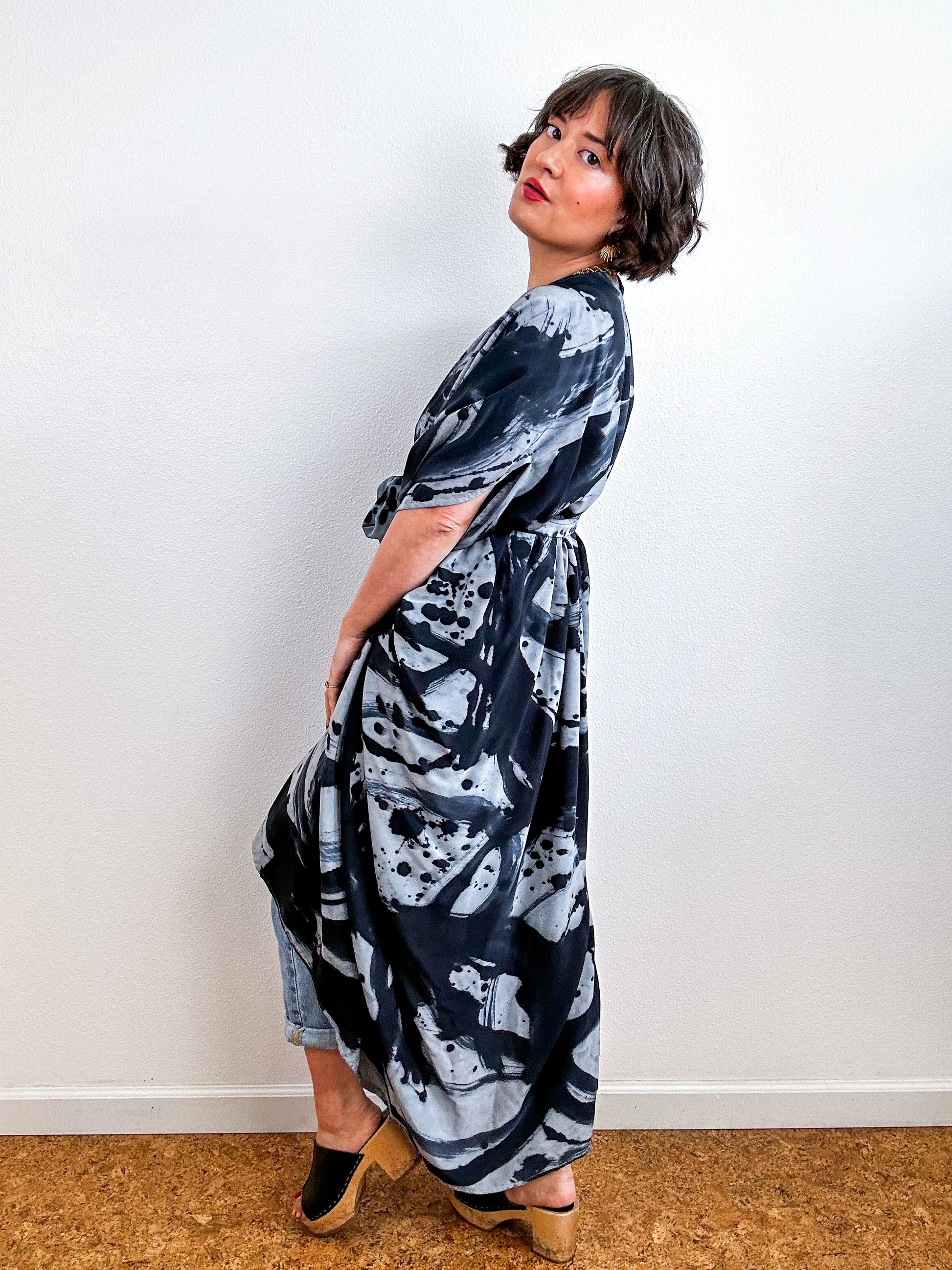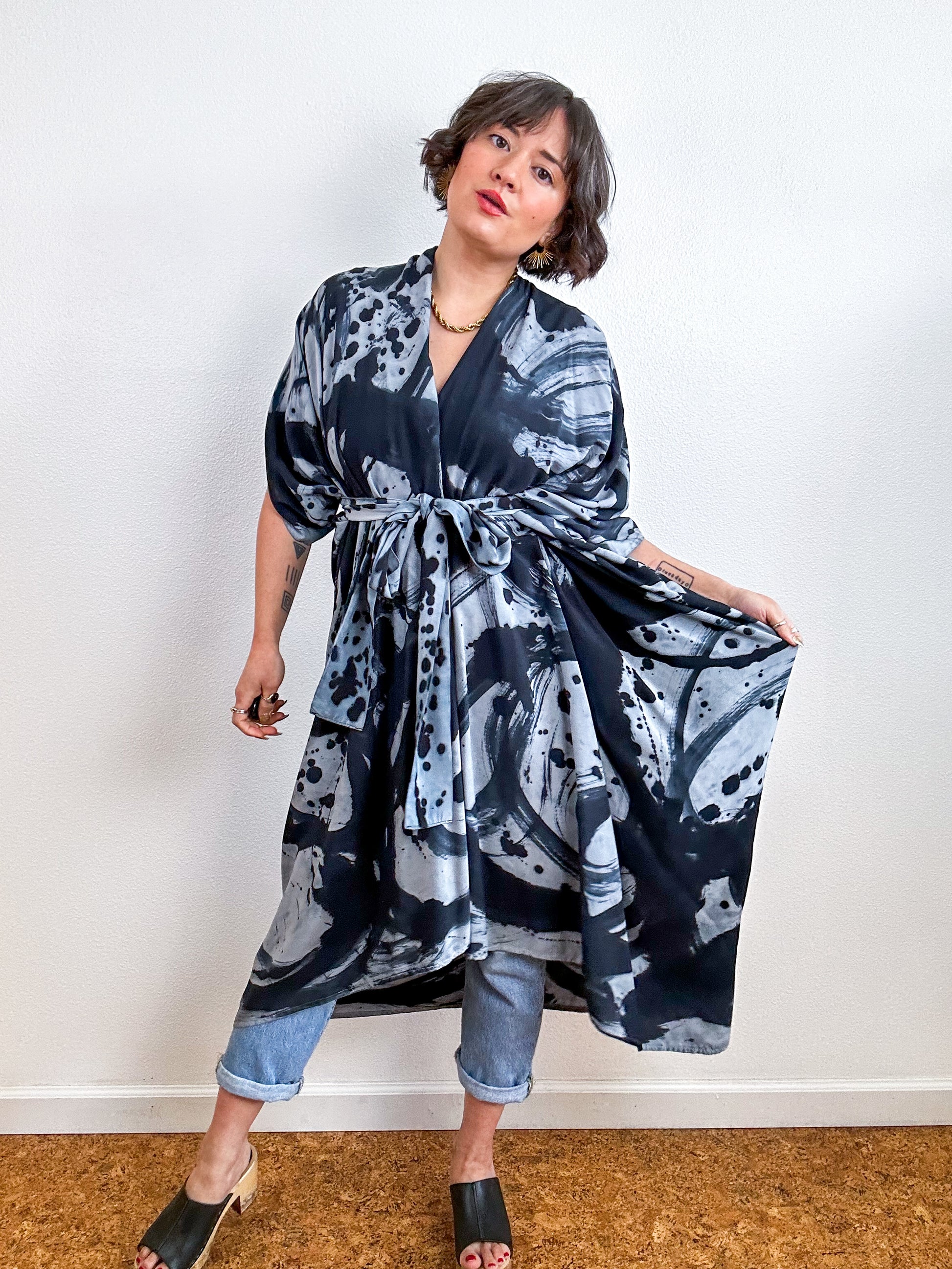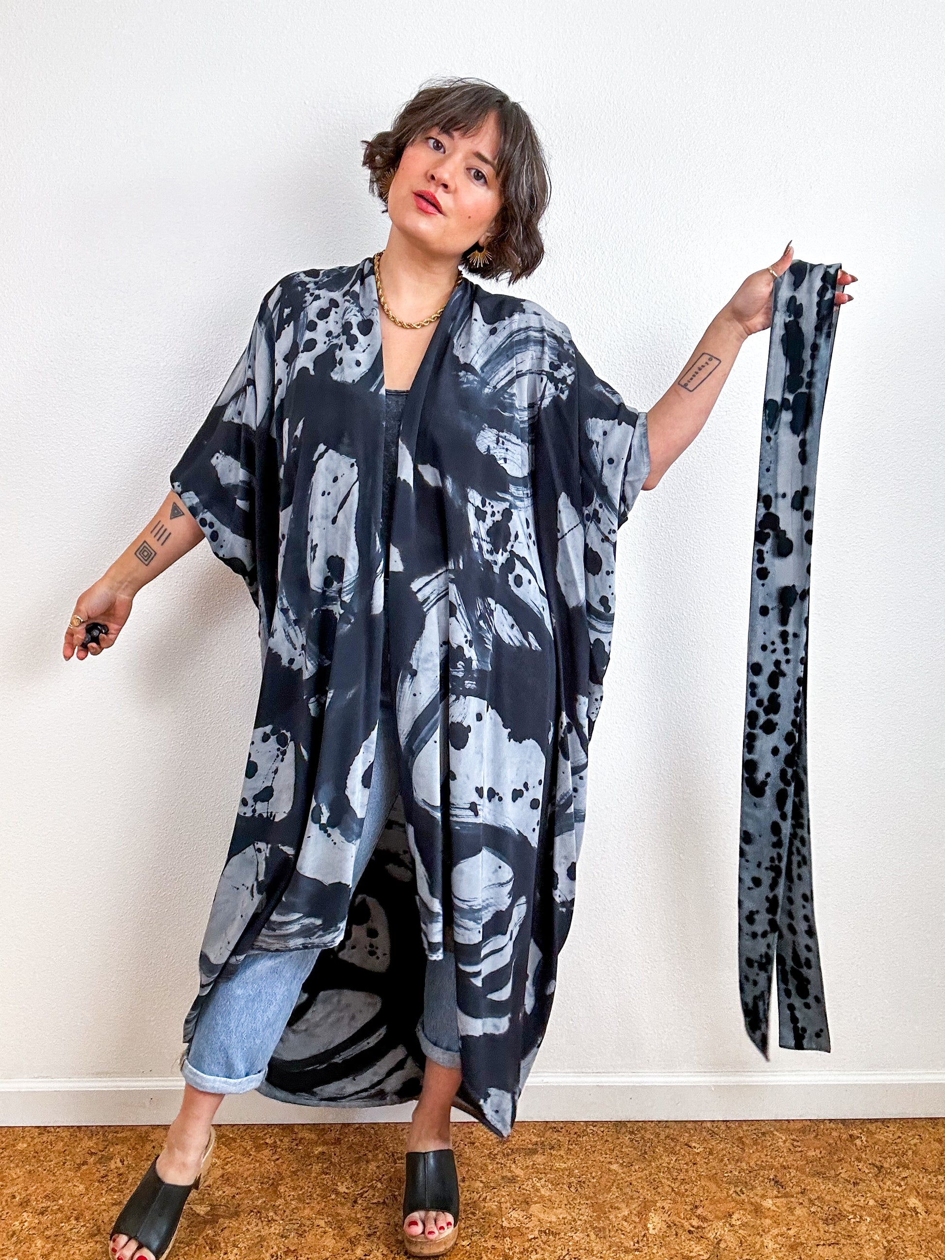Soft and airy kimono with a flowing silhouette, tulip sleeve detail, curved high low hem and separate waist tie. Versatile shape can be styled as a wrap dress, an open kimono without the tie, or a robe for staying home. The minimalist design created from a full rectangle of fabric drapes beautifully over the shoulders and produces no material waste by utilizing one whole piece of fabric without scraps from corners and irregular cuts. Lightweight woven grey fabric is hand-dyed with black algae thickened dye using a gestural brushstroke technique.